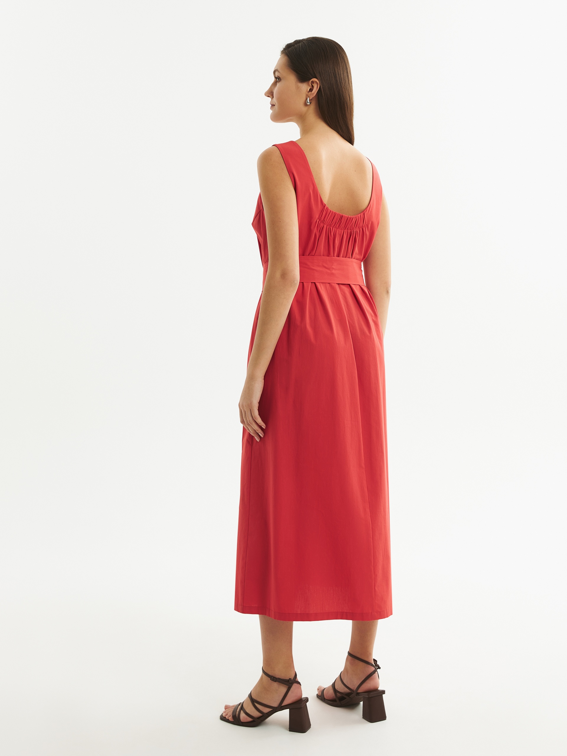 Платье прямого силуэта из хлопковой ткани с круглым вырезом спереди и более глубоким, собранным на резинку, круглым вырезом сзади. Для придания завершенного образа имеет пояс из основной ткани.