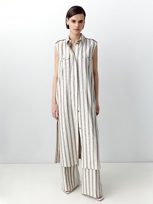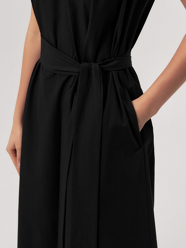 Платье прямого силуэта из хлопковой ткани с круглым вырезом спереди и более глубоким, собранным на резинку, круглым вырезом сзади. Для придания завершенного образа имеет пояс из основной ткани.