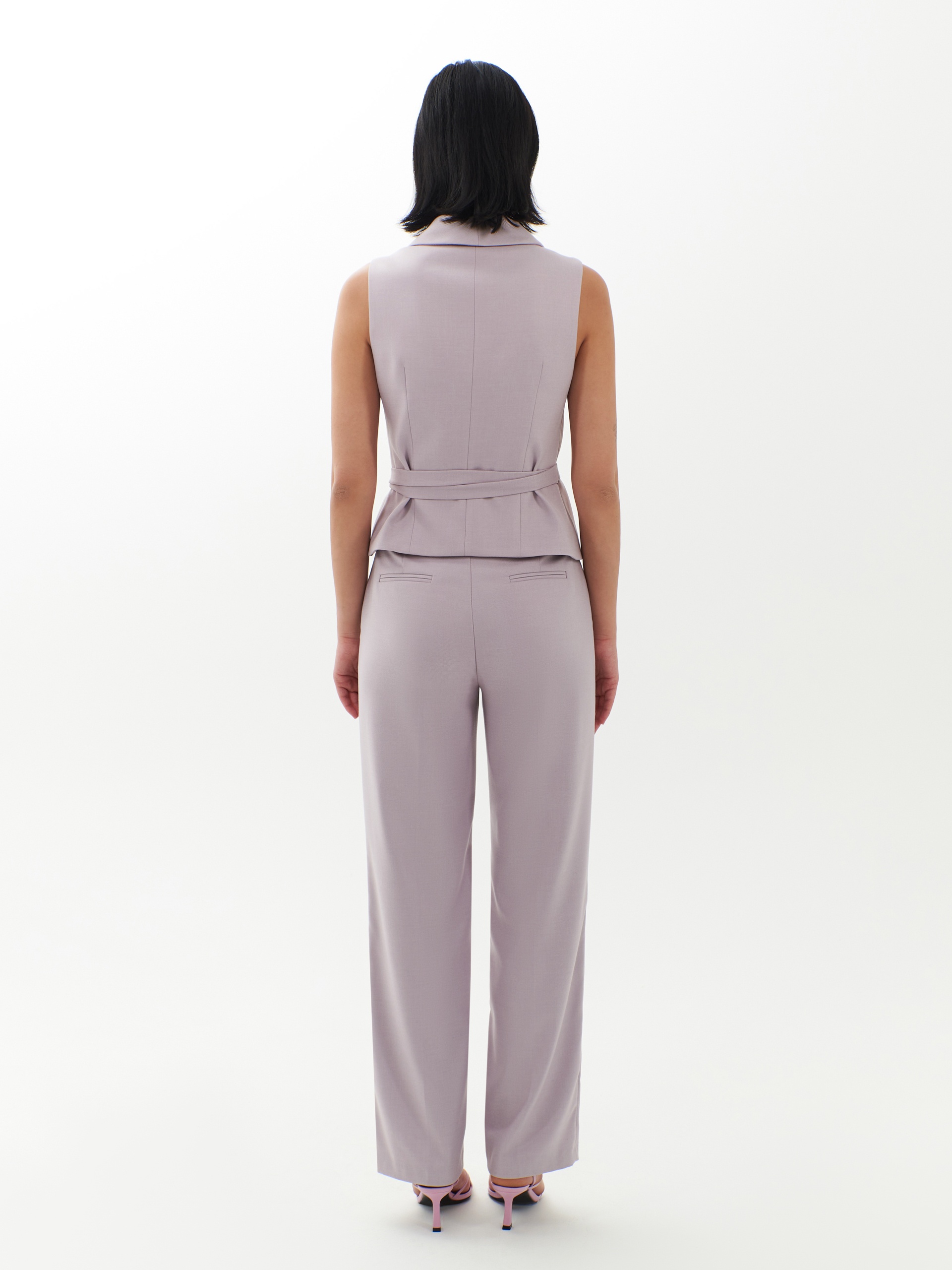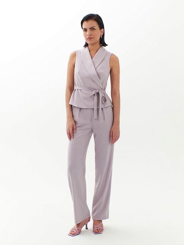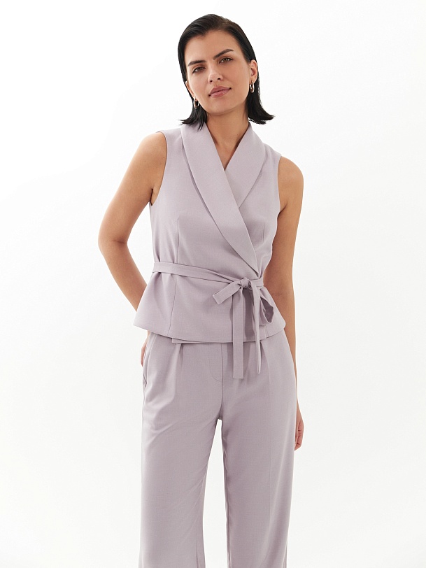 Жилет полуприлегающего силуэта из костюмной ткани в трендовом цвете "перванш", жилет на запах с длинными завязками из основной ткани. Воротник шалька подчеркнет мягкость линий. Жилет на подкладке.