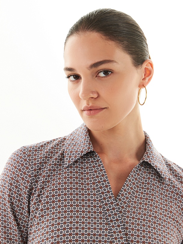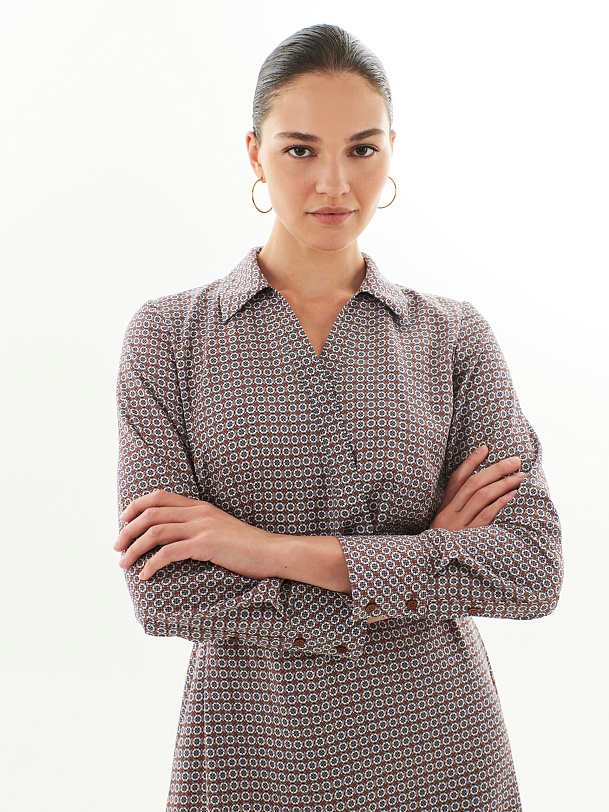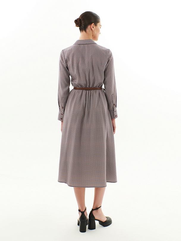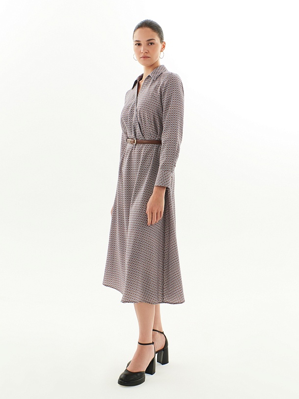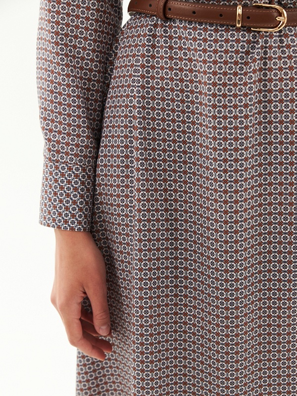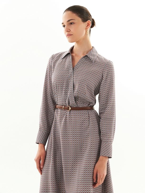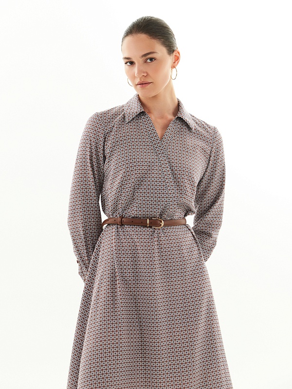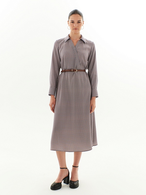 Модель платья в стиле smart casual отличается приталенным силуэтом и рубашечным воротником, переходящим в изящный полузапах. Созданное из тенселя – легкого, гипоаллергенного материала, это платье идеально подойдет для чувствительной кожи. Воздушная, струящаяся текстура ткани мягко подчеркнет каждое движение, а галстучный принт с геометрическим узором органично впишется в летний гардероб. Входящий в комплект тонкий ремень из экокожи подчеркнет талию. Сборка на резинку по спинке изделия обеспечит комфортную посадку.