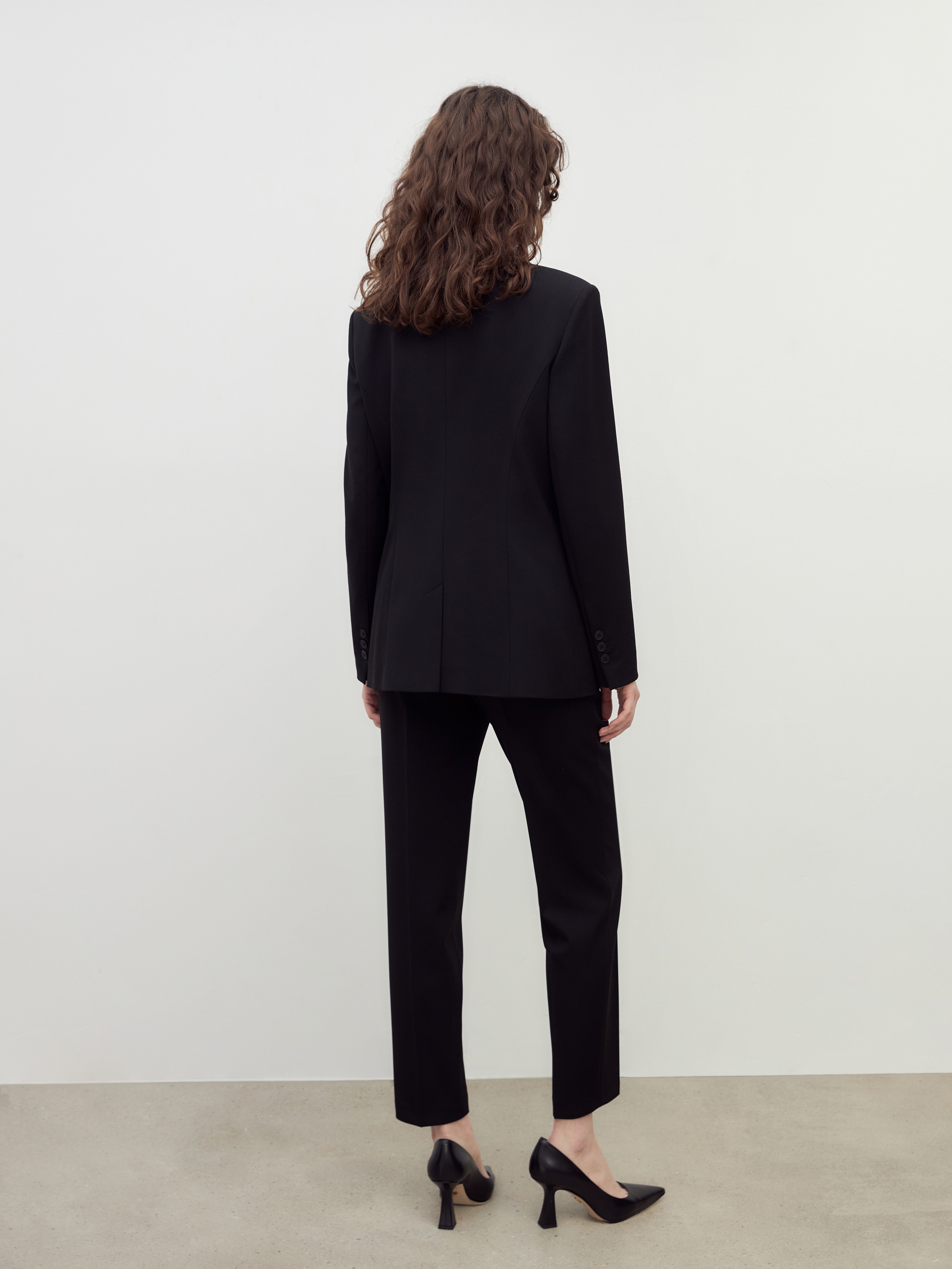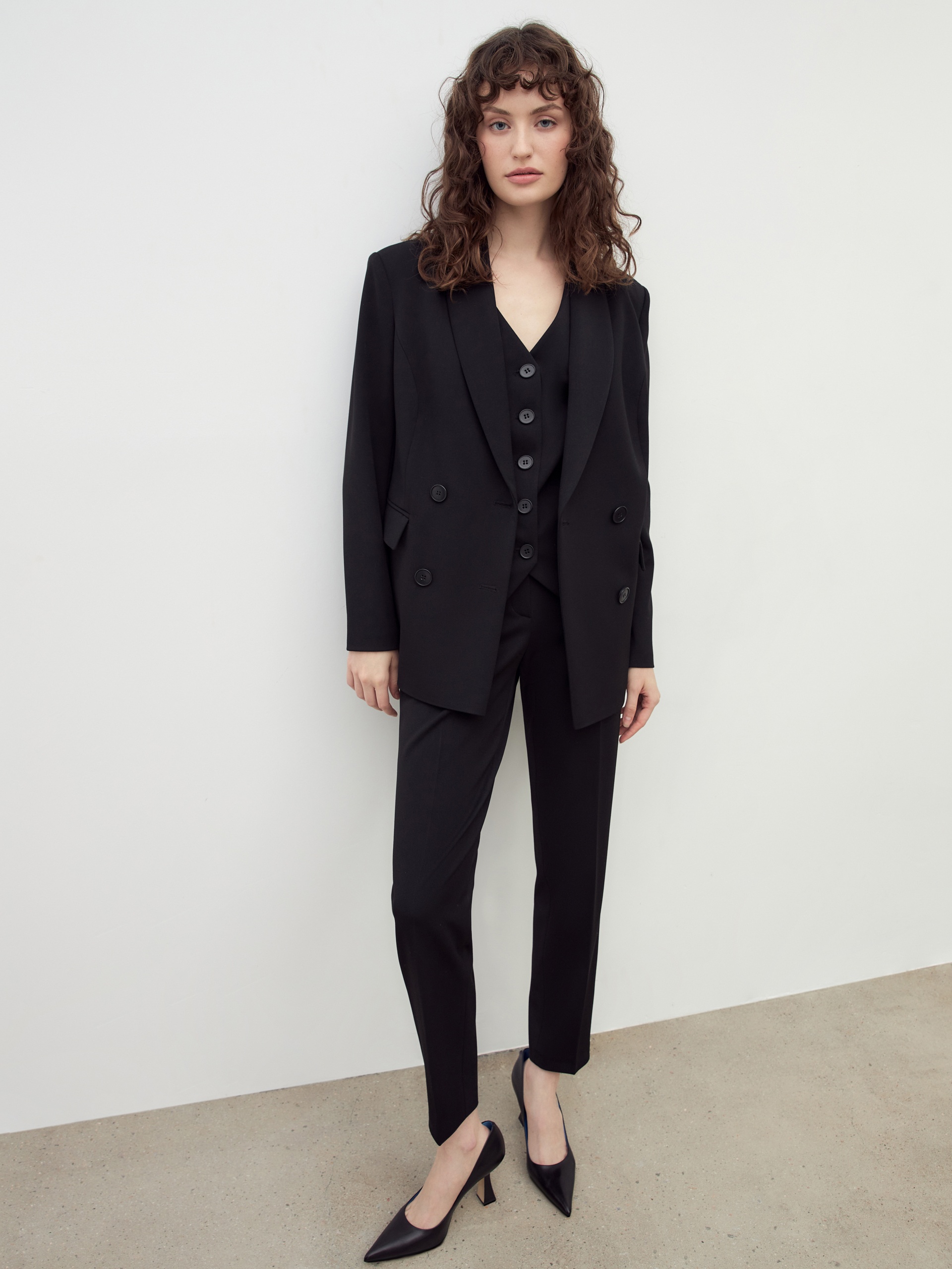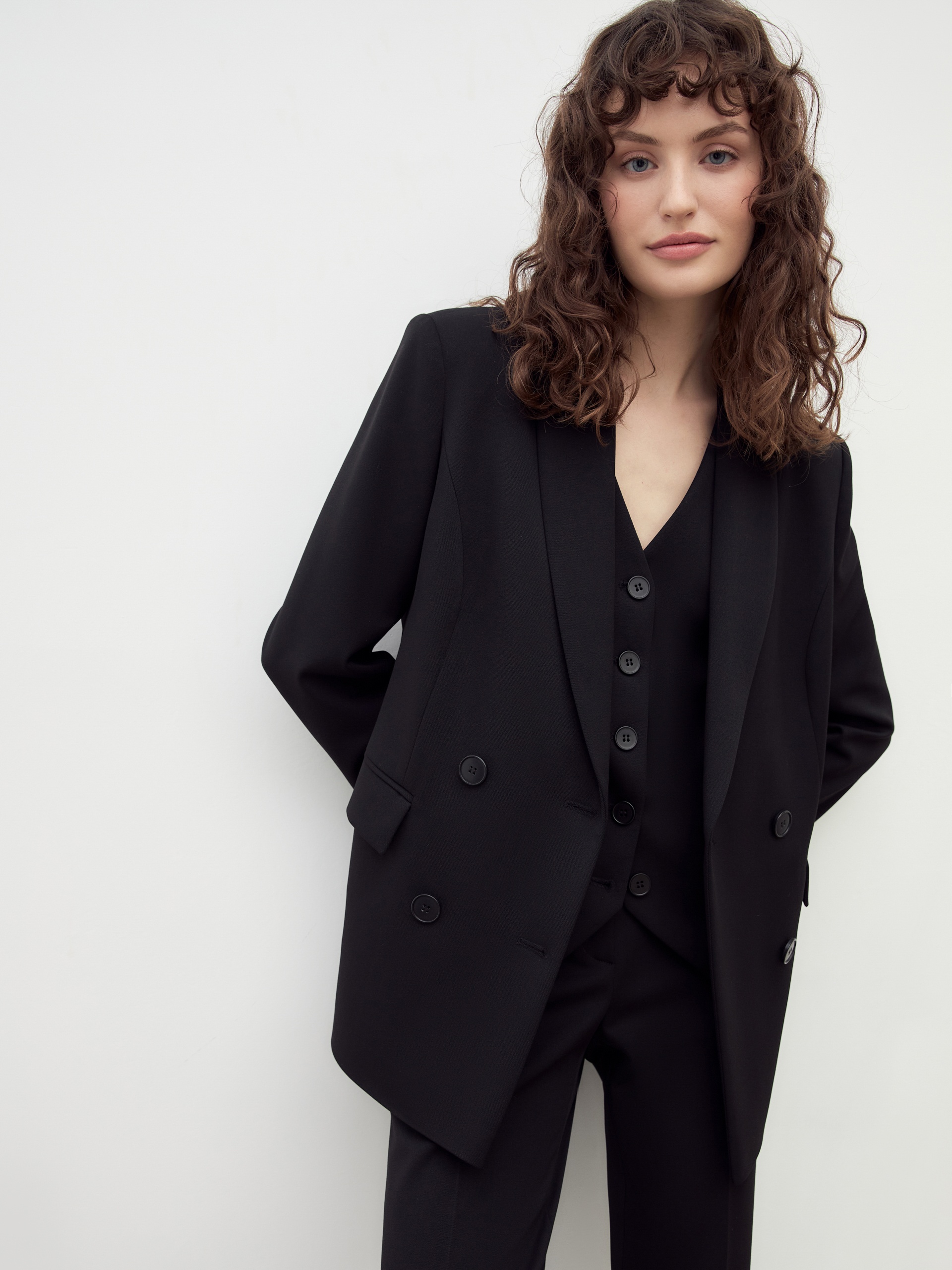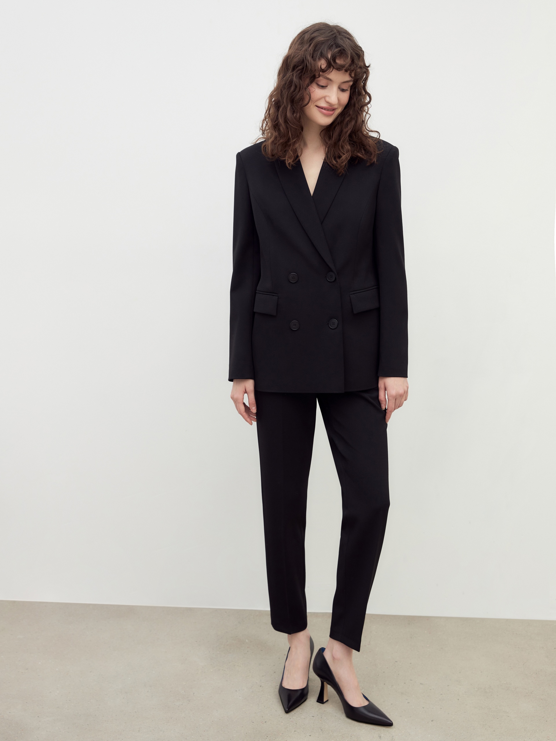 Классический двубортный полуприлегающий жакет с V-образным вырезом горловины, воротником-шаль. Выполнен из костюмной ткани в черном цвете. На жакете прорезные карманы в рамку. Жакет на подкладке.