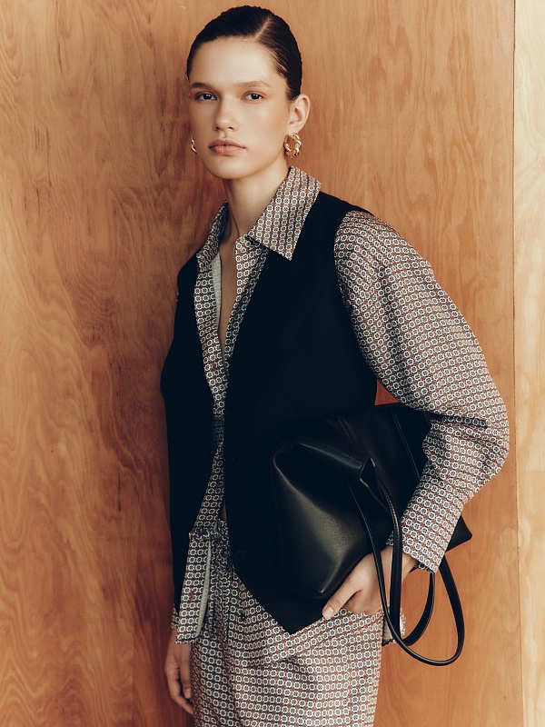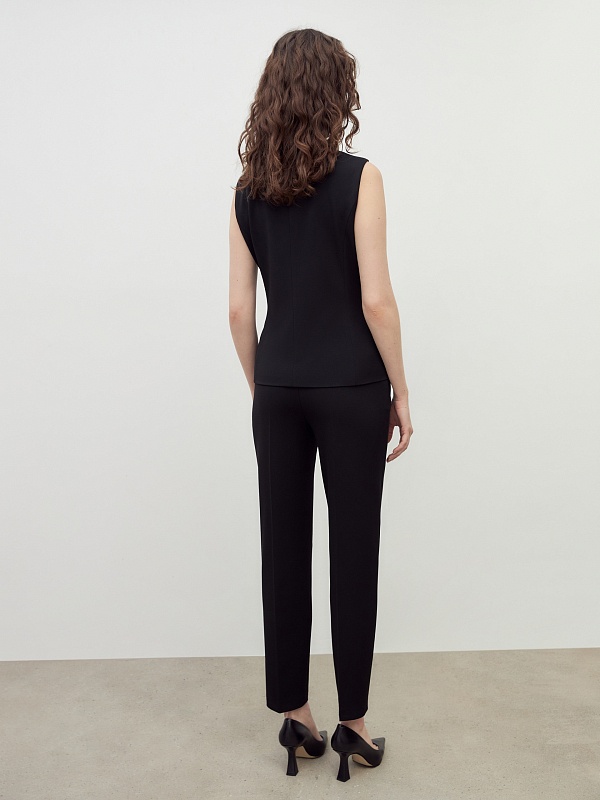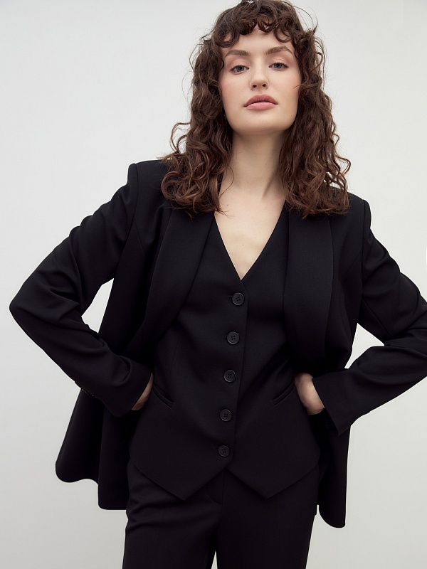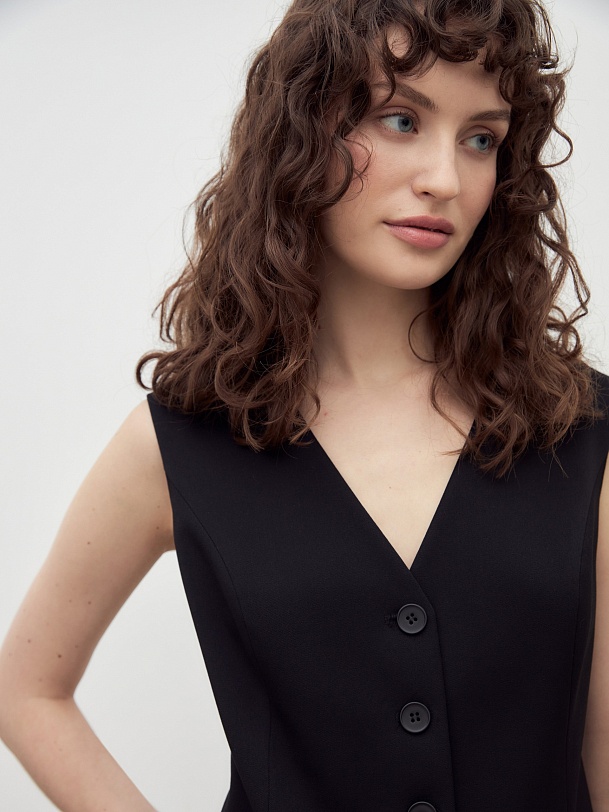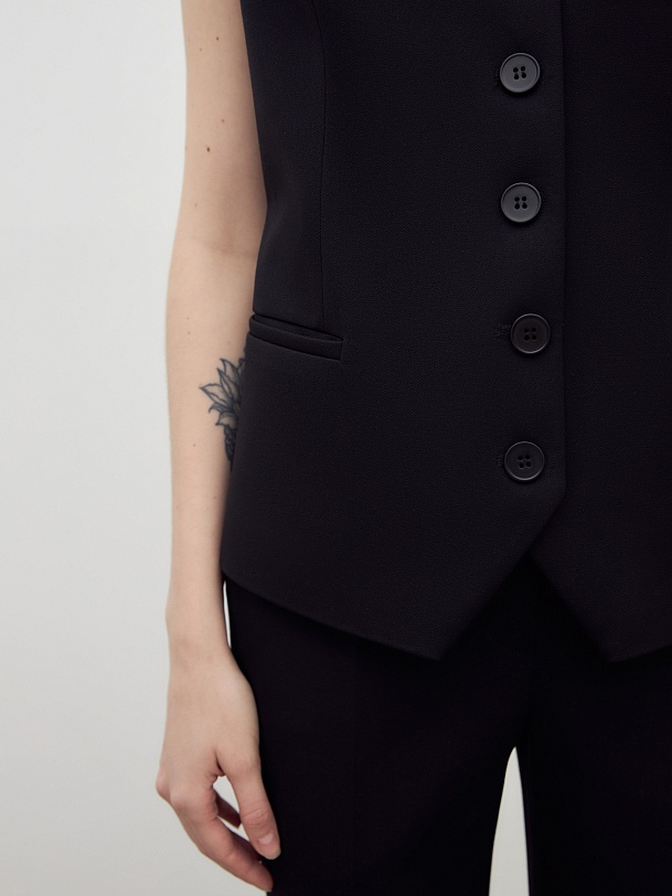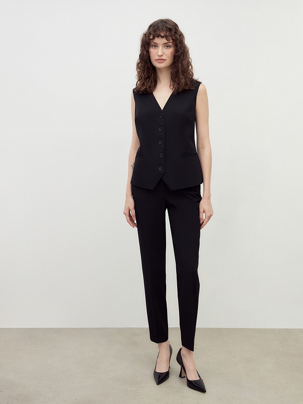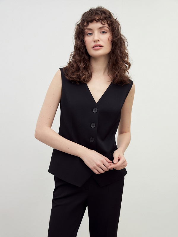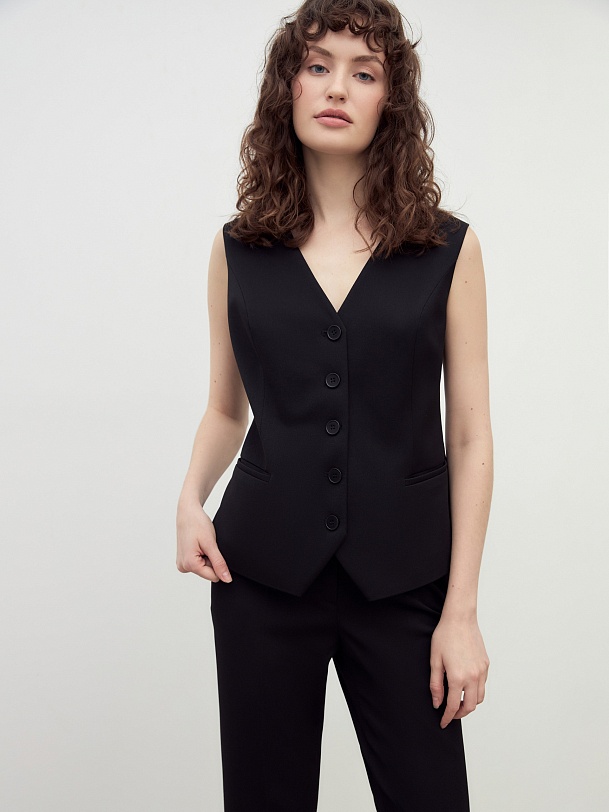 Жилет на подкладке полуприлегающего силуэта из костюмной ткани черного цвета с V-образным вырезом и застежкой на пуговицы. Модель идеально сочетается с брюками и жакетом из этой же ткани.