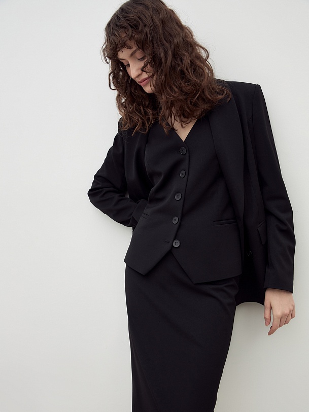 Юбка на притачном поясе полуприлегающего силуэта из костюмной ткани в черном цвете, очень элегантной длины, прикрывающей колено. Застежка сзади на потайную молнию.