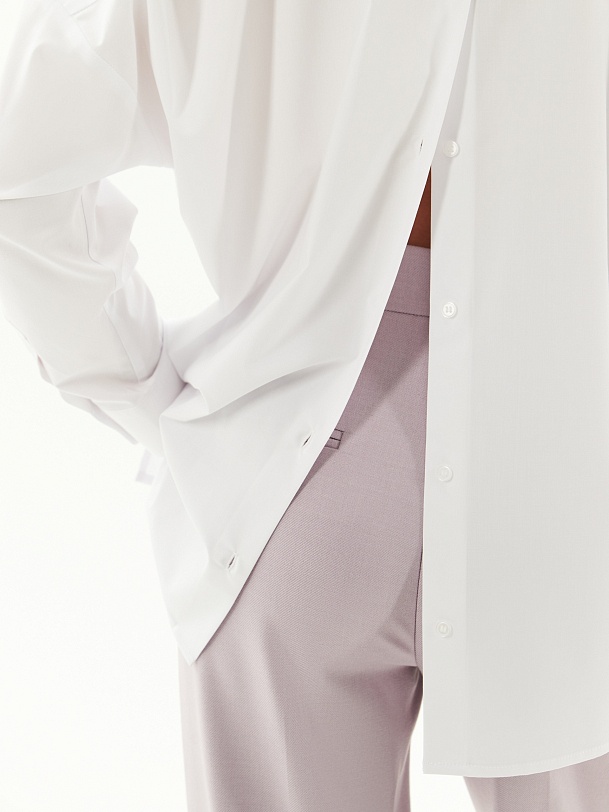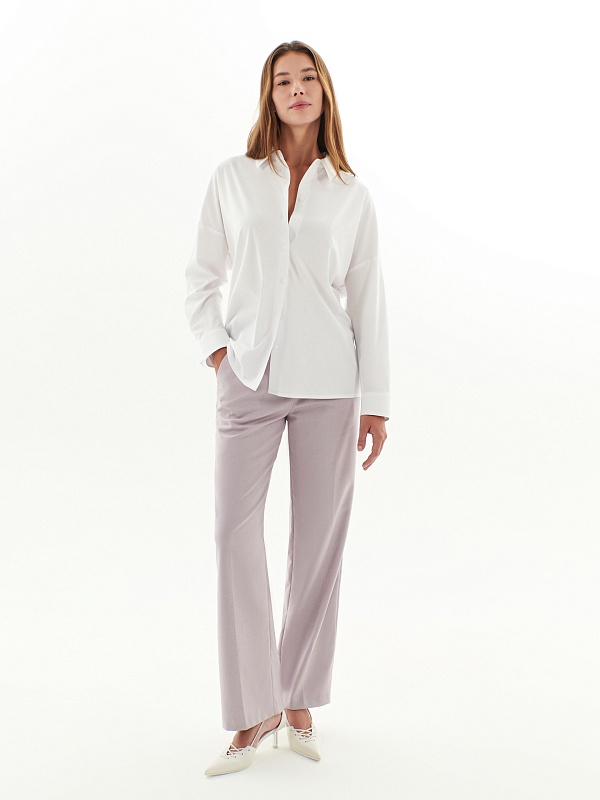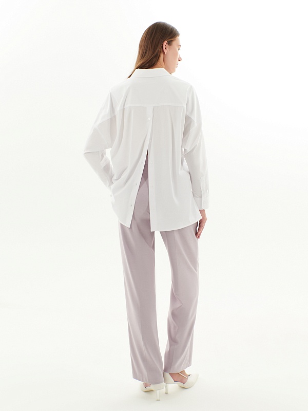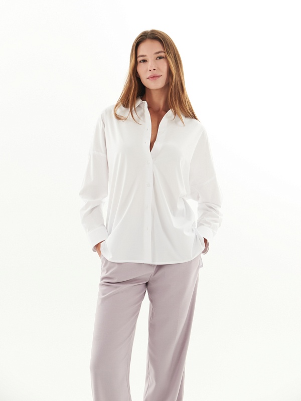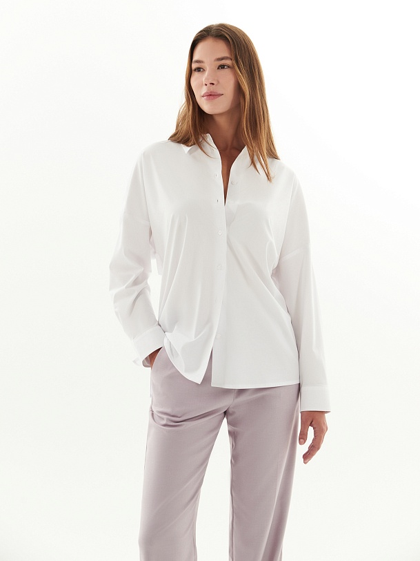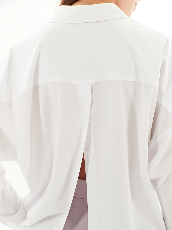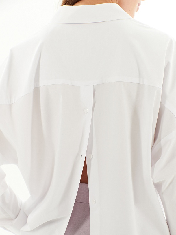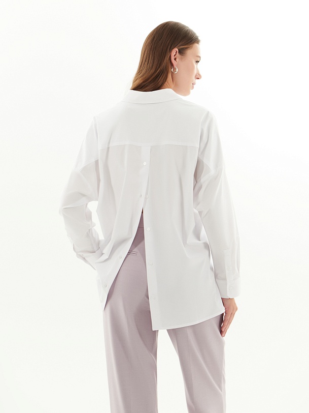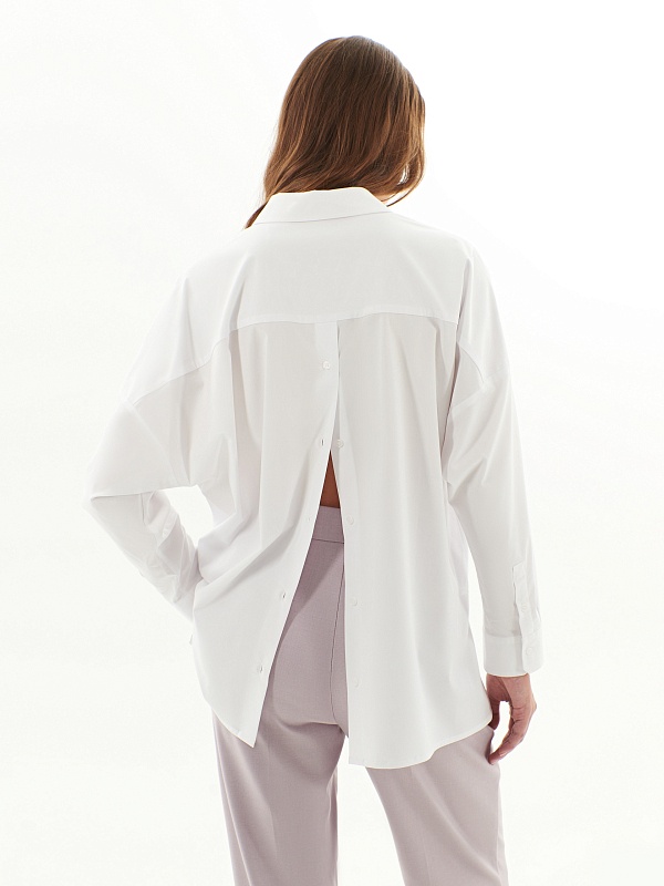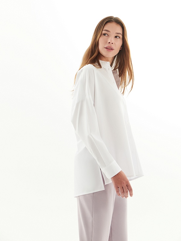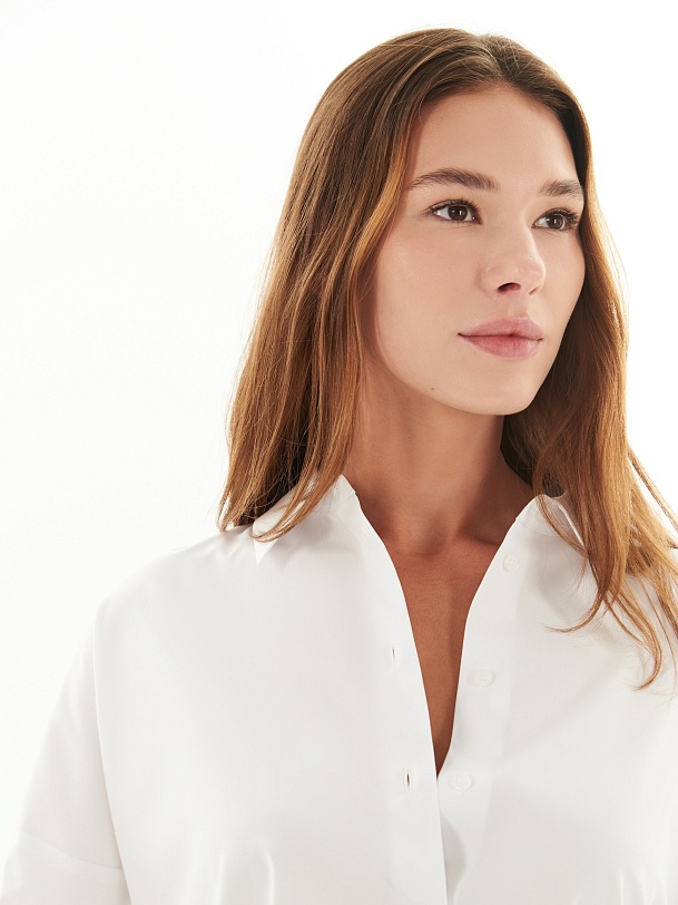 Свободная блуза из хлопковой ткани белого цвета. Блуза с классическим отложным воротником на пуговицах. Рукава широкие с манжетами. На спинке кокетка и планка с пуговицами. Низ блузы прямой с разрезами.