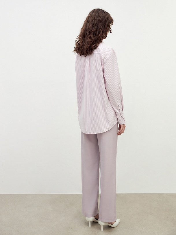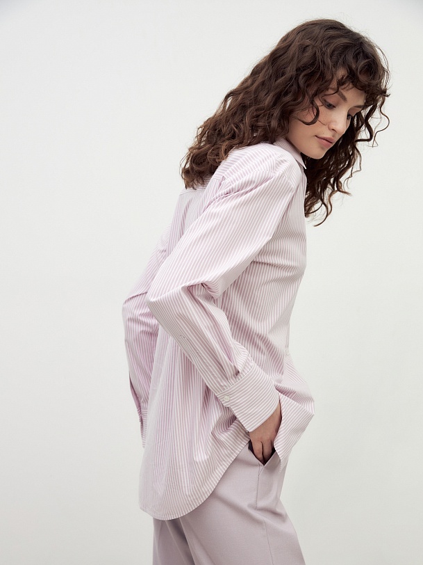 Прямая удлиненная блуза из хлопковой ткани в тонкую лиловую полоску с классическим отложным воротником. Рубашечный широкий рукав на узком манжете с фигурным срезом манжета. Спинка удлиненная, с кокеткой и складкой.