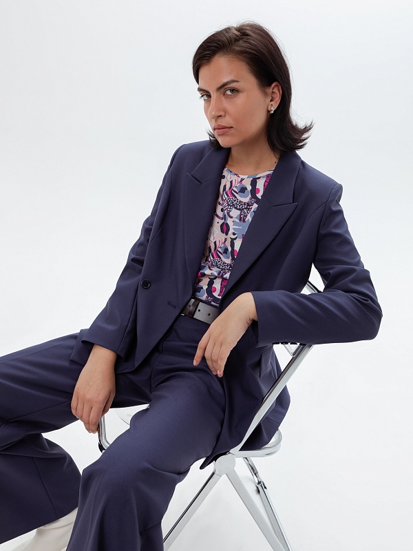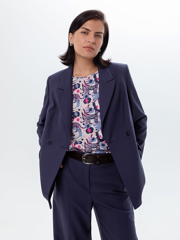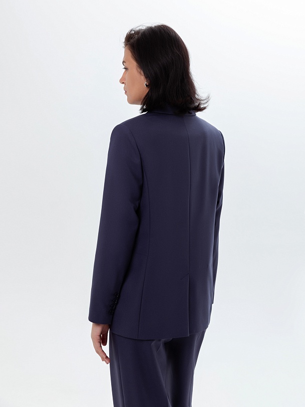 Классический удлиненный прямой двубортный жакет из костюмной вискозной ткани в блогородном темно-синем цвете на двух пуговицах. Жакет полностью на подкладке, имеет прорезные карманы. Хорошо сочетается с брюками и юбками. Рукава полной длины. Стиль smart casual.