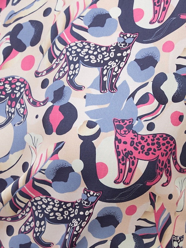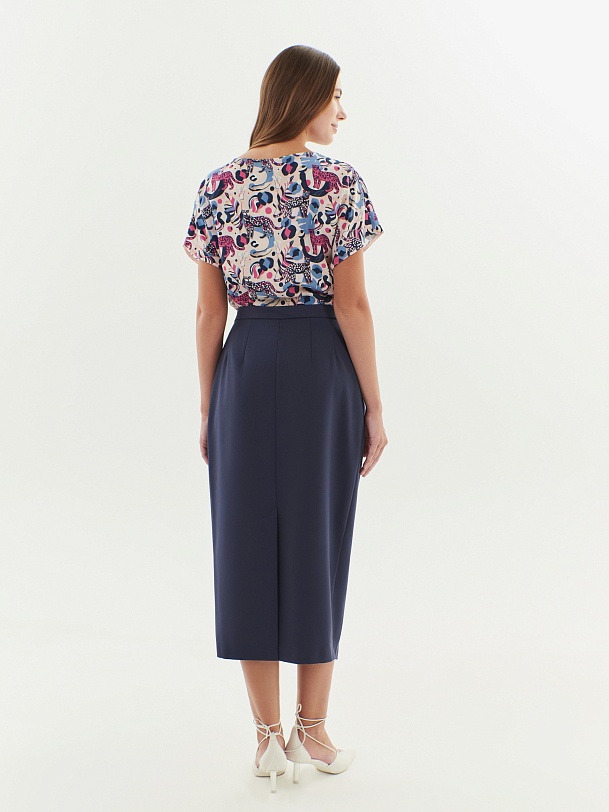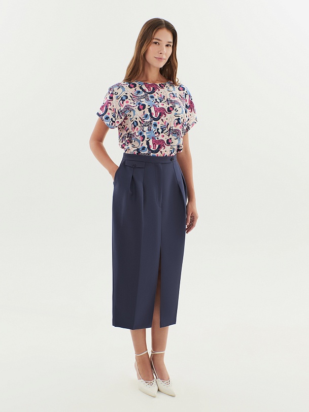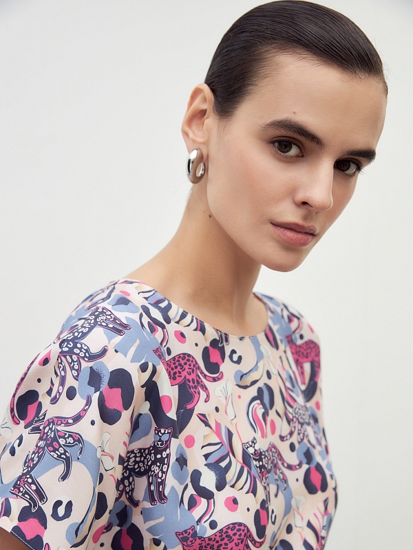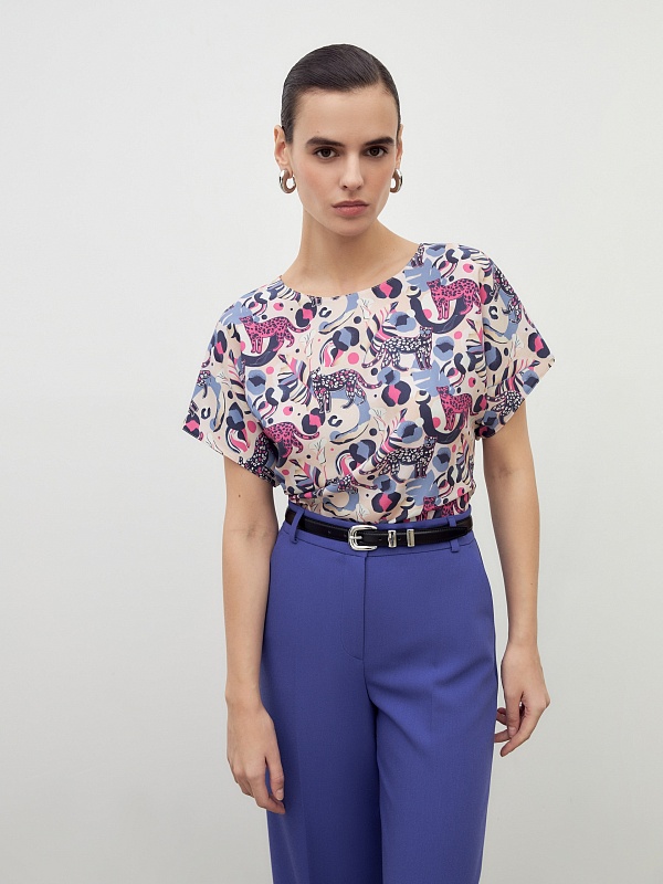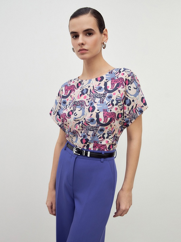 Классическая блуза прямого силуэта с круглой горловиной и спущенной линией плеча. Блуза выполнена из натуральной ткани в ярком принте.
