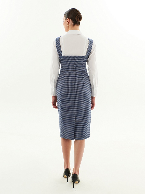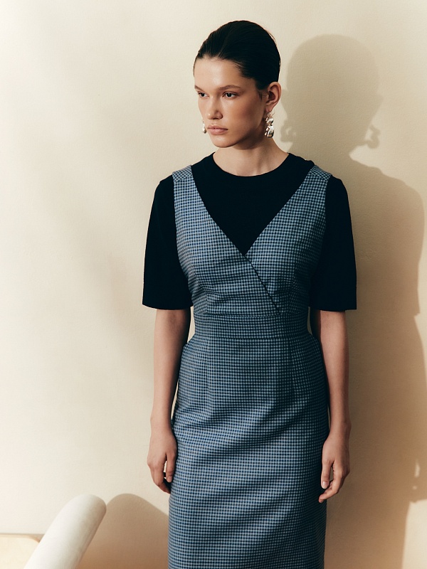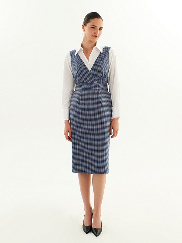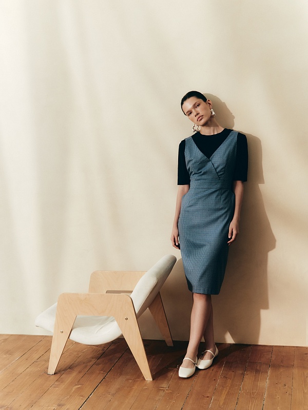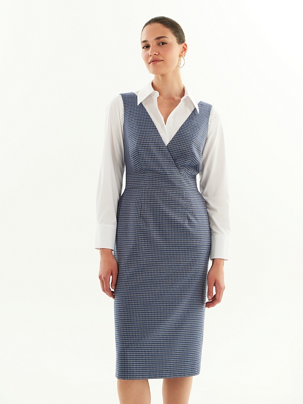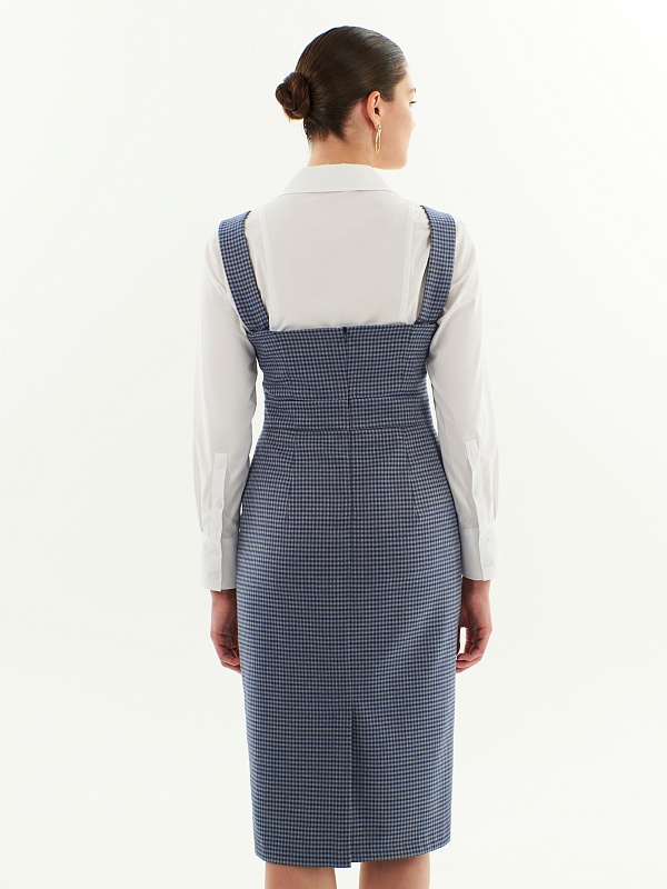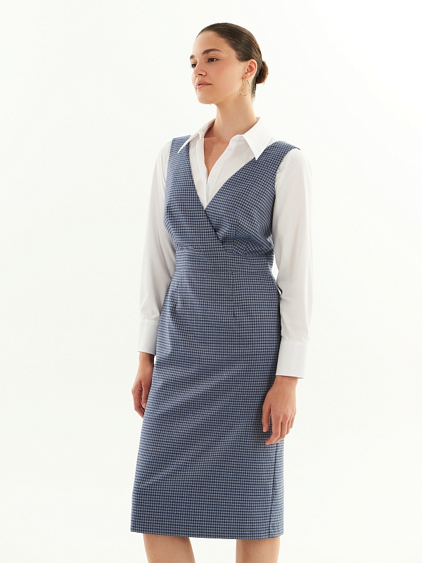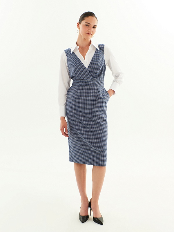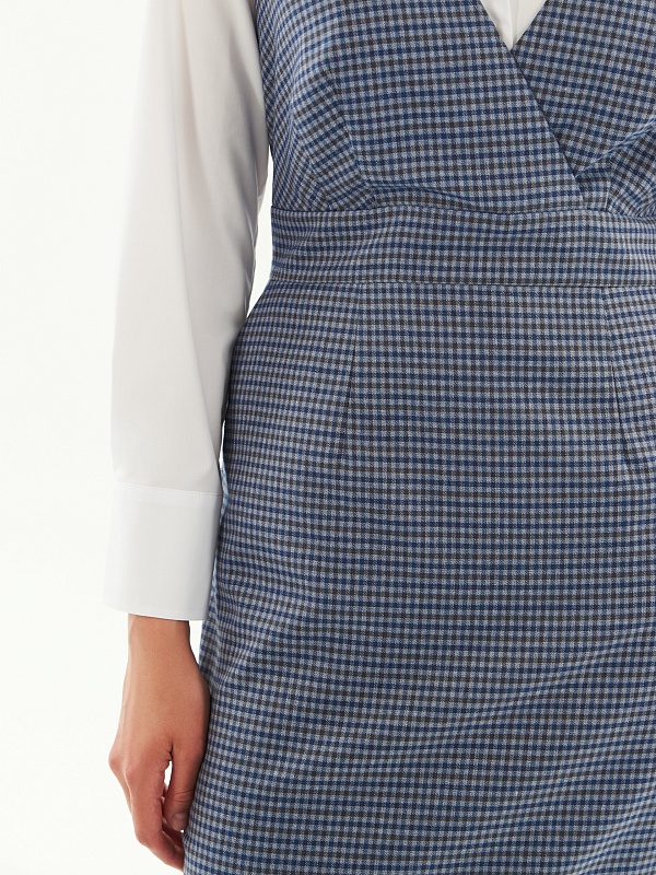 Приталенный сарафан на широких лямках с отрезной линии талии и имитацией запаха, юбка платья классического силуэта с универсальной длиной ниже колена. Платье выполнено из костюмной ткани в клетчатом принте.