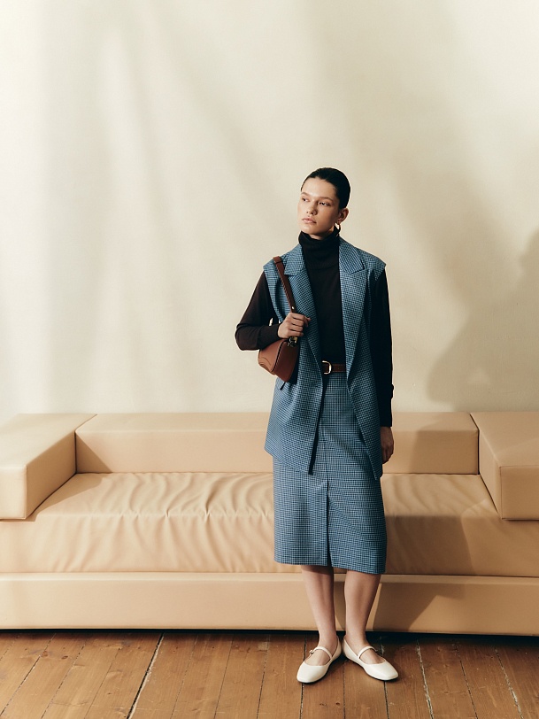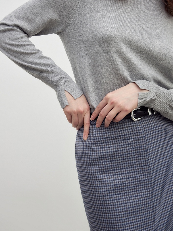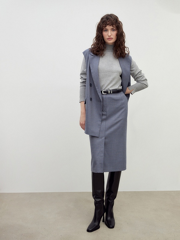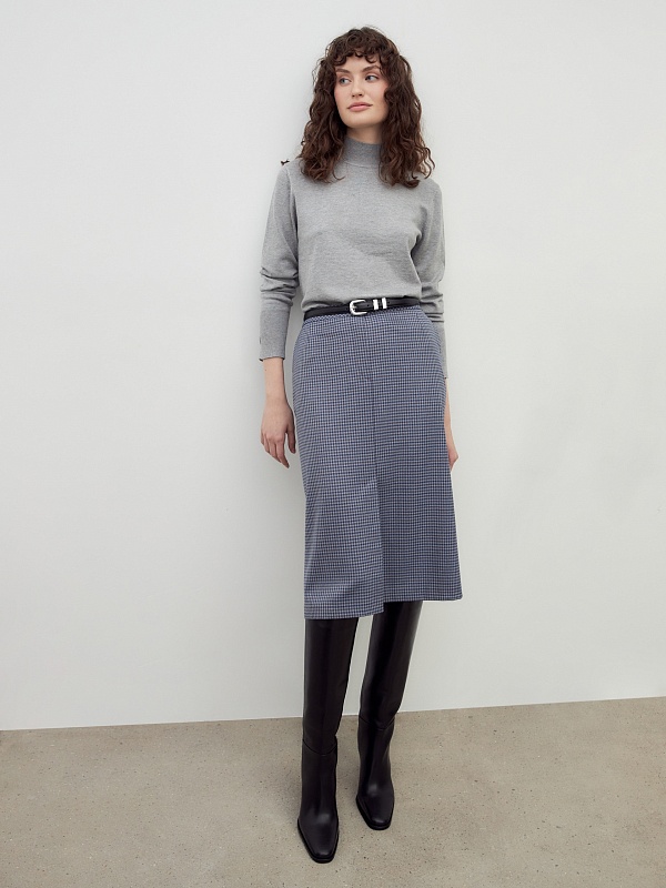 Классическая юбка-карандаш на притачном поясе зауженного к низу силуэта из костюмной ткани в клетчатом принте. Застежка спереди на пуговицу и молнию. Эта модель станет прекрасной базой для создания классических деловых образов.