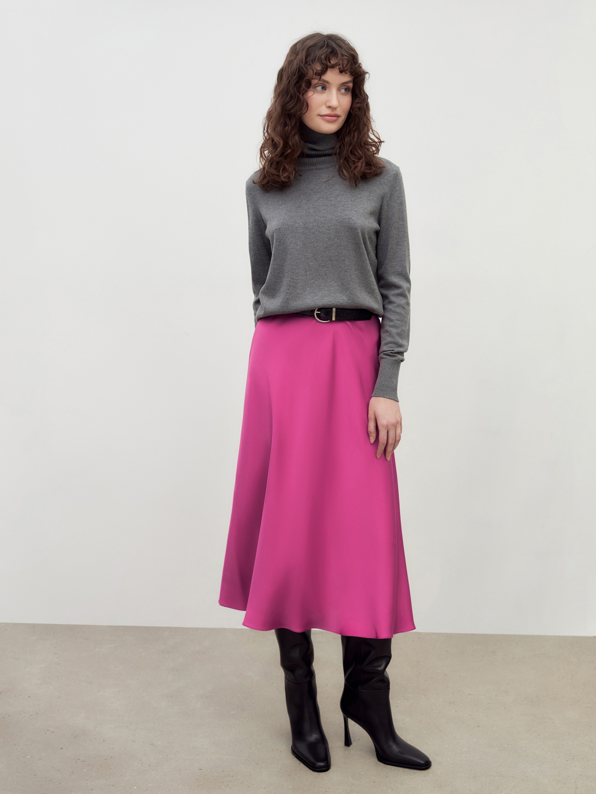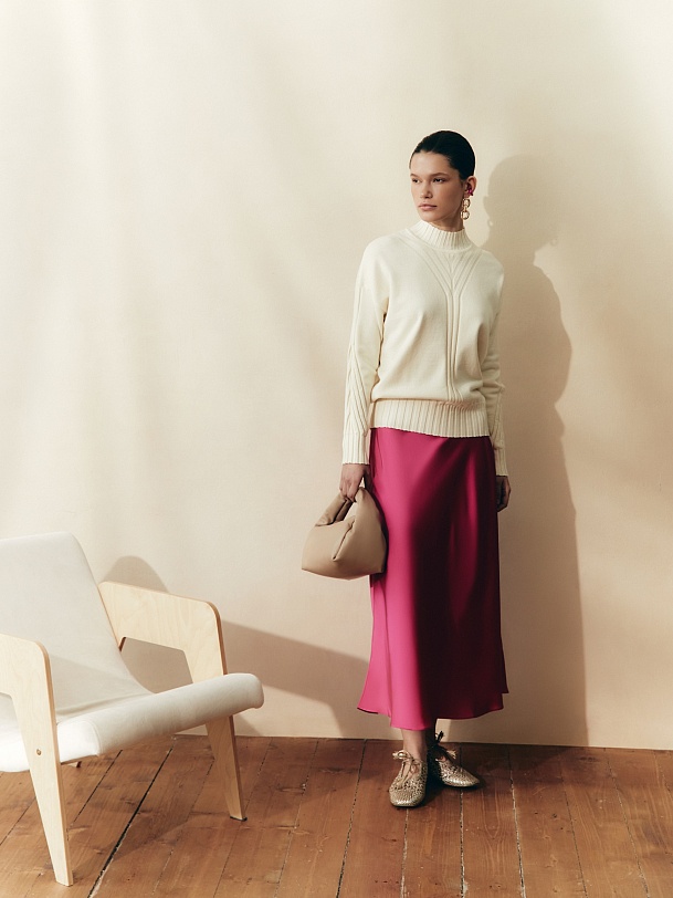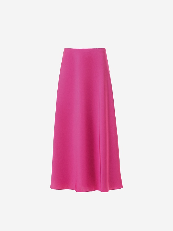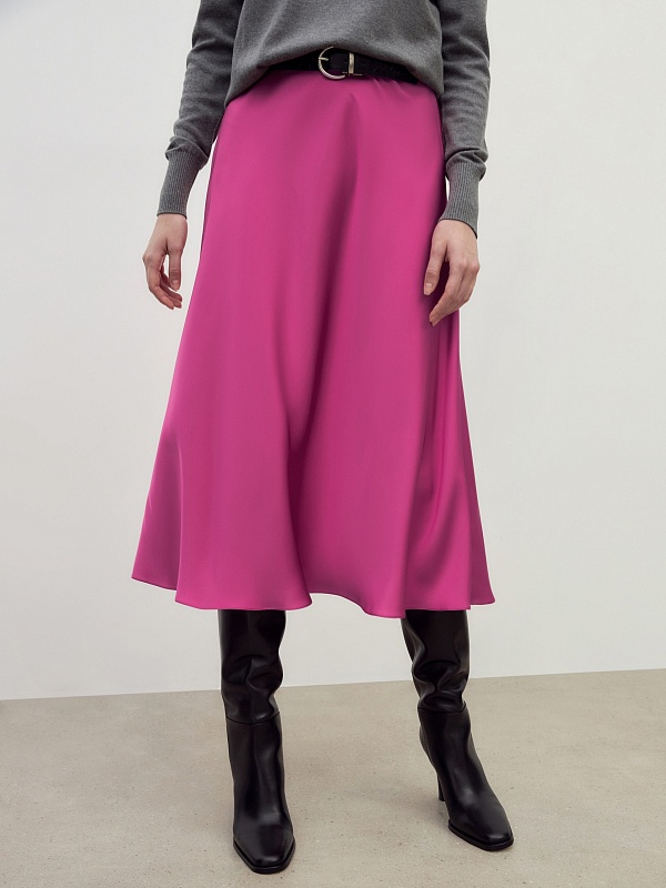 Романтическая юбка, силуэт трапеция, длина миди, в ярком цвете маджента. Пояс на резинке.