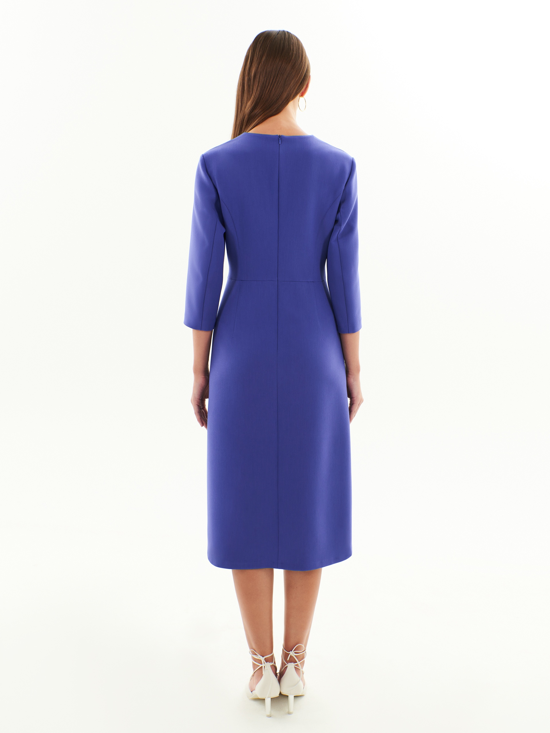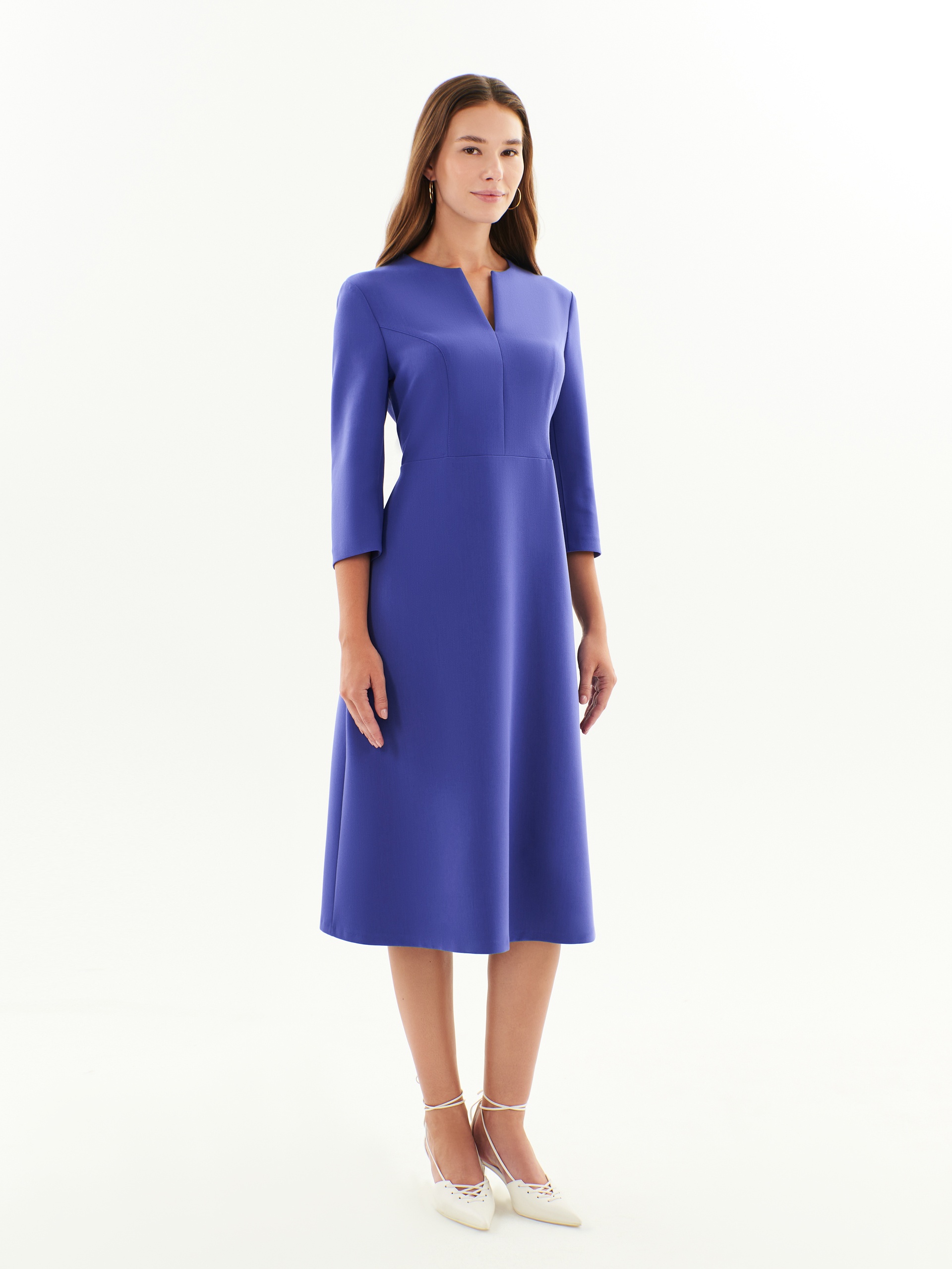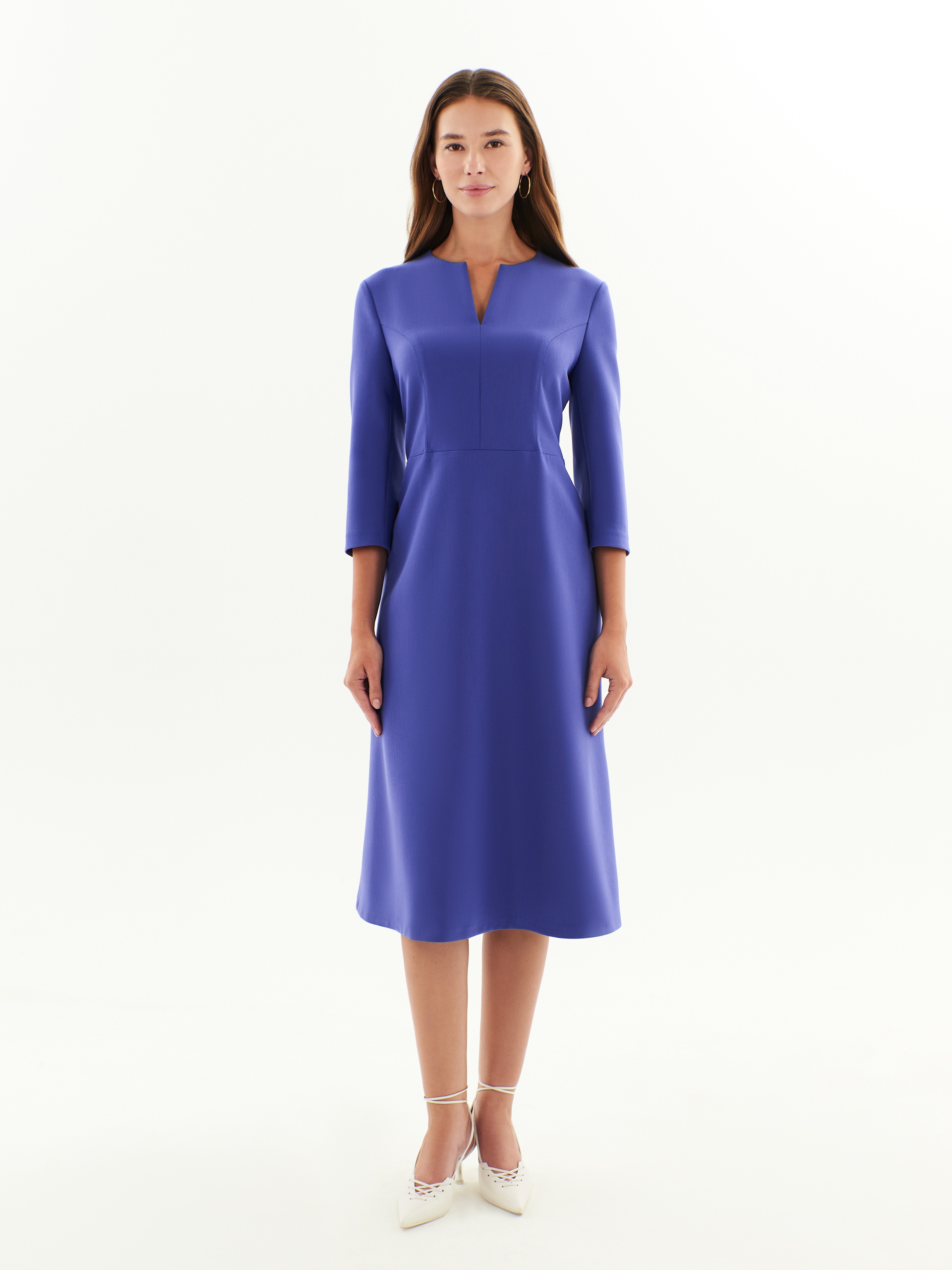 Приталенное платье миди отрезное по талии с рельефами. Круглая горловина с щелевидным вырезом, рукав 7/8. Платье классического силуэта с трапециевидной юбкой. Платье выполнено из костюмной ткани в ярком цвете. В омплект входит обтяжной ремень.