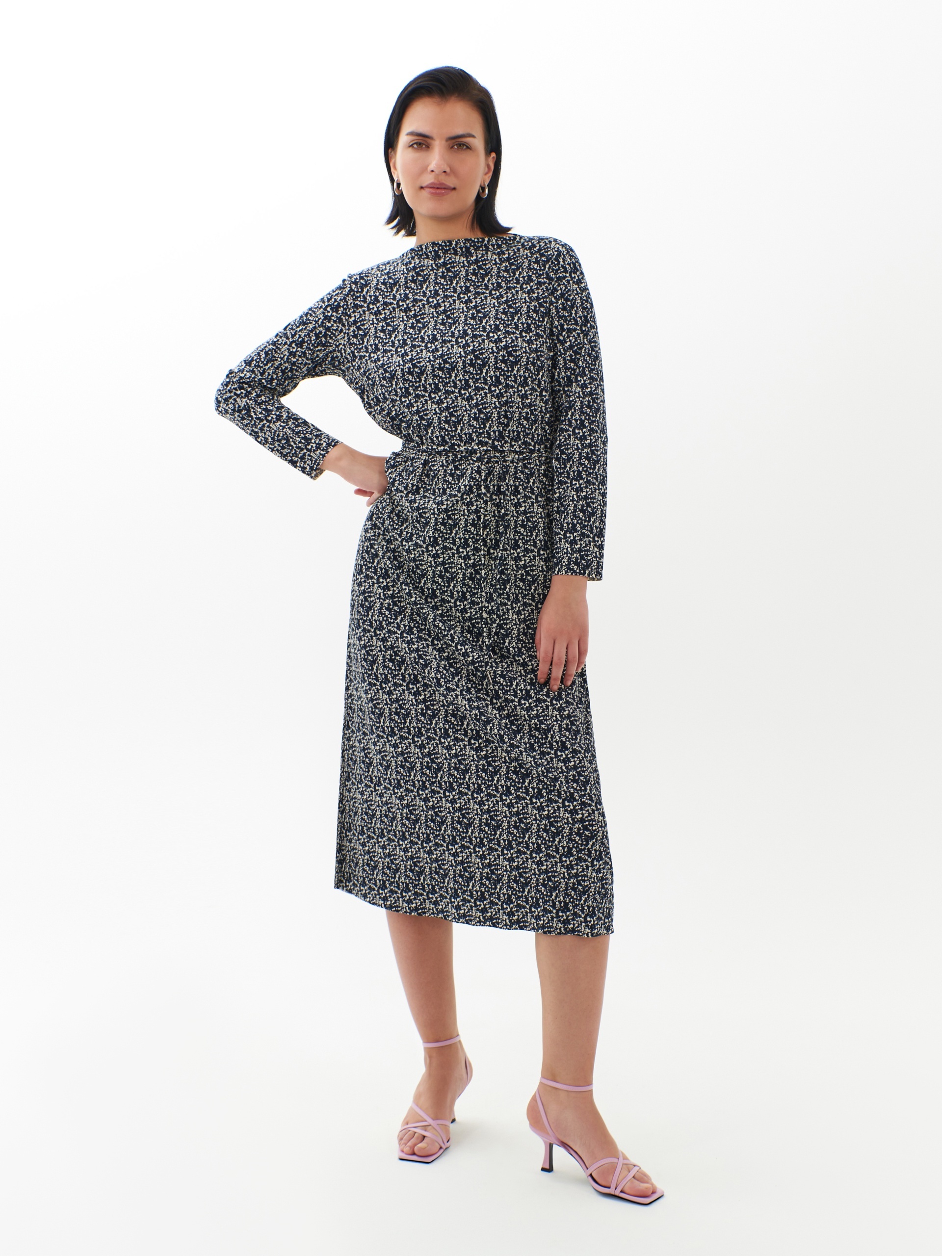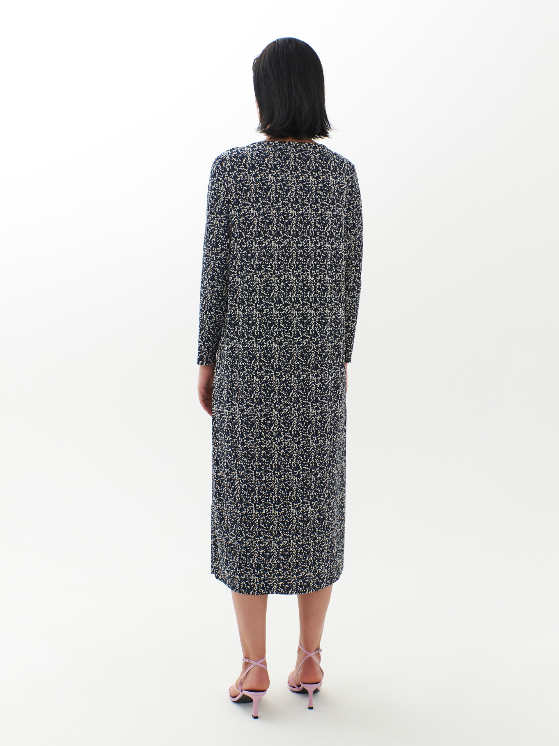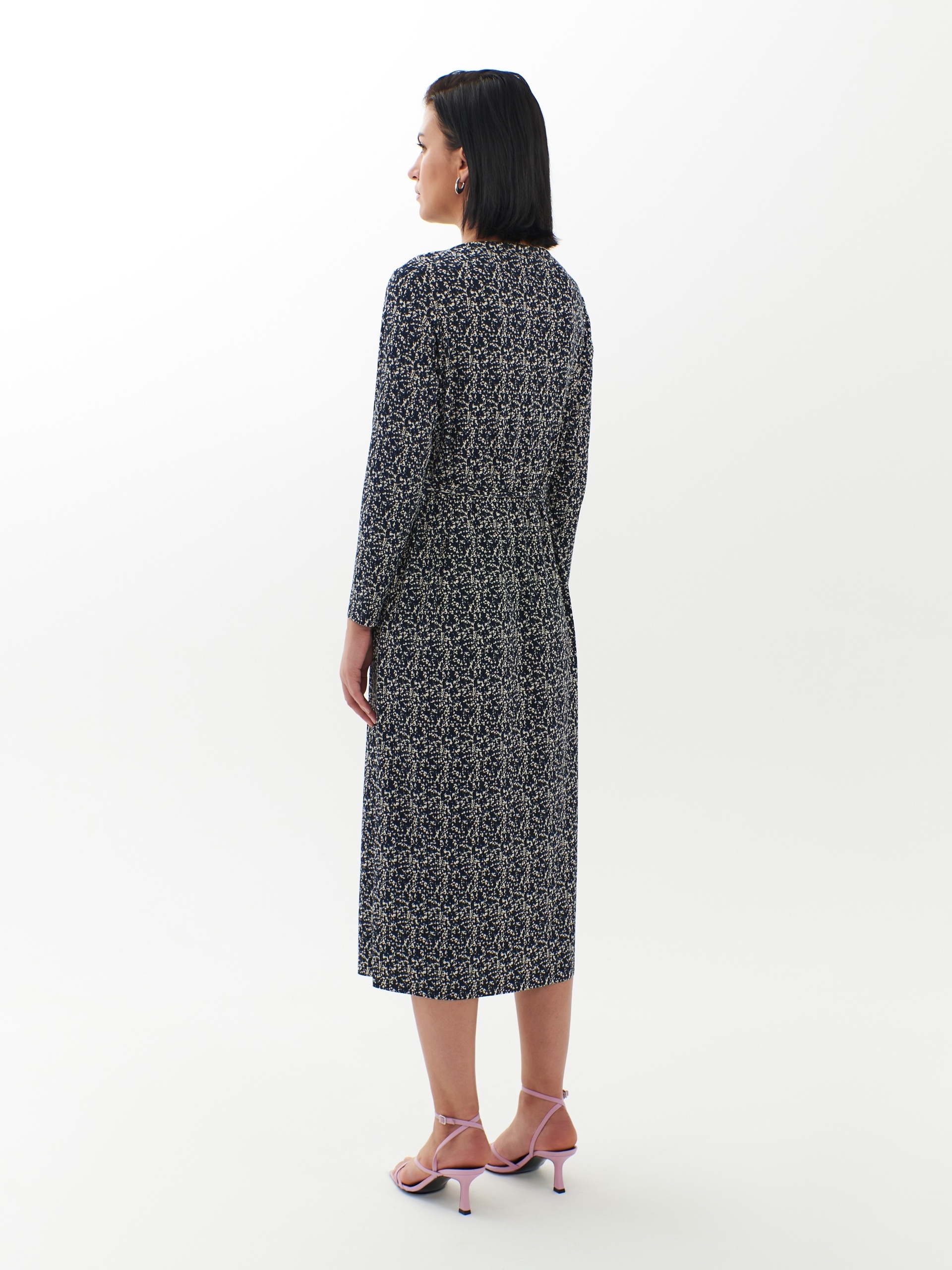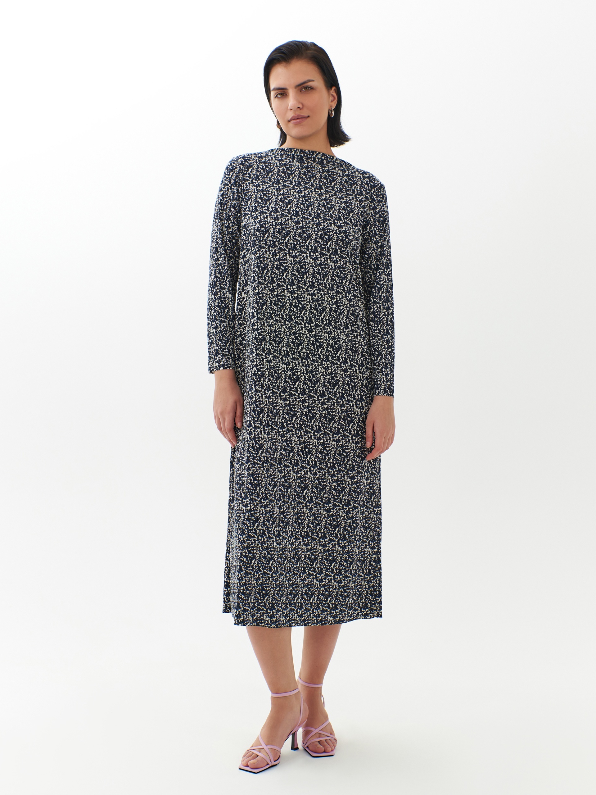 Прямое платье-миди из смесовой вискозы - идеальная вещь для предстоящей осени. Длинные рукава создают уютный образ, вырез щель добавляет элегантности. Мелкий пятнистый принт делает платье идеальным выбором как для особых случаев, так и для повседневного ношения.
