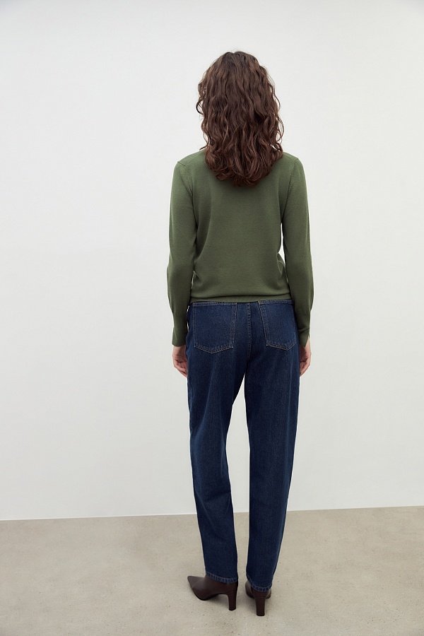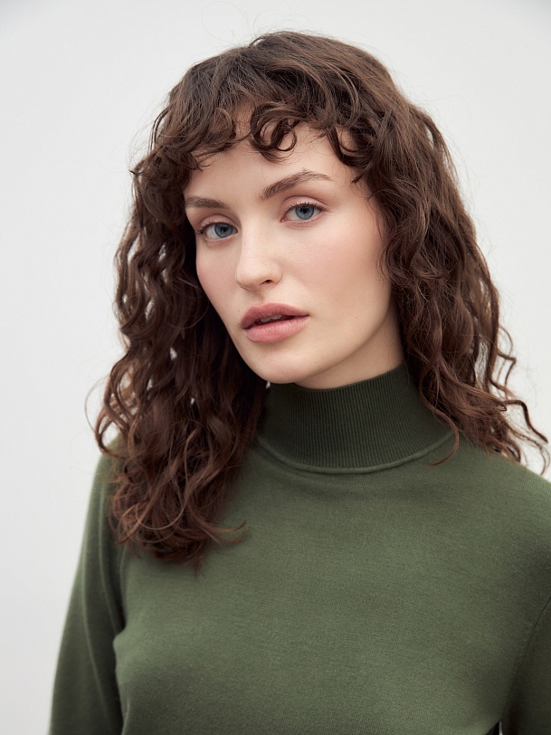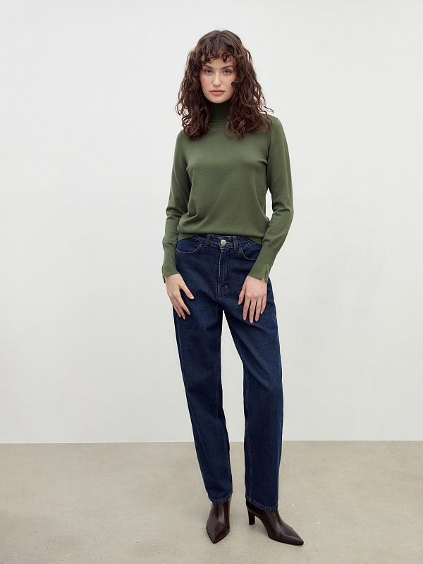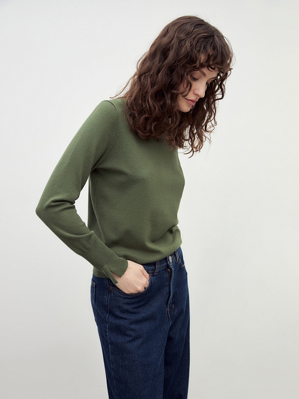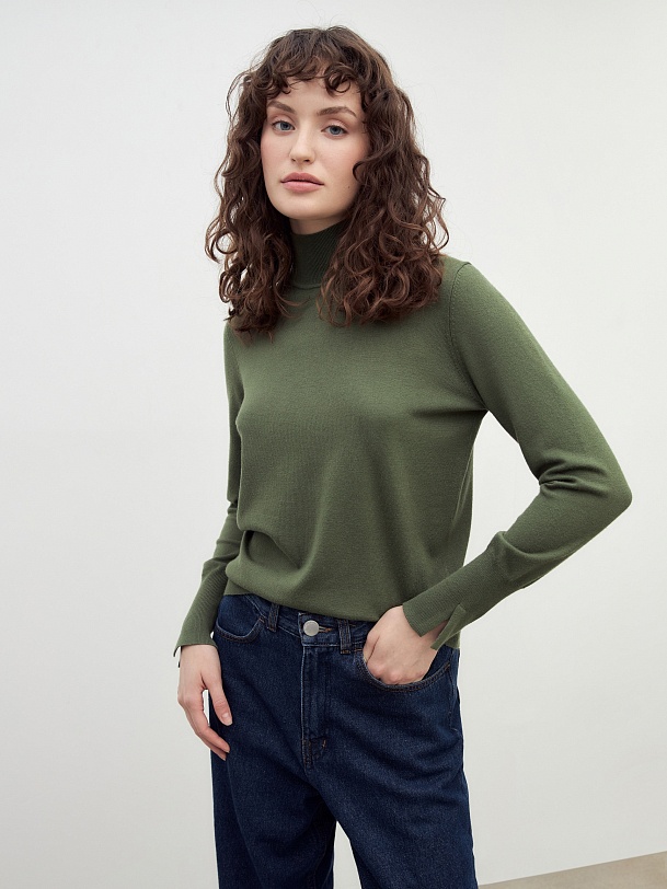 Вязаный джемпер из смесовой пряжи. Достаточно тонкий, чтобы носить его под жакет, и в то же время как отдельный предмет гардероба. Изюминку модели придают разрезы на манжетах.
