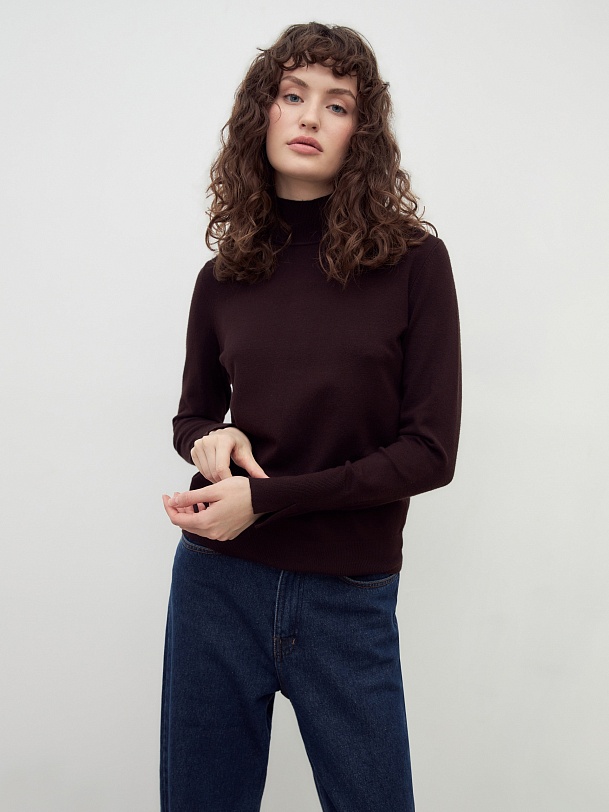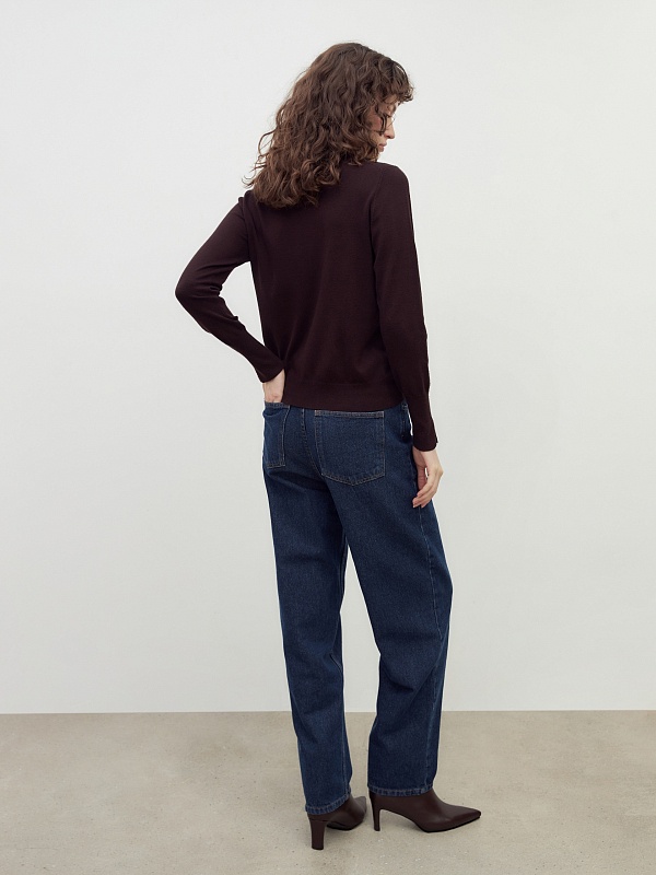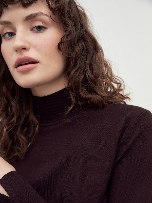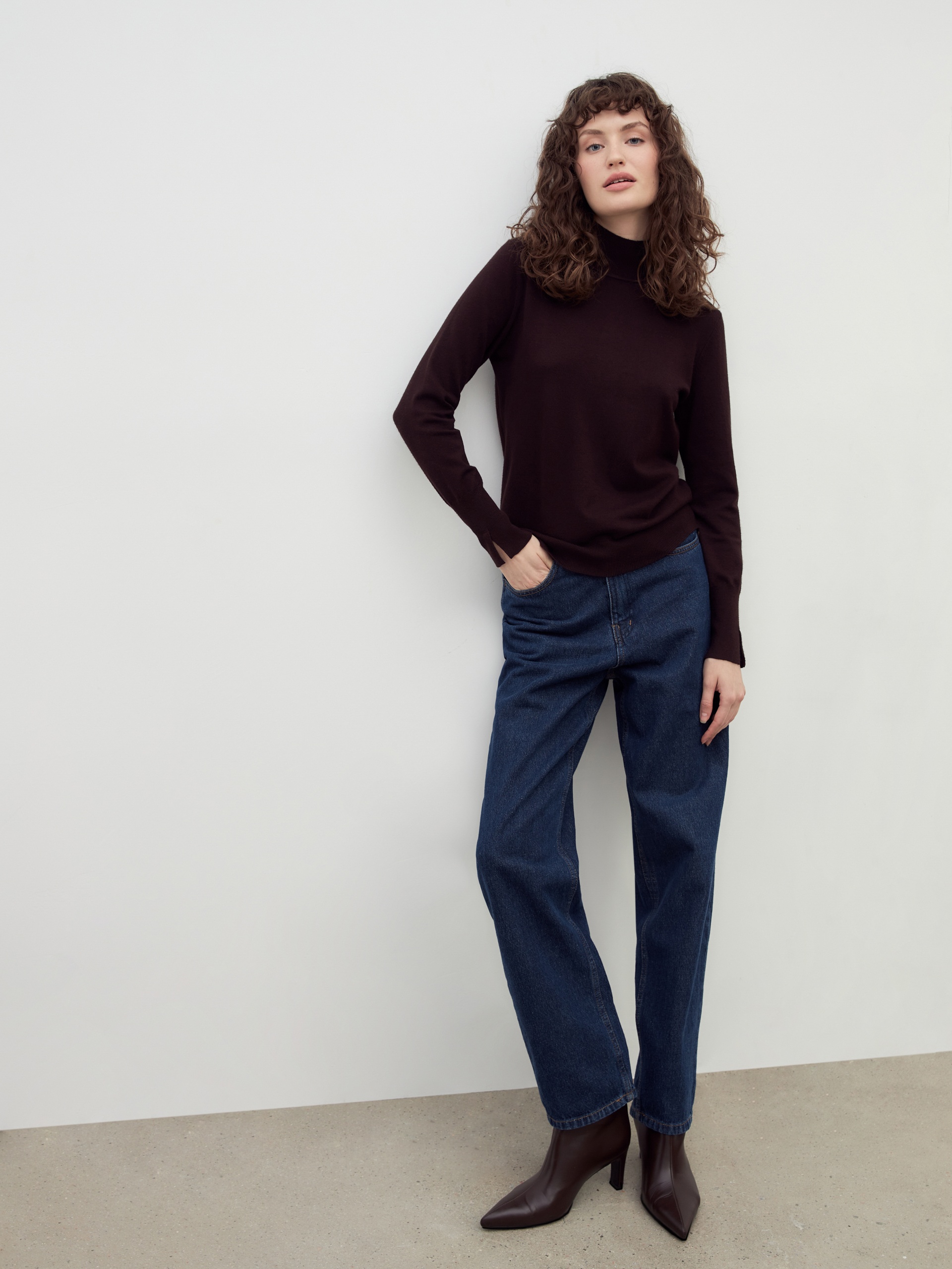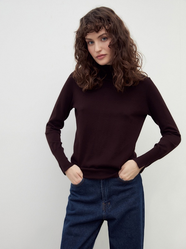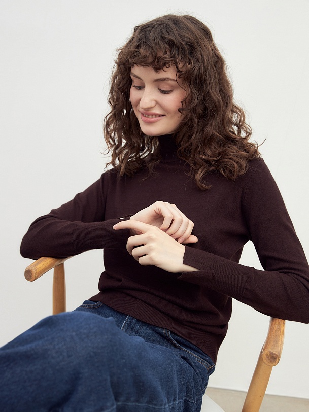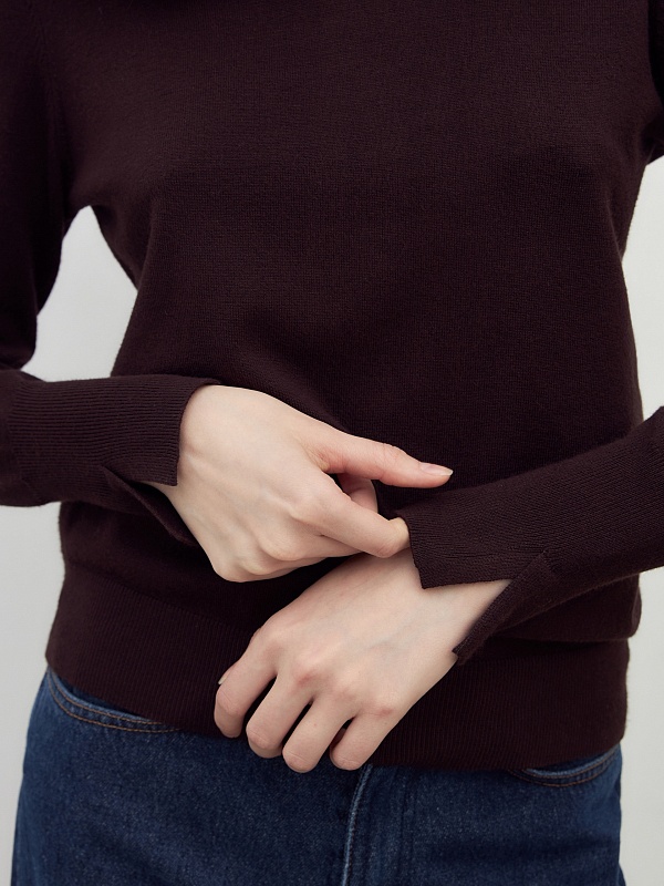 Вязаный джемпер из смесовой пряжи. Достаточно тонкий, чтобы носить его под жакет, и в то же время как отдельный предмет гардероба. Изюминку модели придают разрезы на манжетах.