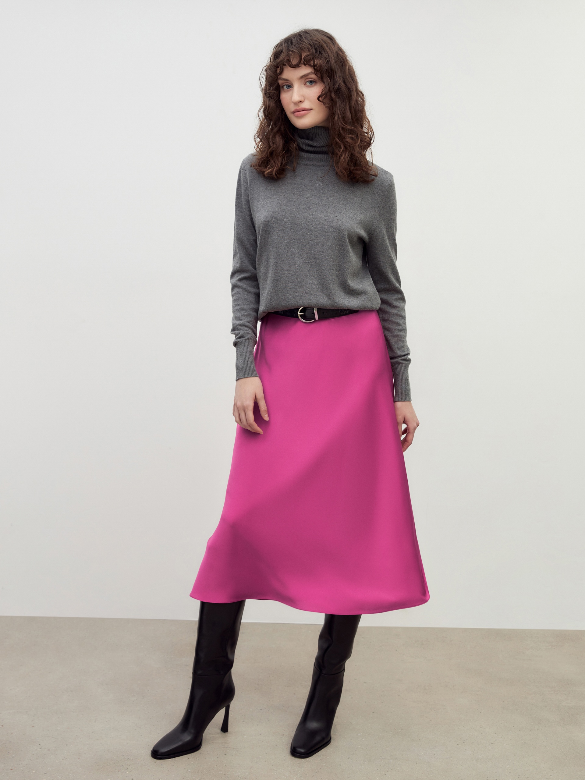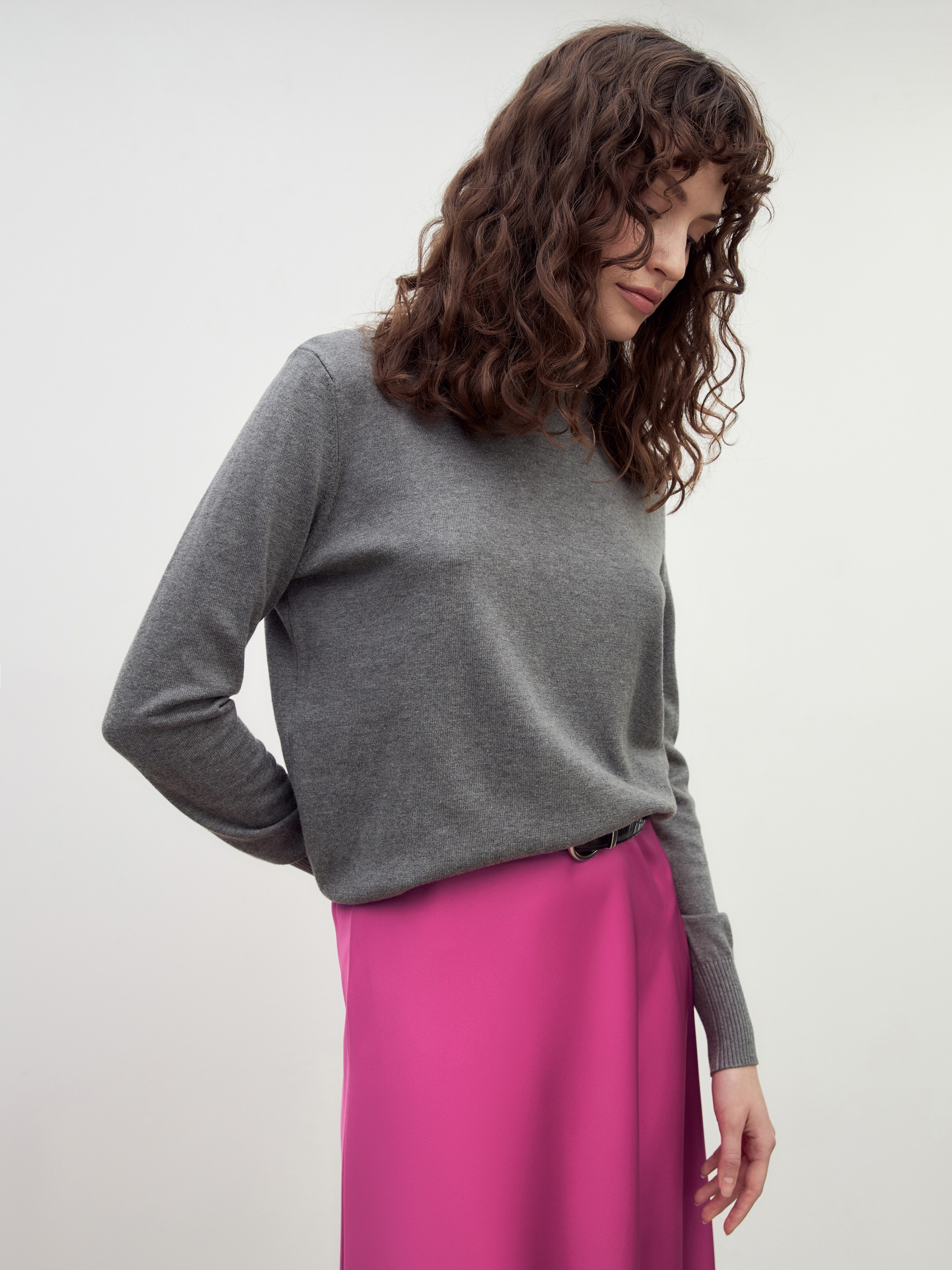 Базовый джемпер серого меланжа свободного кроя. Отлично сочетается с кардиганами, рубашками, жакетами.