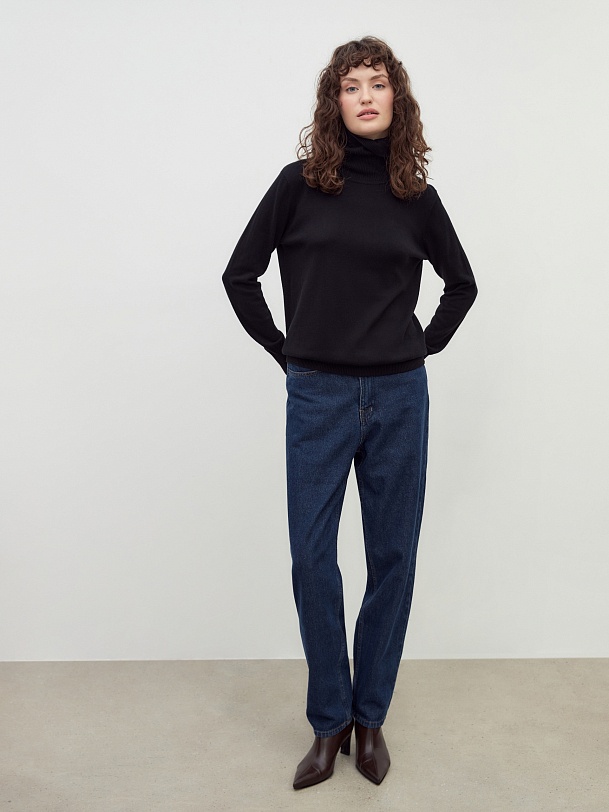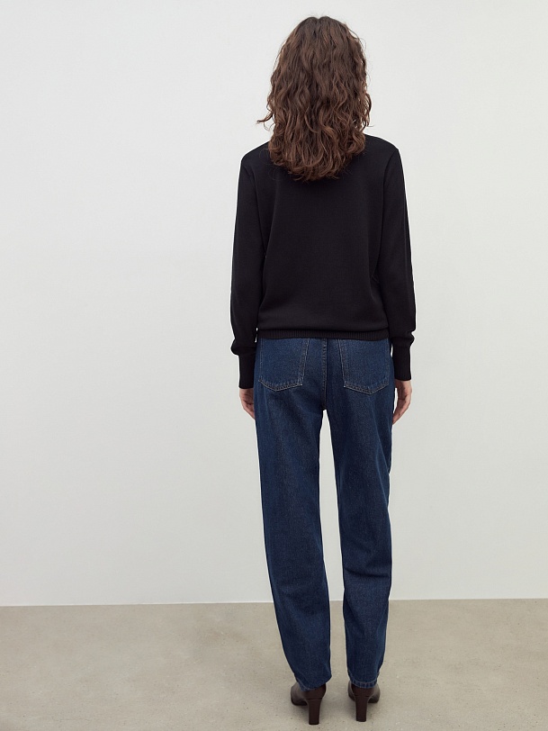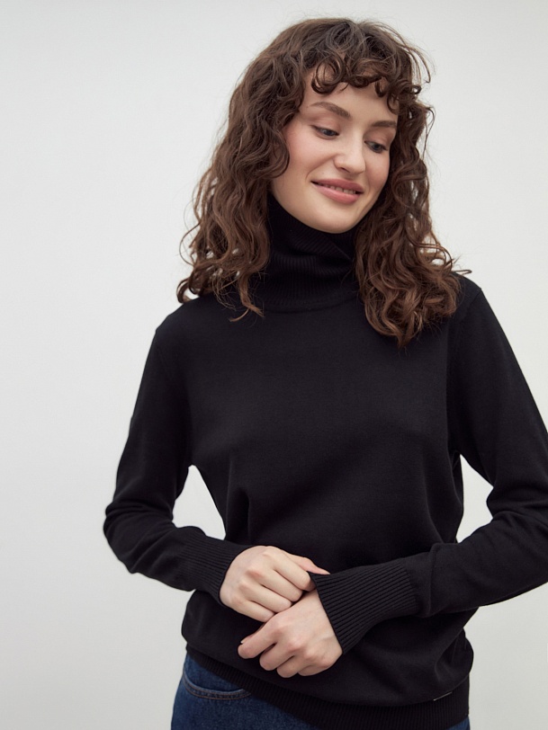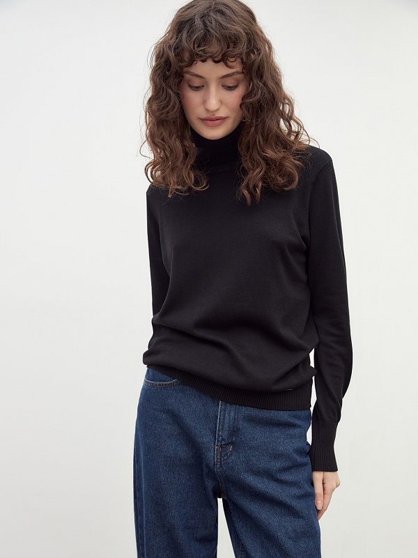 Базовый джемпер благородного черного цвета свободного кроя. Отлично сочетается с кардиганами, рубашками, жакетами.