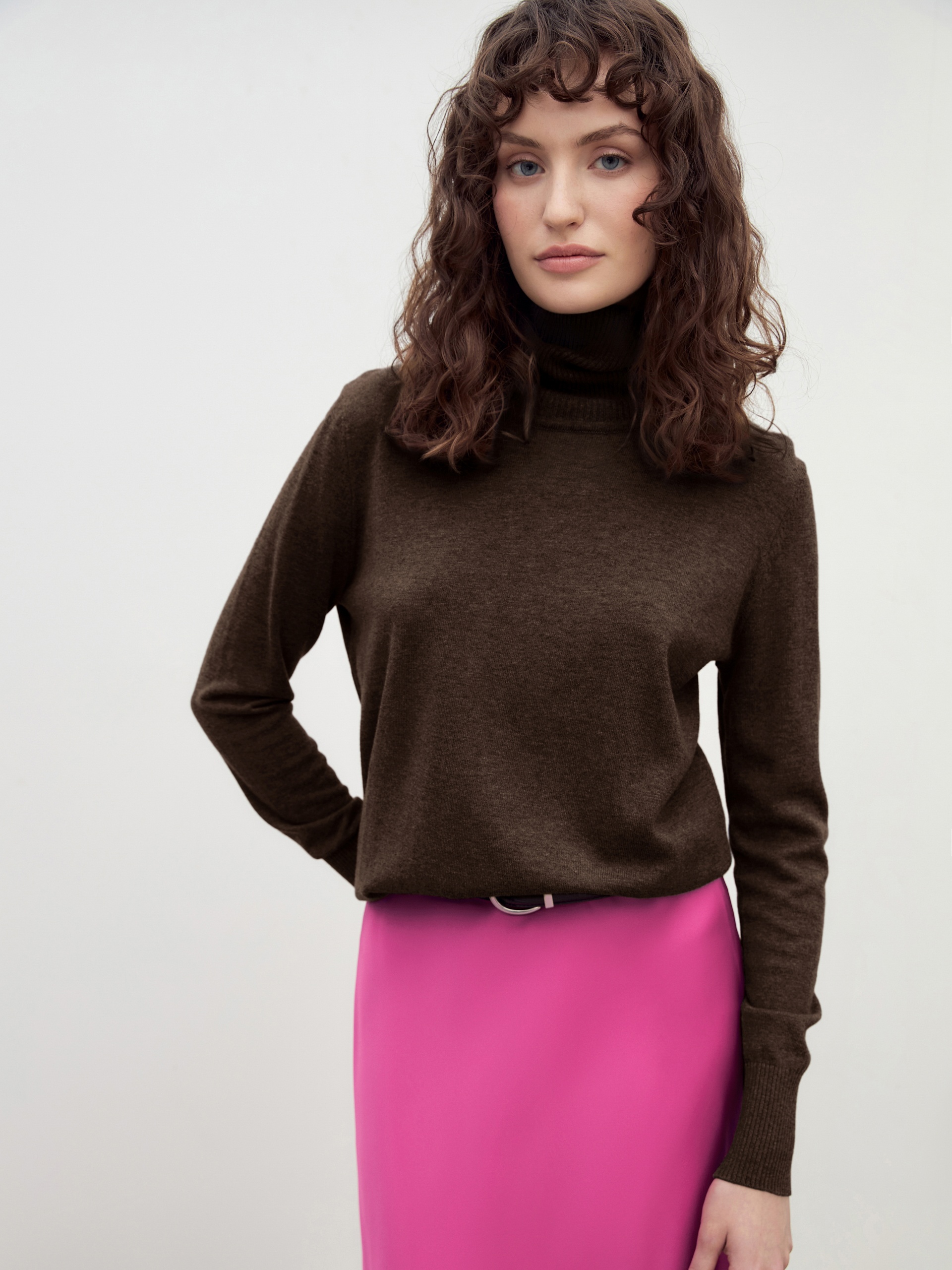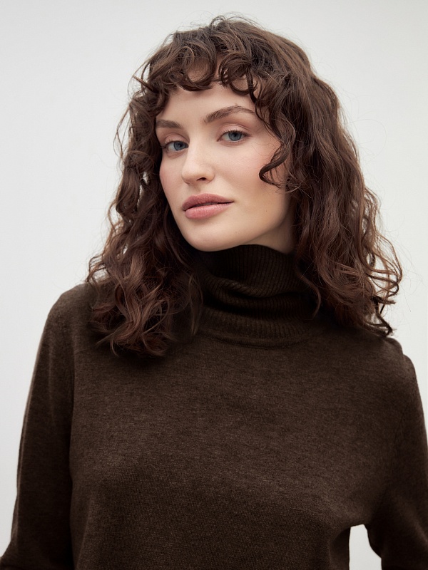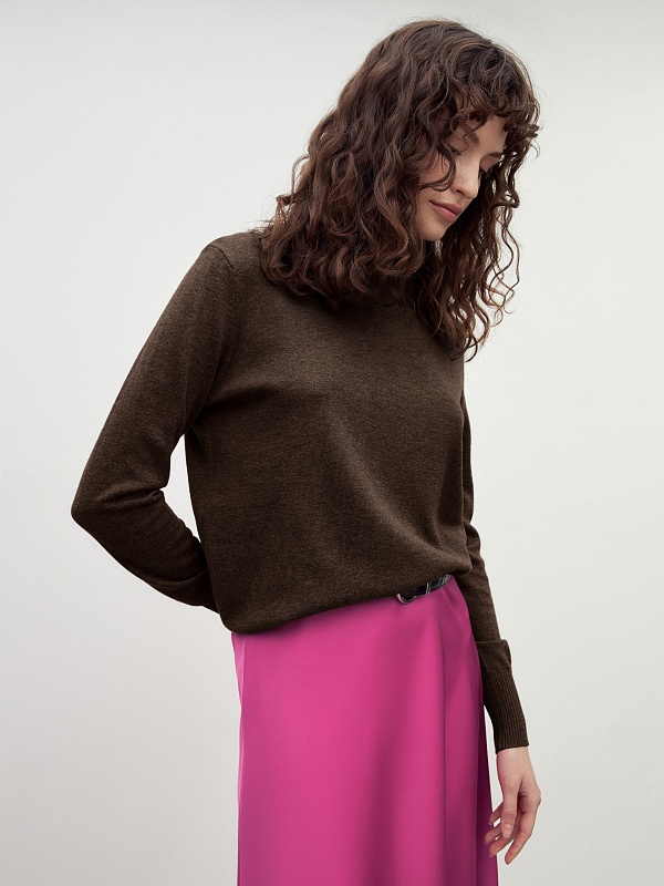 Базовый джемпер благородного шоколадного цвета и свободного кроя. Отлично сочетается с кардиганами, рубашками, жакетами.