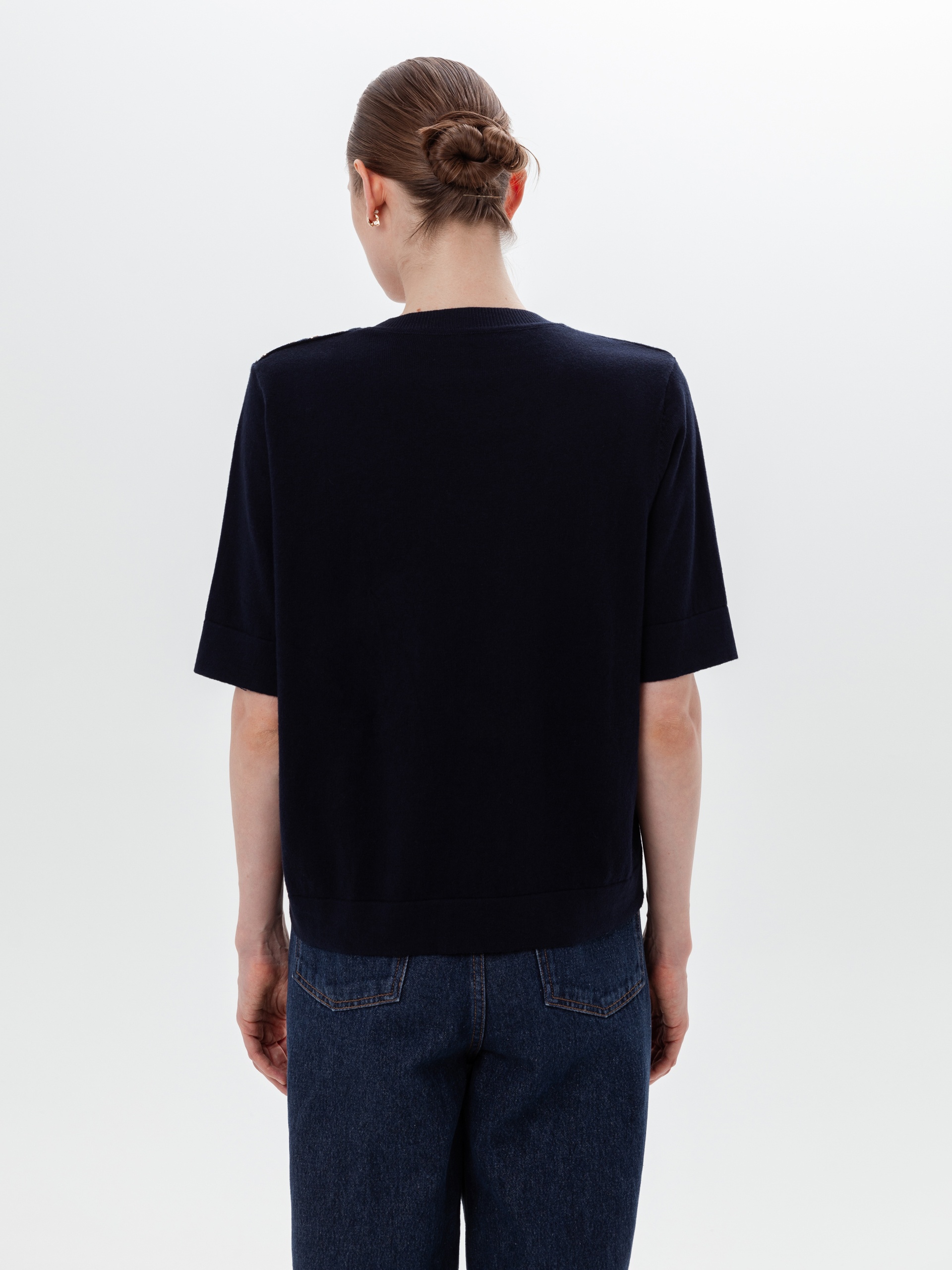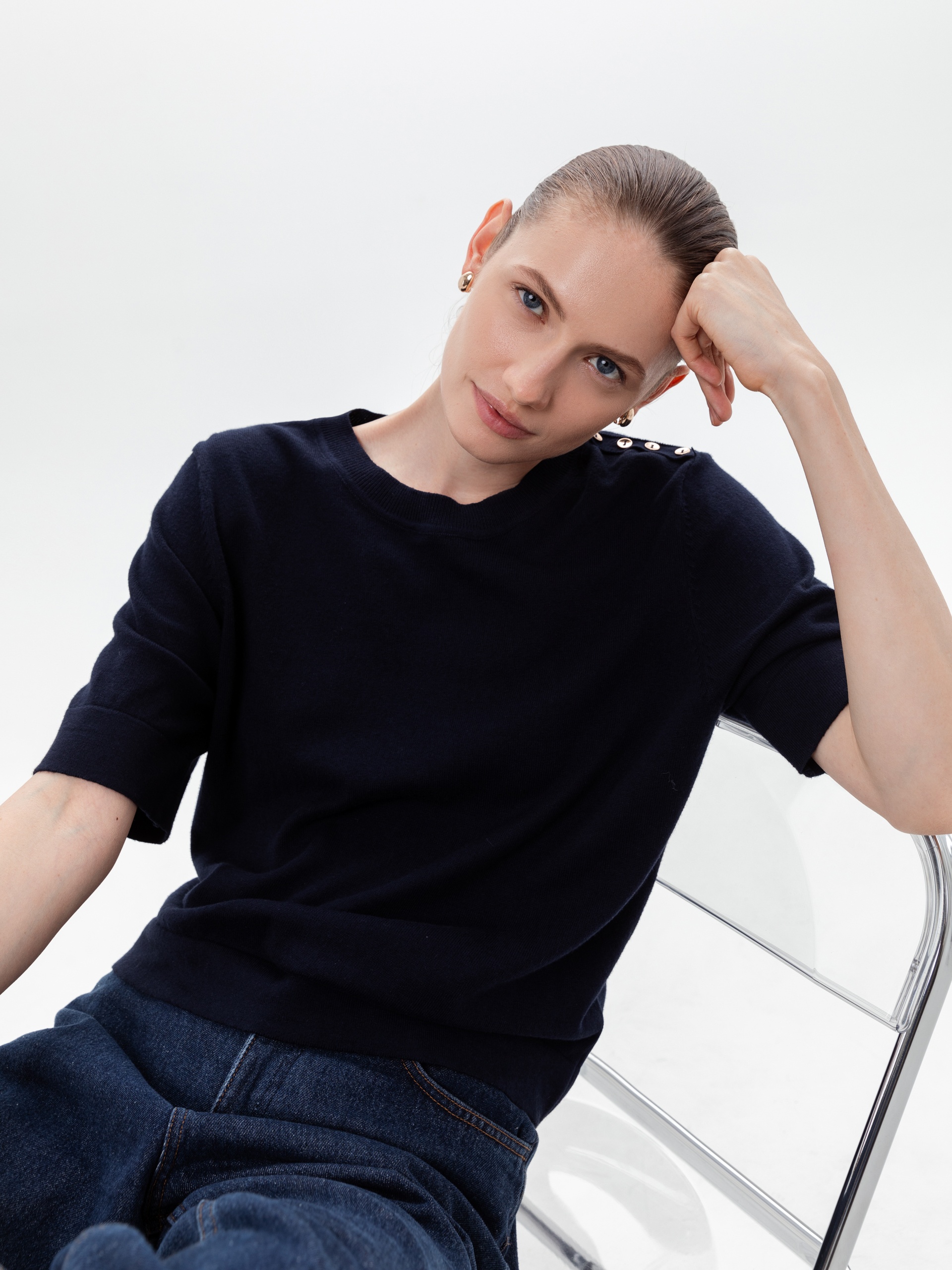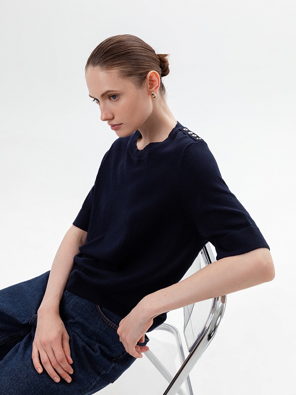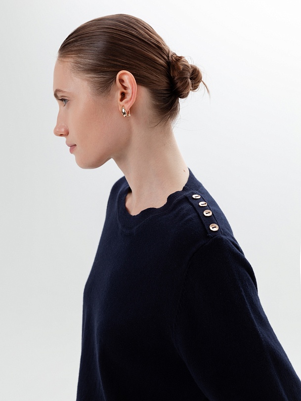 Вязаный джемпер из хлопка и кашемира в универсальной темно-синей расцветке. На плече декоративный элемент с маленькими золотистыми пуговицами. Этот вязаный джемпер - отличная альтернатива обычной футболке. Благодаря натуральному хлопковому составу с добавлением кашемира и тонкому плетению, джемпер легкий и дышащий.