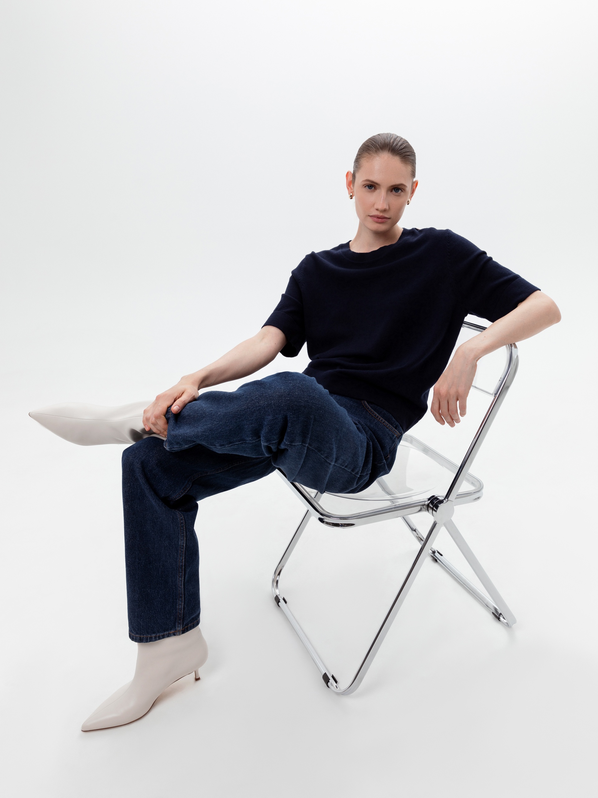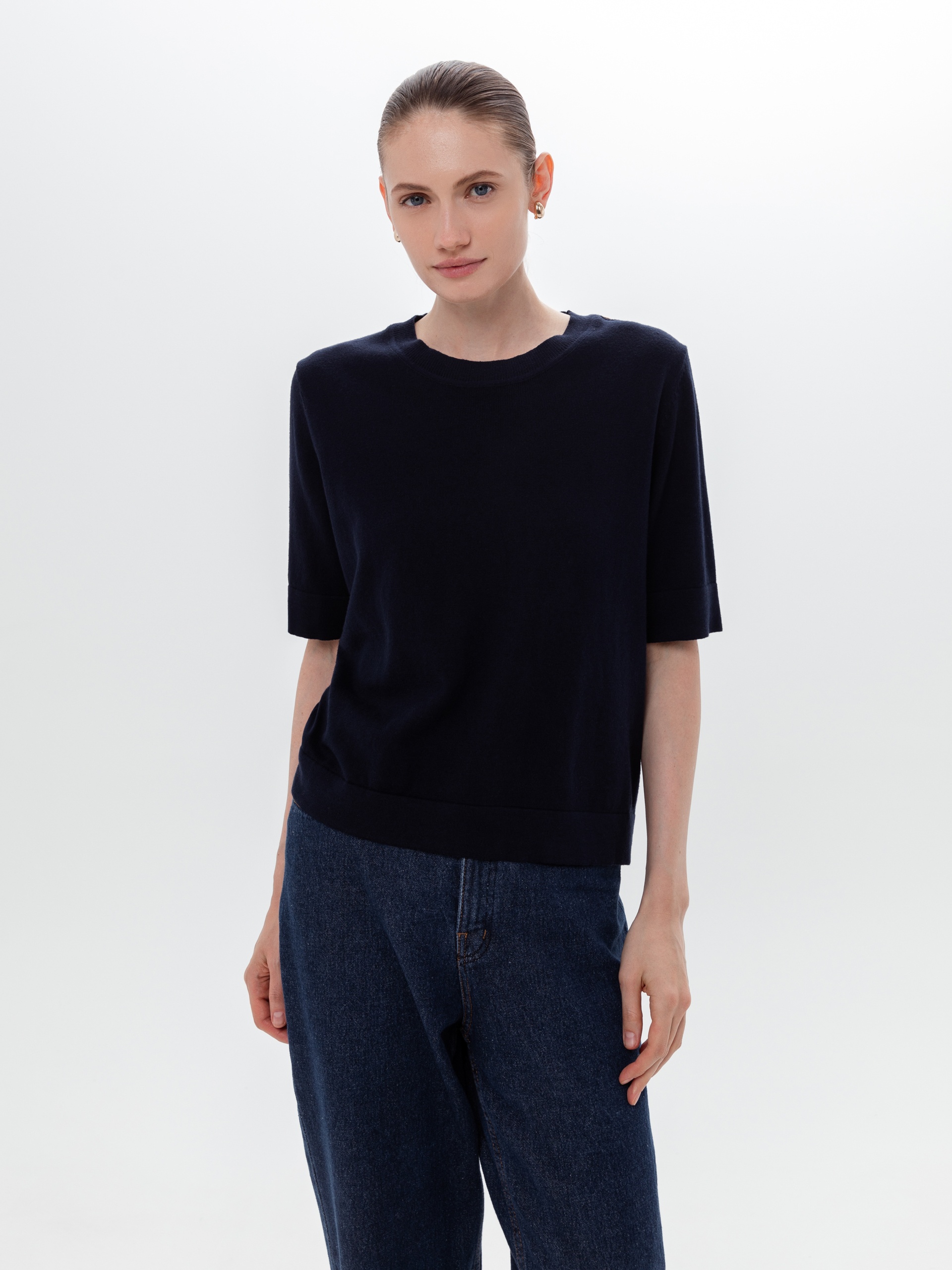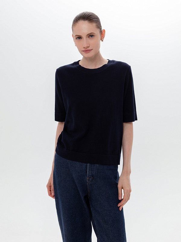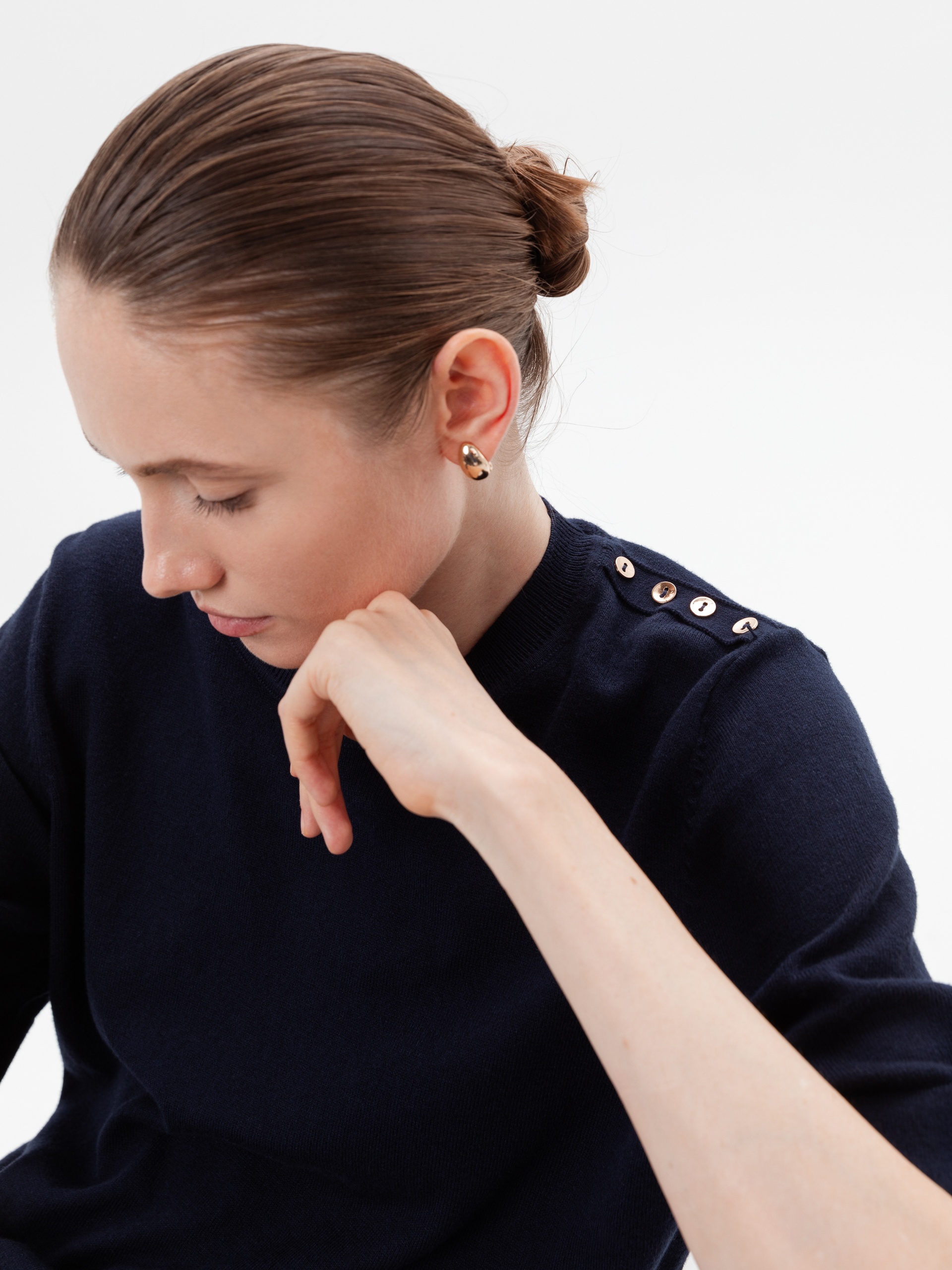 Вязаный джемпер из хлопка и кашемира в универсальной темно-синей расцветке. На плече декоративный элемент с маленькими золотистыми пуговицами. Этот вязаный джемпер - отличная альтернатива обычной футболке. Благодаря натуральному хлопковому составу с добавлением кашемира и тонкому плетению, джемпер легкий и дышащий.