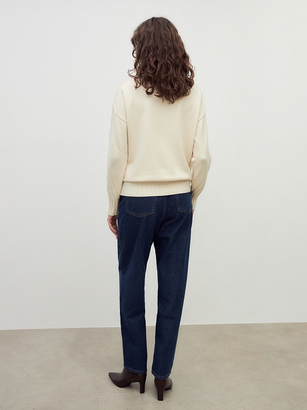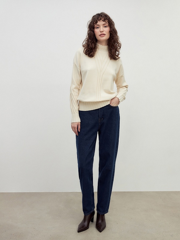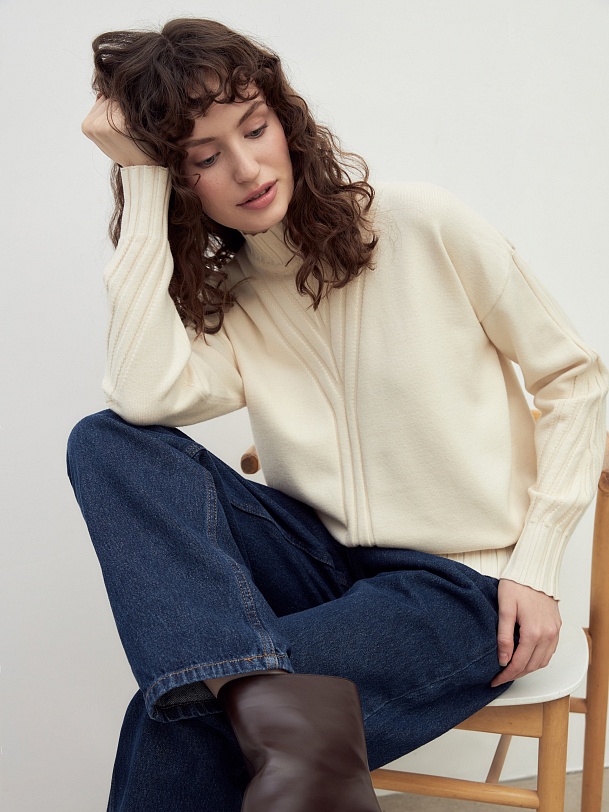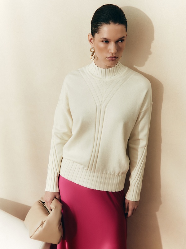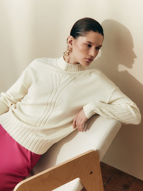 Мягкий свитер с добавлением овечьей шерсти, прямого силуэта, в приятном молочном оттенке и вывязанными узорами по полочке и рукавам будет отлично согревать вас в холодные зимние дни. Благодаря уникальной структуре овечьей шерсти она "дышит" - между волокнами располагаются особые воздушные полости, внутри которых циркулирует воздух, он помогает выводить лишнее тепло и влагу.