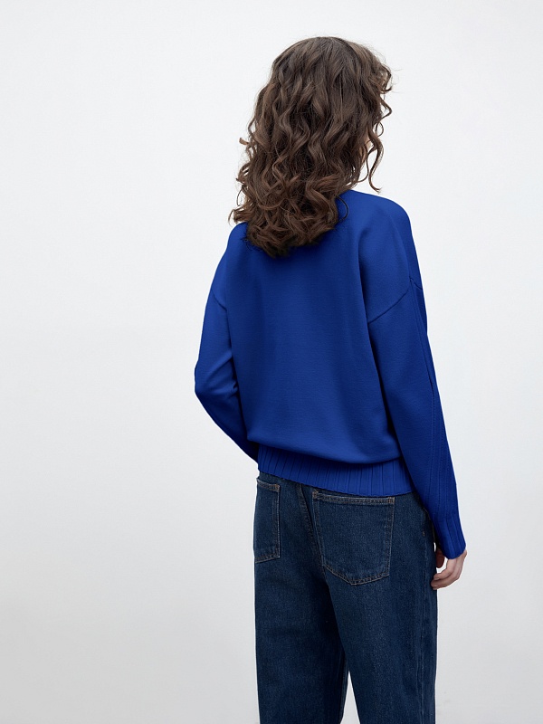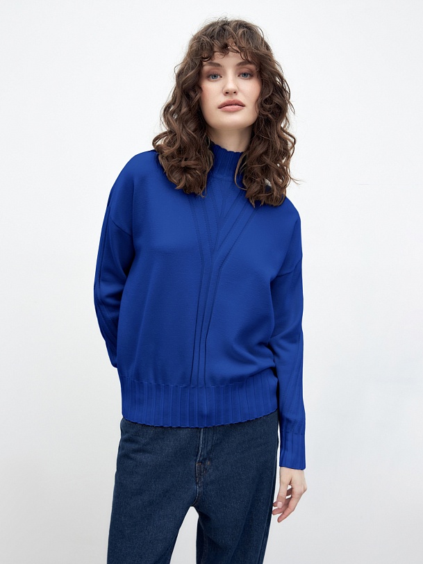 Мягкий свитер с добавлением овечьей шерсти, прямого силуэта, в синем трендовом оттенке и вывязанными узорами по полочке и рукавам будет отлично согревать вас в холодные зимние дни. Благодаря уникальной структуре овечьей шерсти она "дышит" - между волокнами располагаются особые воздушные полости, внутри которых циркулирует воздух, он помогает выводить лишнее тепло и влагу.