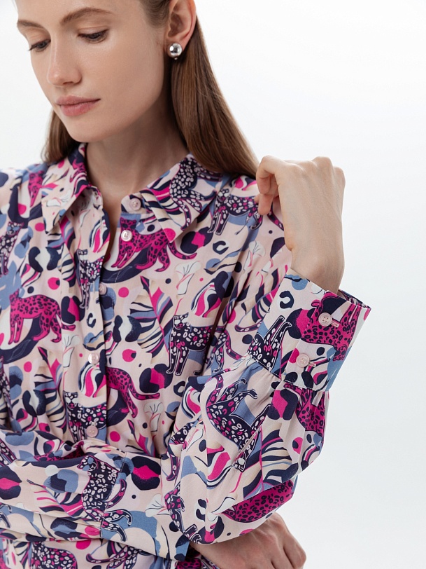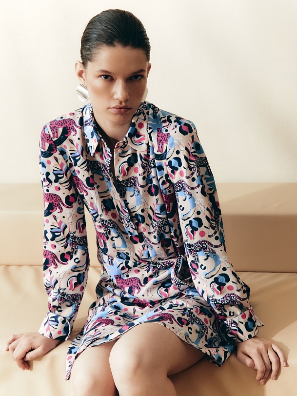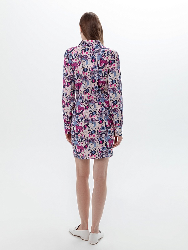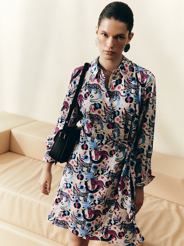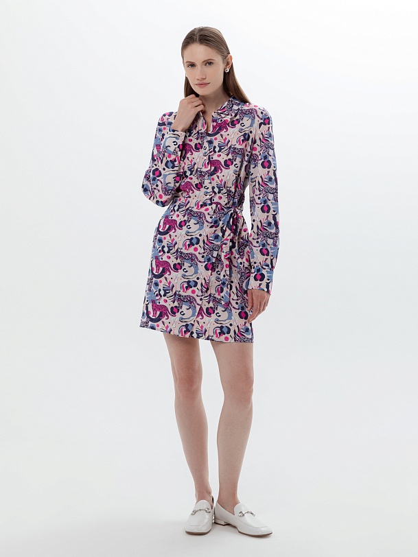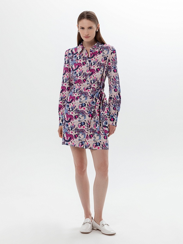 Полуприлегающее платье с эффектом запаха на пуговицах, выполненное из натуральной ткани в ярком принте. Платье с отложным воротником и классическим втачным рукавом на манжете. Платье длиной до середины колена.