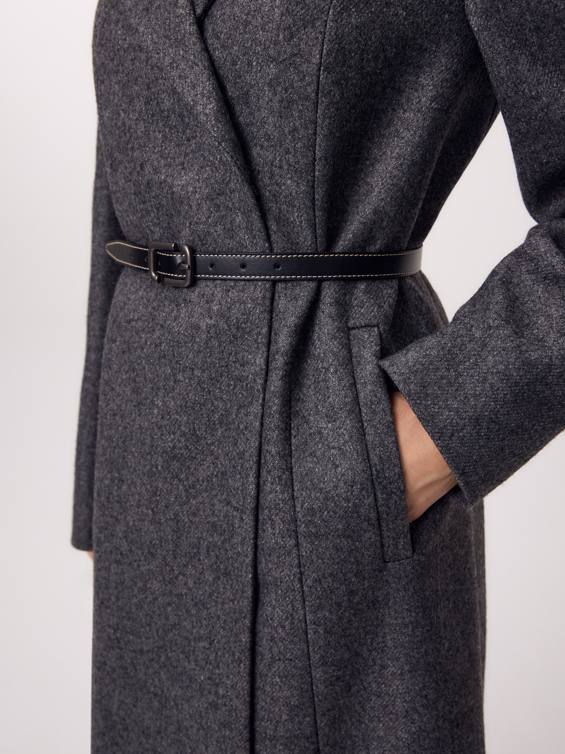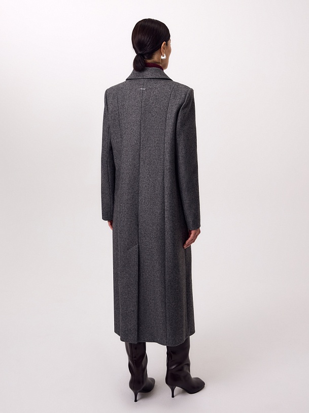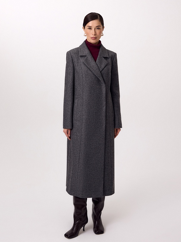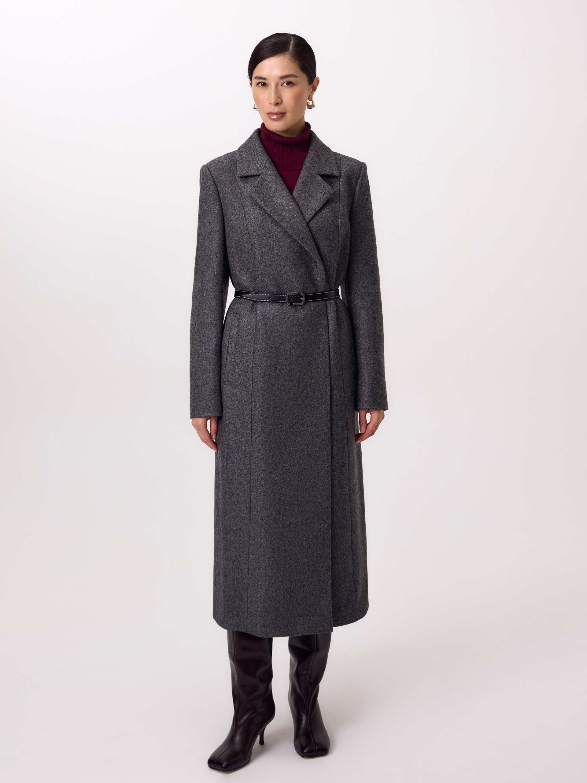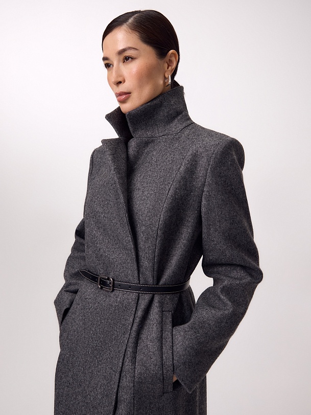 Двубортное длинное пальто из шерстяной пальтовой ткани в цвете серый меланж. Комфортный втачной рукав, классический английский воротник и вместительные карманы делают его стильным и удобным. Мягкий женственный силуэт создаётся при помощи рельефных швов по переду и спинке. В среднем шве спинки высокая шлица. Застёгивается изделие на ряд надёжных пришивных кнопок. Завершает образ контрастный пояс из экокожи на металической пряжке. А для наилучшей защиты от непогоды пальто выполнено с использованием высокотехнологичной мембраны RaftPro. Произведено в Санкт-Петербурге.