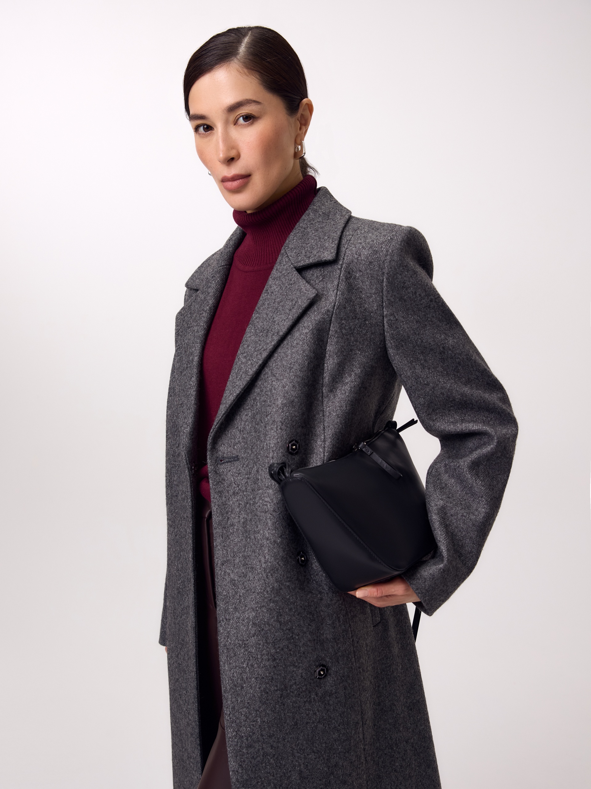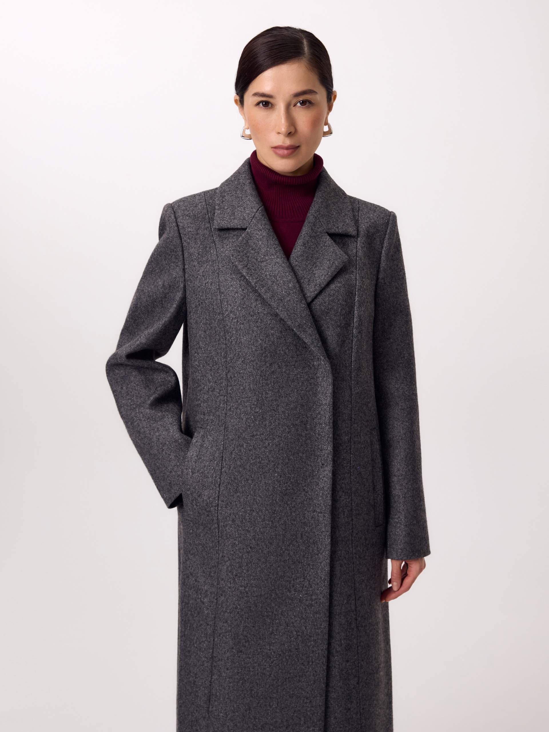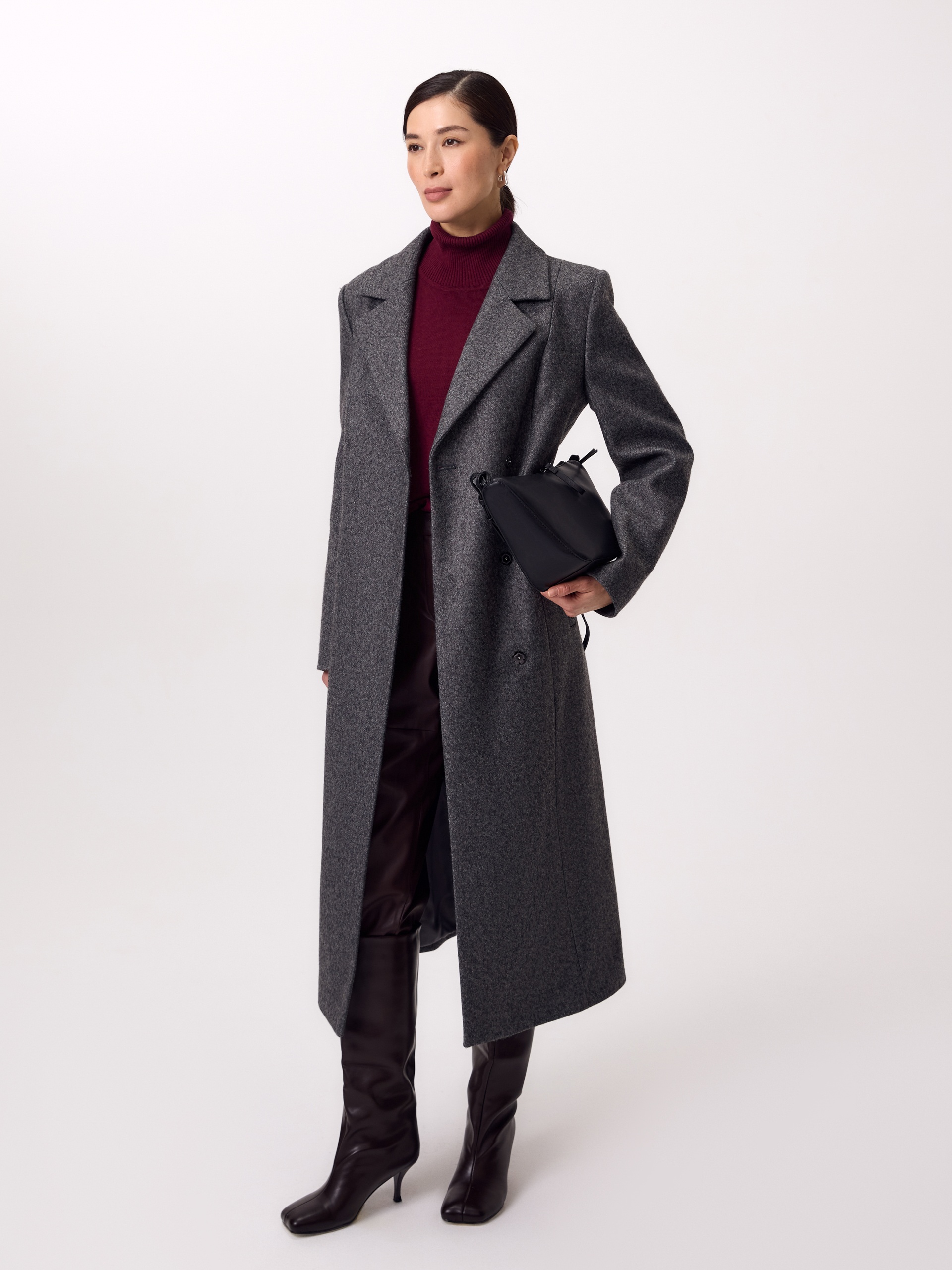 Двубортное длинное пальто из шерстяной пальтовой ткани в цвете серый меланж. Комфортный втачной рукав, классический английский воротник и вместительные карманы делают его стильным и удобным. Мягкий женственный силуэт создаётся при помощи рельефных швов по переду и спинке. В среднем шве спинки высокая шлица. Застёгивается изделие на ряд надёжных пришивных кнопок. Завершает образ контрастный пояс из экокожи на металической пряжке. А для наилучшей защиты от непогоды пальто выполнено с использованием высокотехнологичной мембраны RaftPro. Произведено в Санкт-Петербурге.