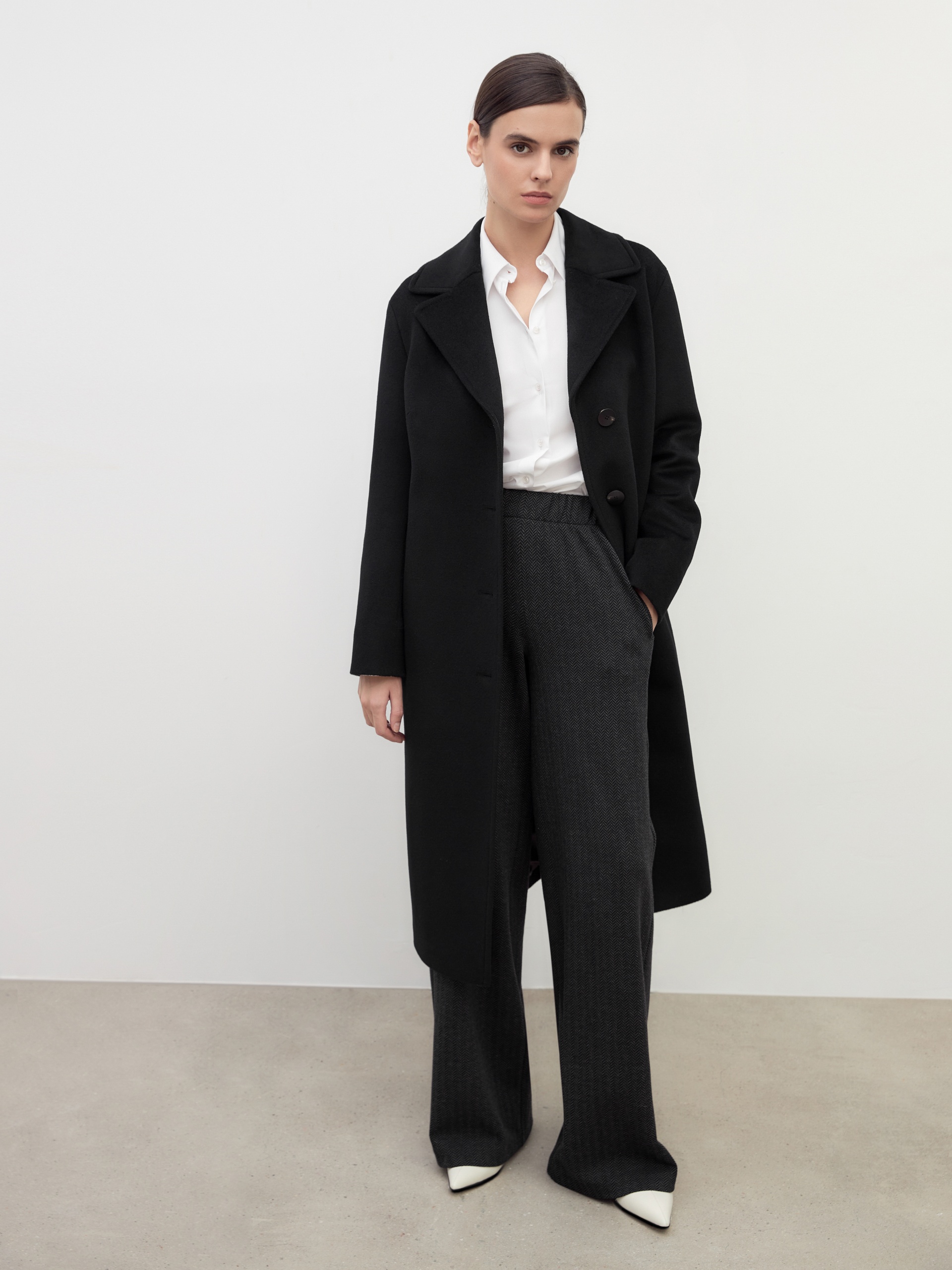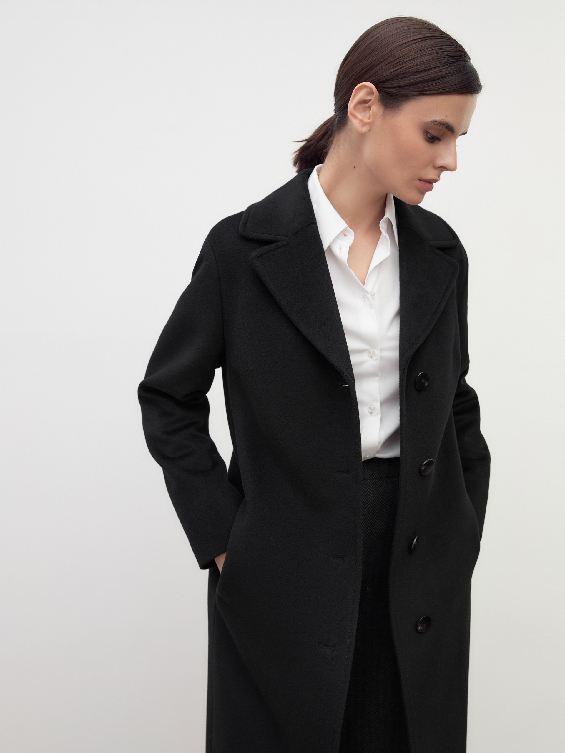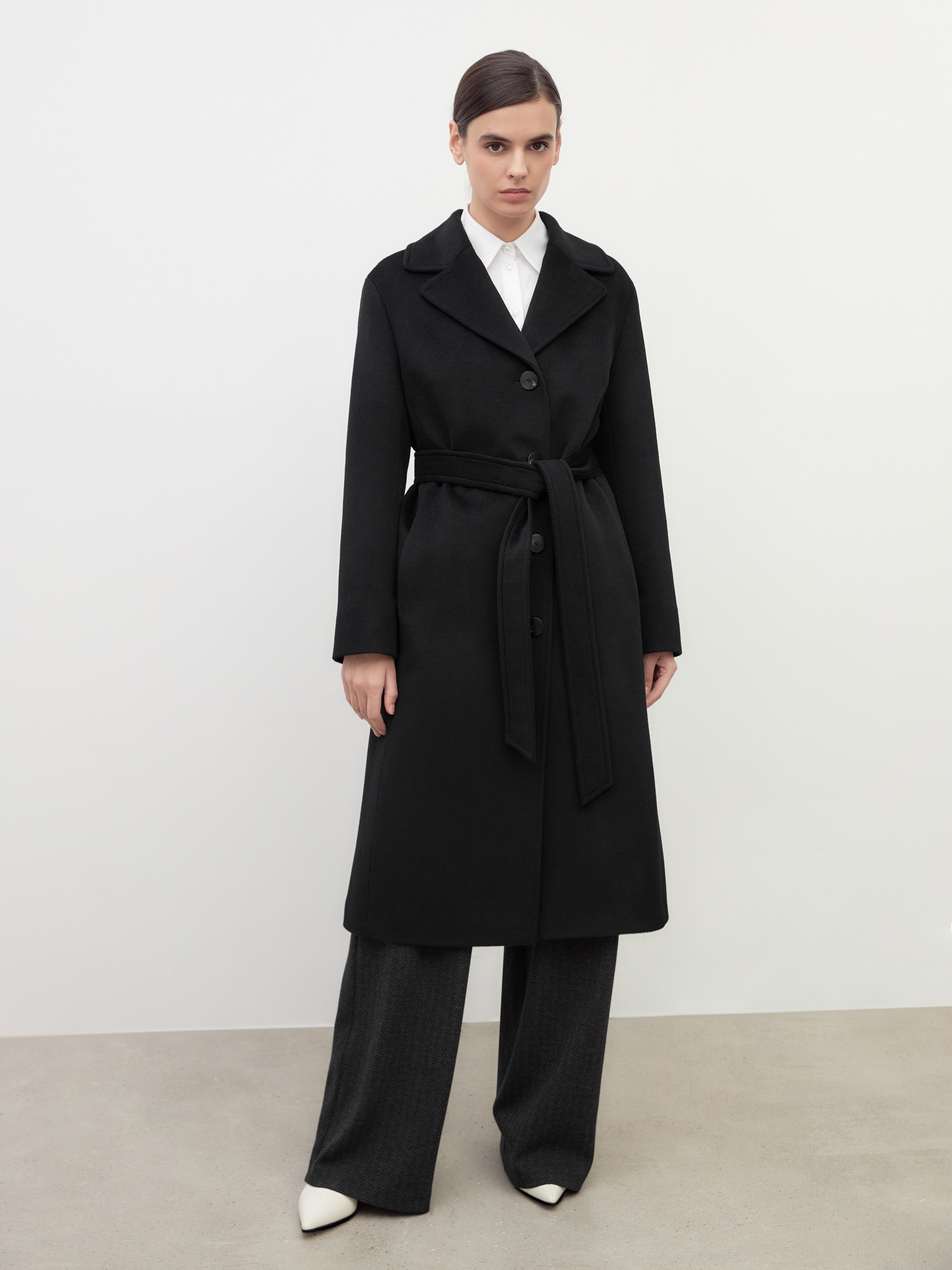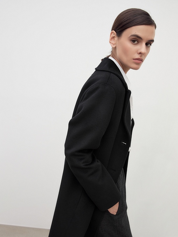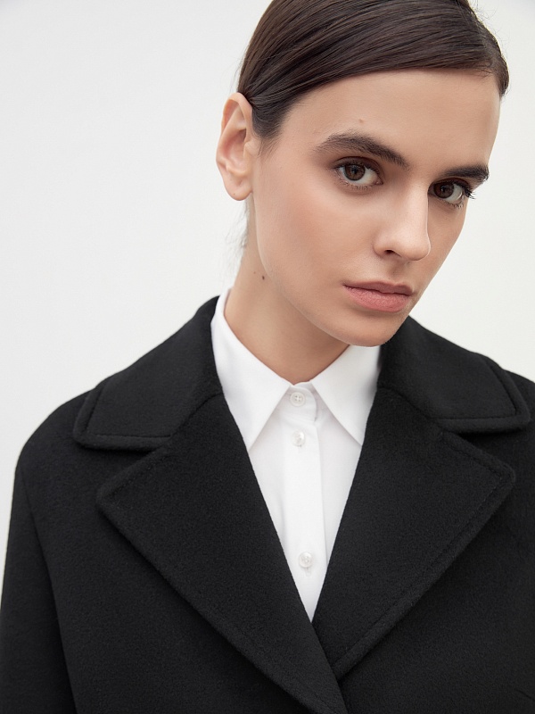 Однобортное пальто полуприлегающего силуэта в благородном черном цвете. Пальто сшито из премиальной ворсовой ткани с высоким содержанием шерсти. Пальто имеет классический английский воротник и спокойный втачной рукав со спущенной линией плеча. Низ рукава с отворачивающимися манжетами по низу. Мягкий женственный силуэт достигается за счет рельефных швов по переду и спинке. Спереди в рельефах прячутся вместительные карманы. В среднем шве спинки располагается высокая шлица. Образ завершает пояс из основной ткани. А для наилучшей защиты от непогоды пальто выполнено с использованием высокотехнологичной мембраны RaftPro. Произведено в Санкт-Петербурге.