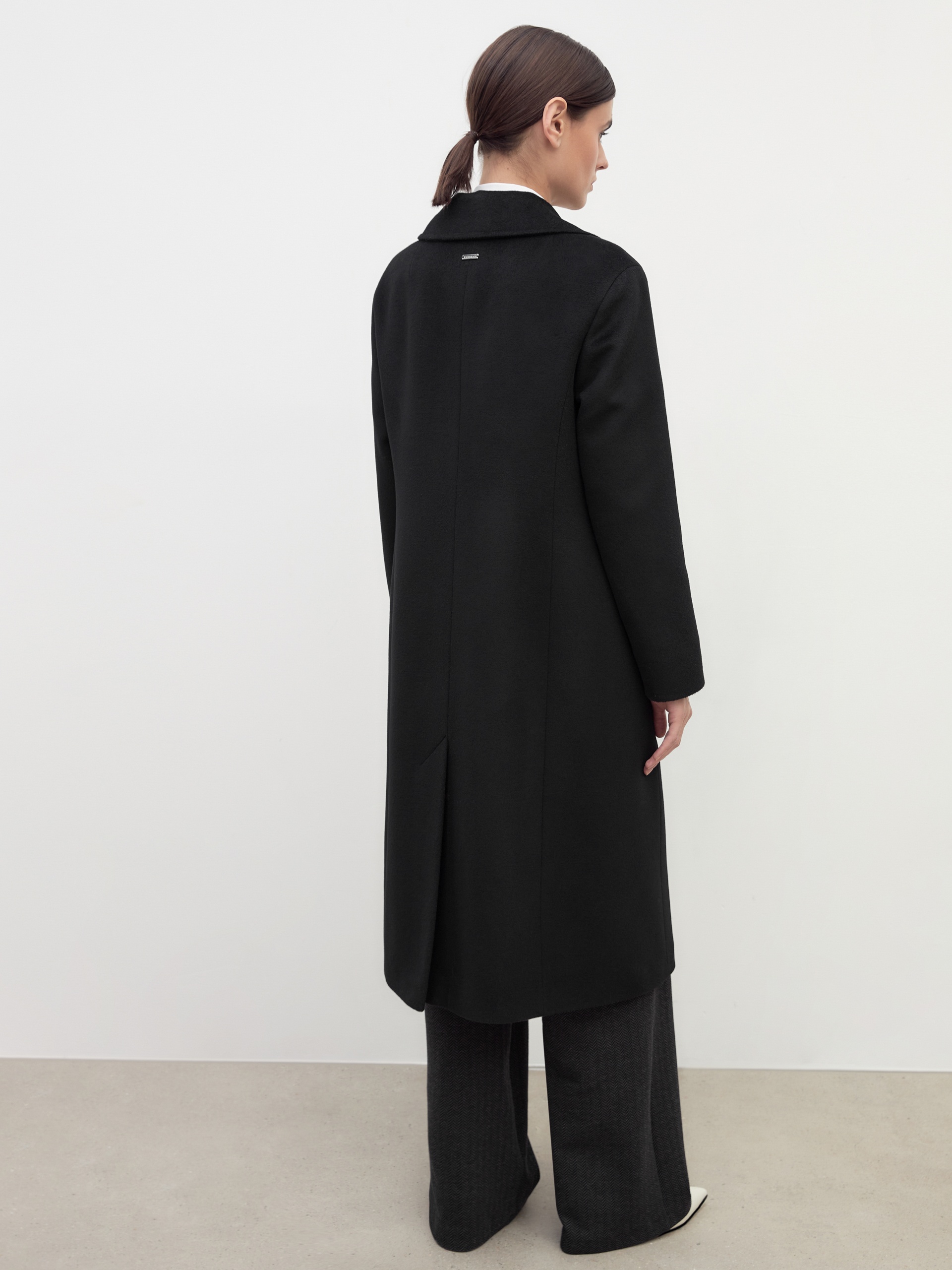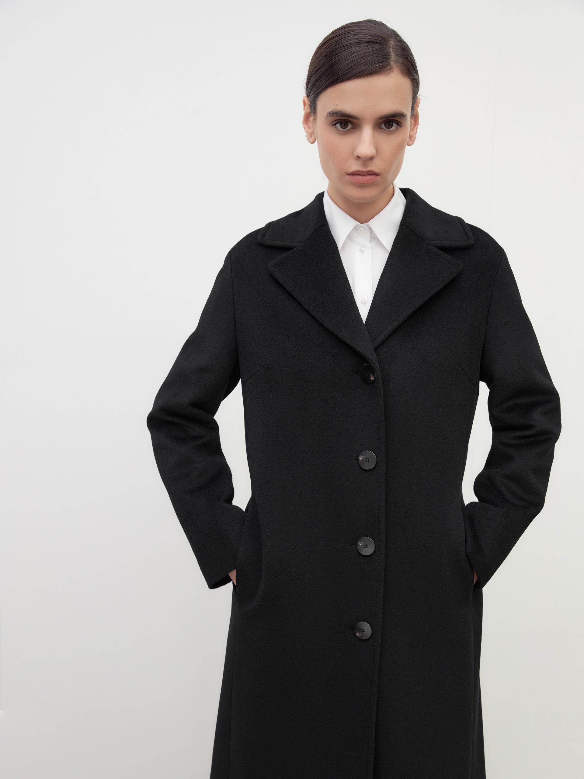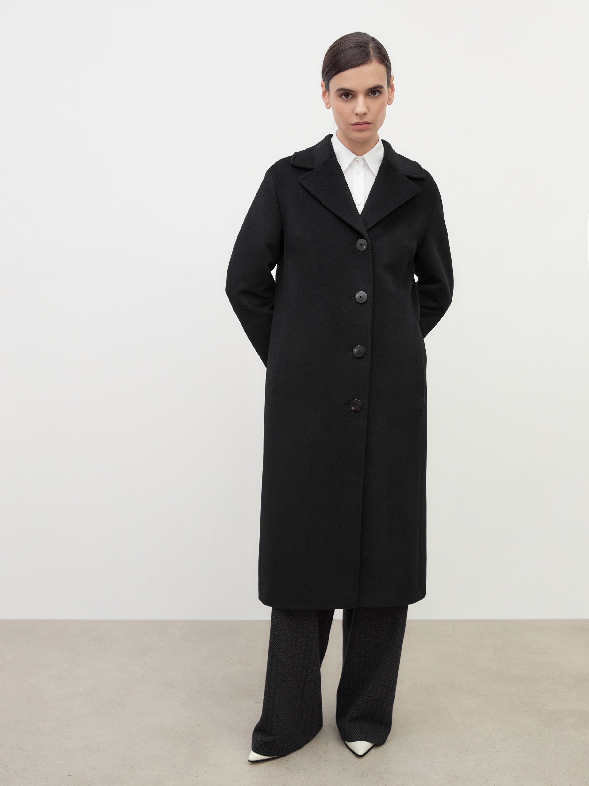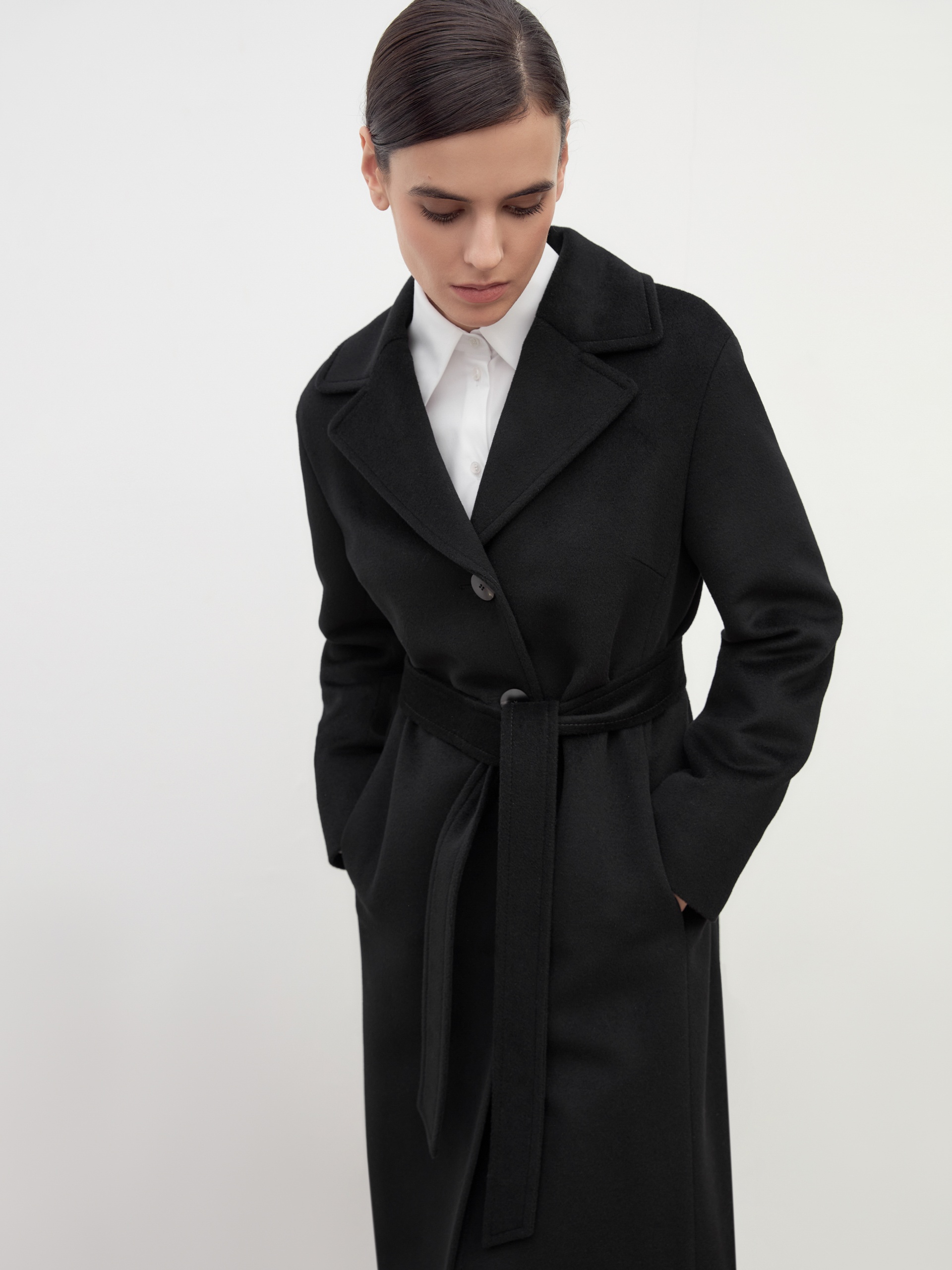 Однобортное пальто полуприлегающего силуэта в благородном черном цвете. Пальто сшито из премиальной ворсовой ткани с высоким содержанием шерсти. Пальто имеет классический английский воротник и спокойный втачной рукав со спущенной линией плеча. Низ рукава с отворачивающимися манжетами по низу. Мягкий женственный силуэт достигается за счет рельефных швов по переду и спинке. Спереди в рельефах прячутся вместительные карманы. В среднем шве спинки располагается высокая шлица. Образ завершает пояс из основной ткани. А для наилучшей защиты от непогоды пальто выполнено с использованием высокотехнологичной мембраны RaftPro. Произведено в Санкт-Петербурге.