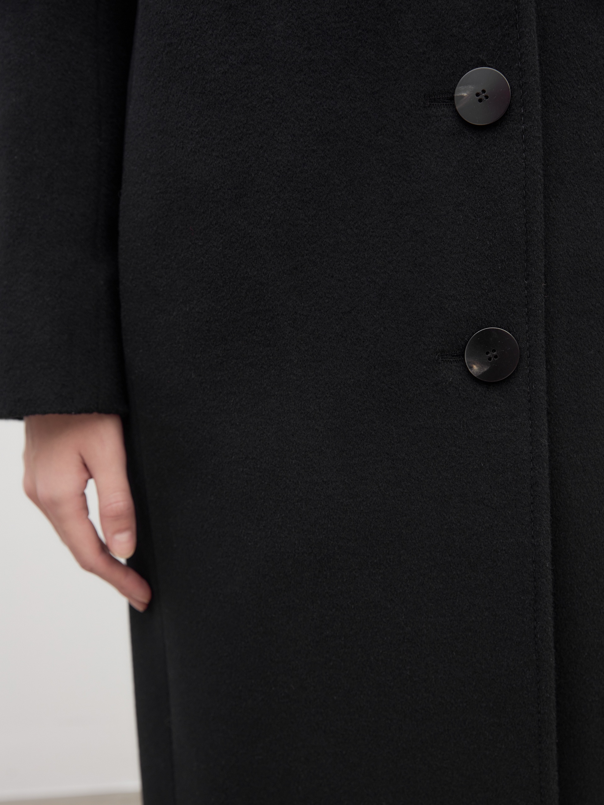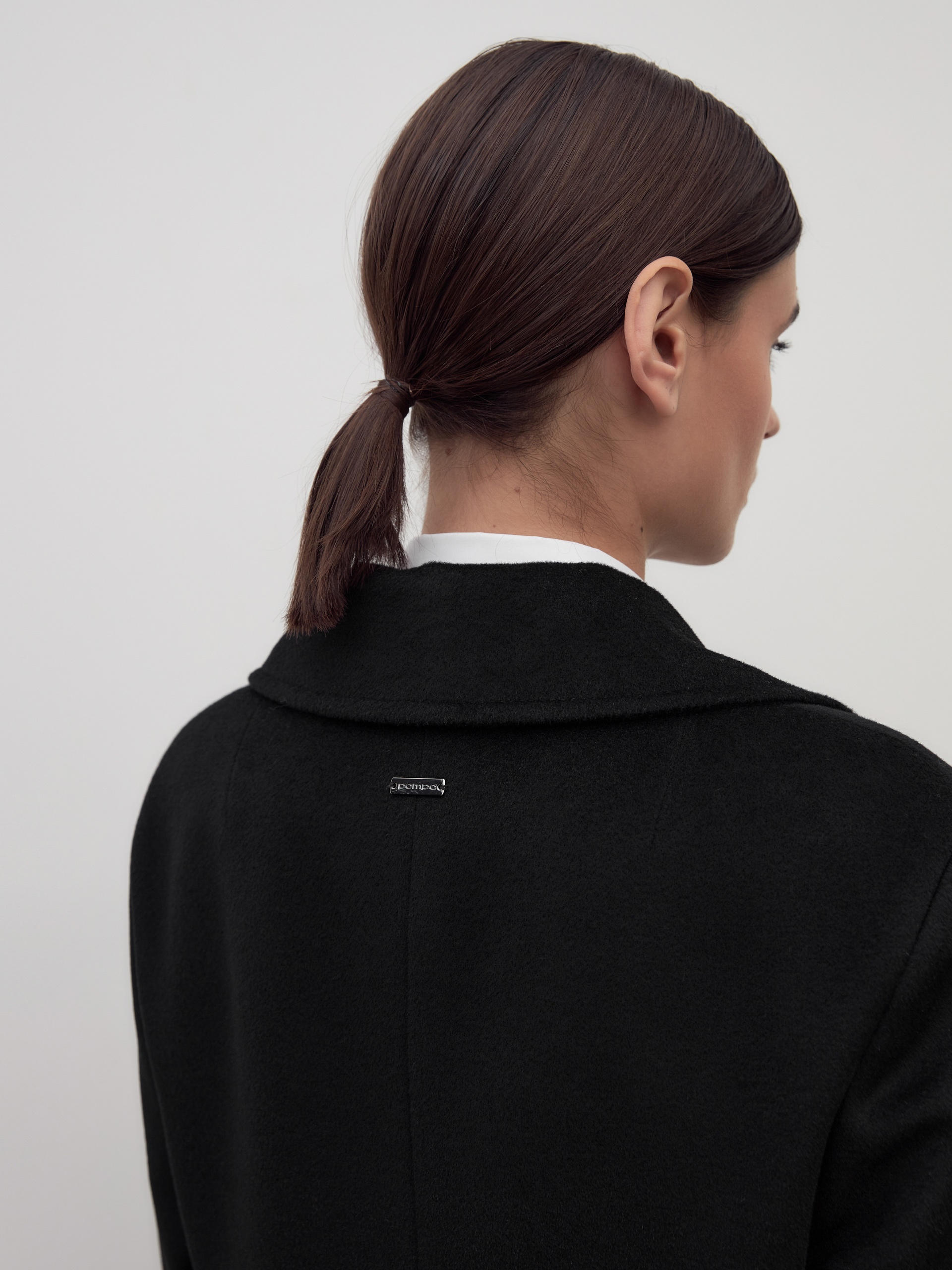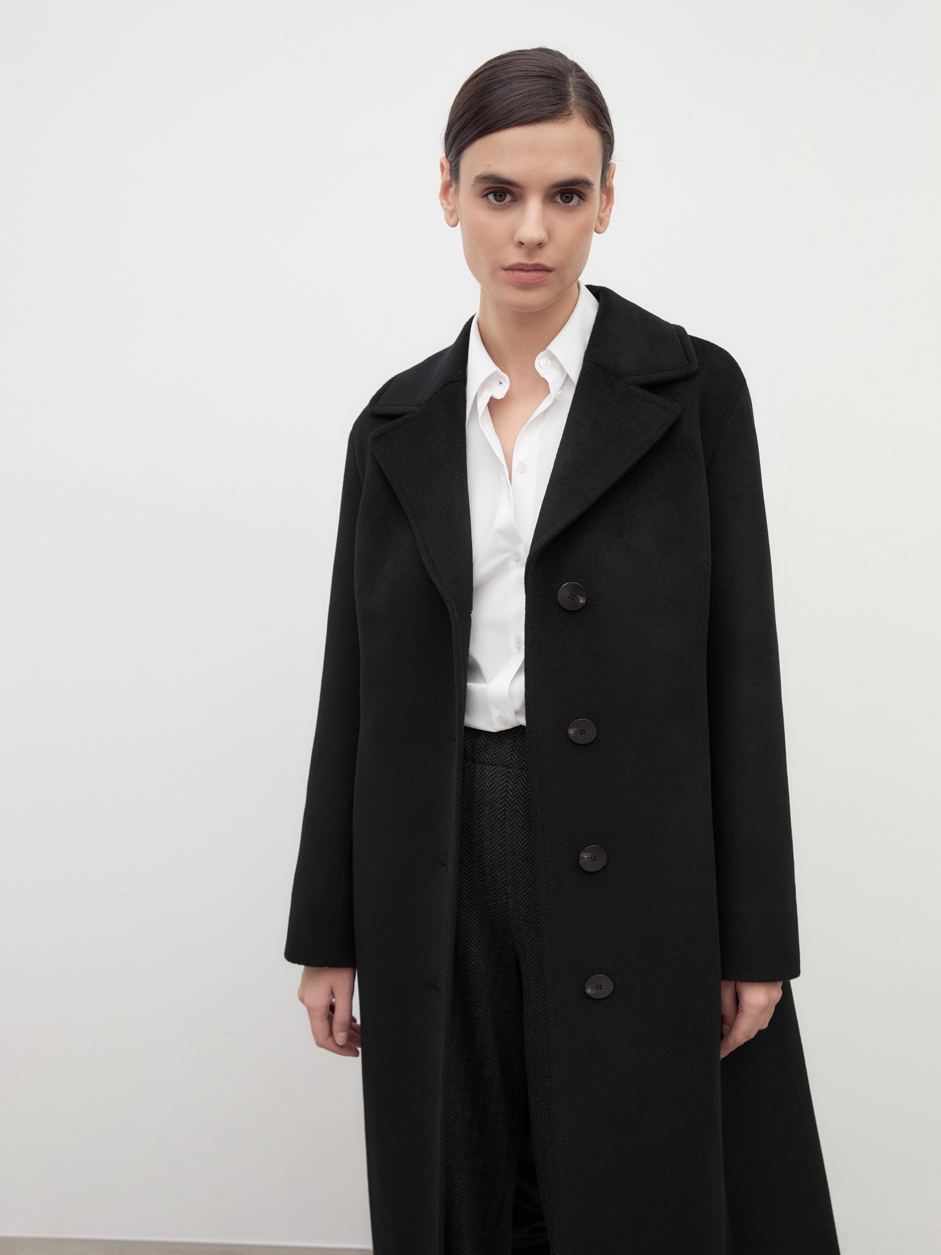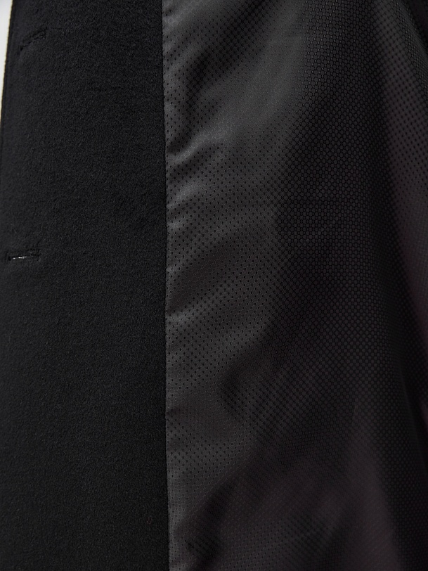 Однобортное пальто полуприлегающего силуэта в благородном черном цвете. Пальто сшито из премиальной ворсовой ткани с высоким содержанием шерсти. Пальто имеет классический английский воротник и спокойный втачной рукав со спущенной линией плеча. Низ рукава с отворачивающимися манжетами по низу. Мягкий женственный силуэт достигается за счет рельефных швов по переду и спинке. Спереди в рельефах прячутся вместительные карманы. В среднем шве спинки располагается высокая шлица. Образ завершает пояс из основной ткани. А для наилучшей защиты от непогоды пальто выполнено с использованием высокотехнологичной мембраны RaftPro. Произведено в Санкт-Петербурге.