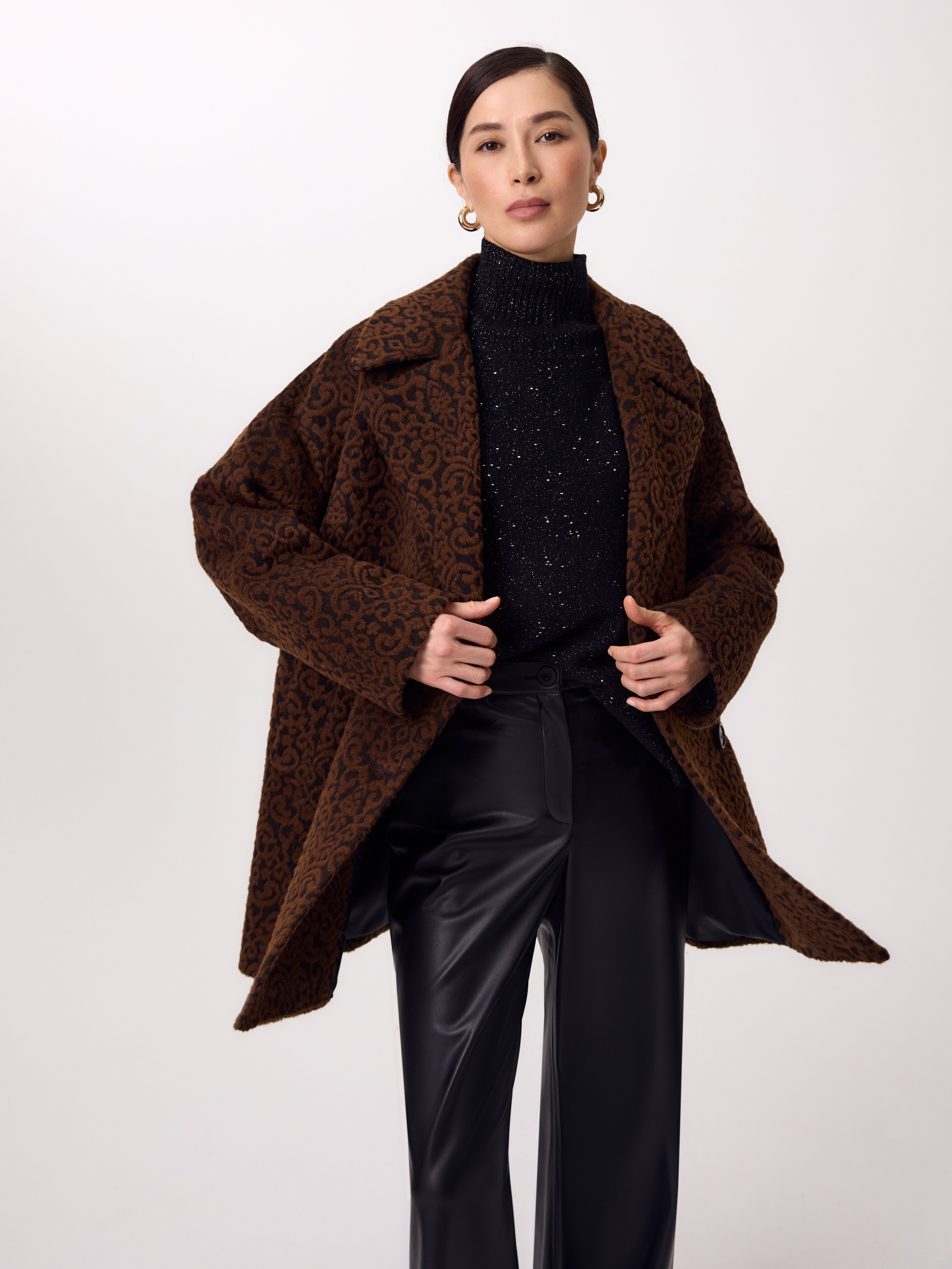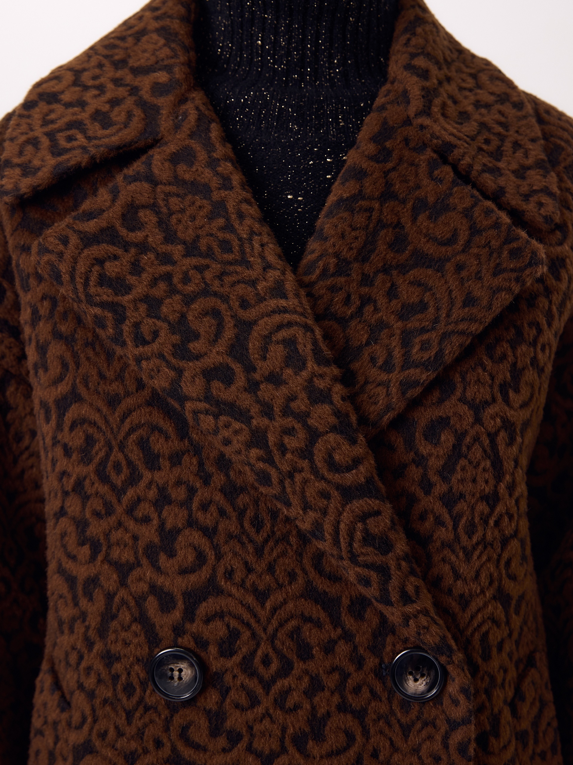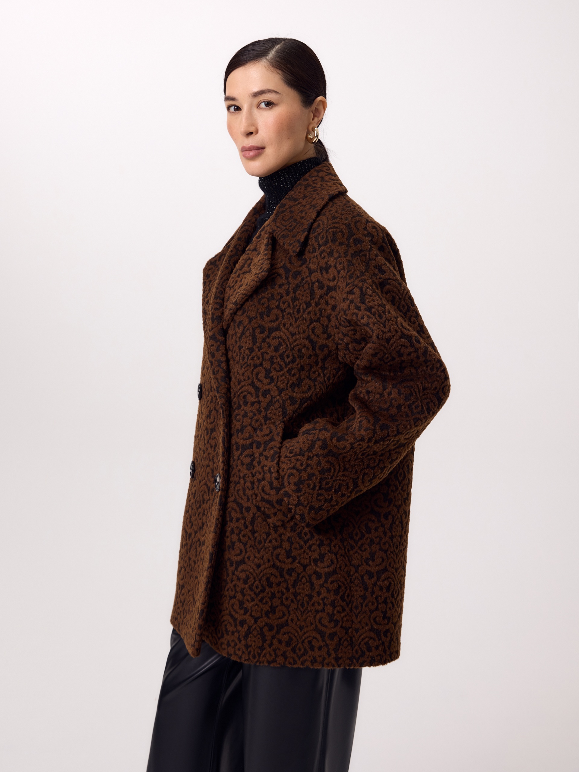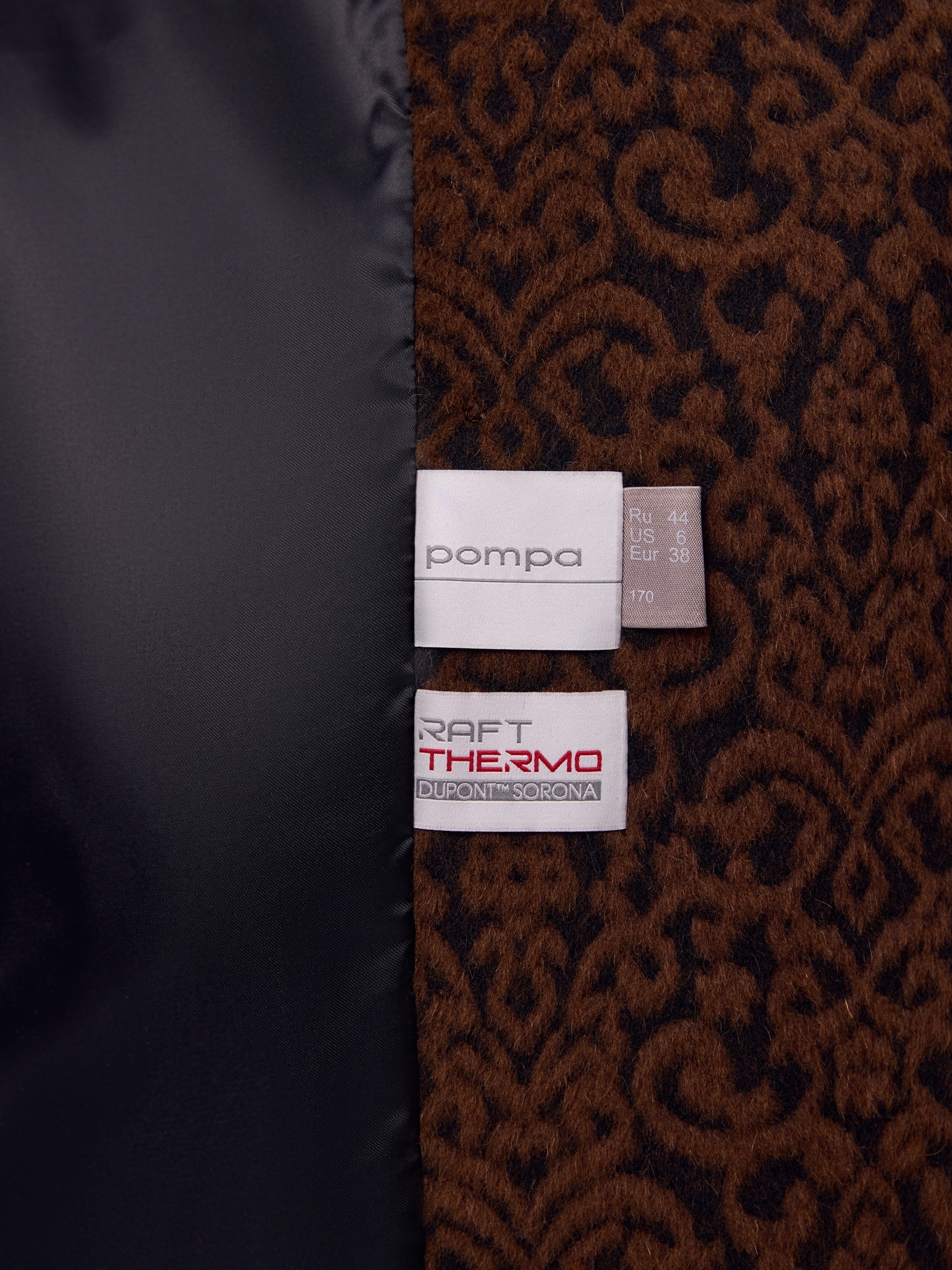 Двубортное укороченное пальто прямого силуэта в коричнево-черном цвете. Полупальто сшито из премиальной шерстяной ворсовой ткани, состоящей из нежной шерсти альпаки, с вытканным на ней узором. Пальто имеет рубашечный рукав, не стесняющий движений, широкий английский воротник, глубокие карманы с листочками. Нижний воротник полностью сделан из ткани отделки черного цвета. Полупальто декорировано отделочными строчками, застегивается на два ряда стильных черных пуговиц. Для наилучшей защиты от непогоды изделие выполнено с использованием высокотехнологичной мембраны RaftPro, а спинка пальто имеет дополнительное утепление. Произведено в Санкт-Петербурге....