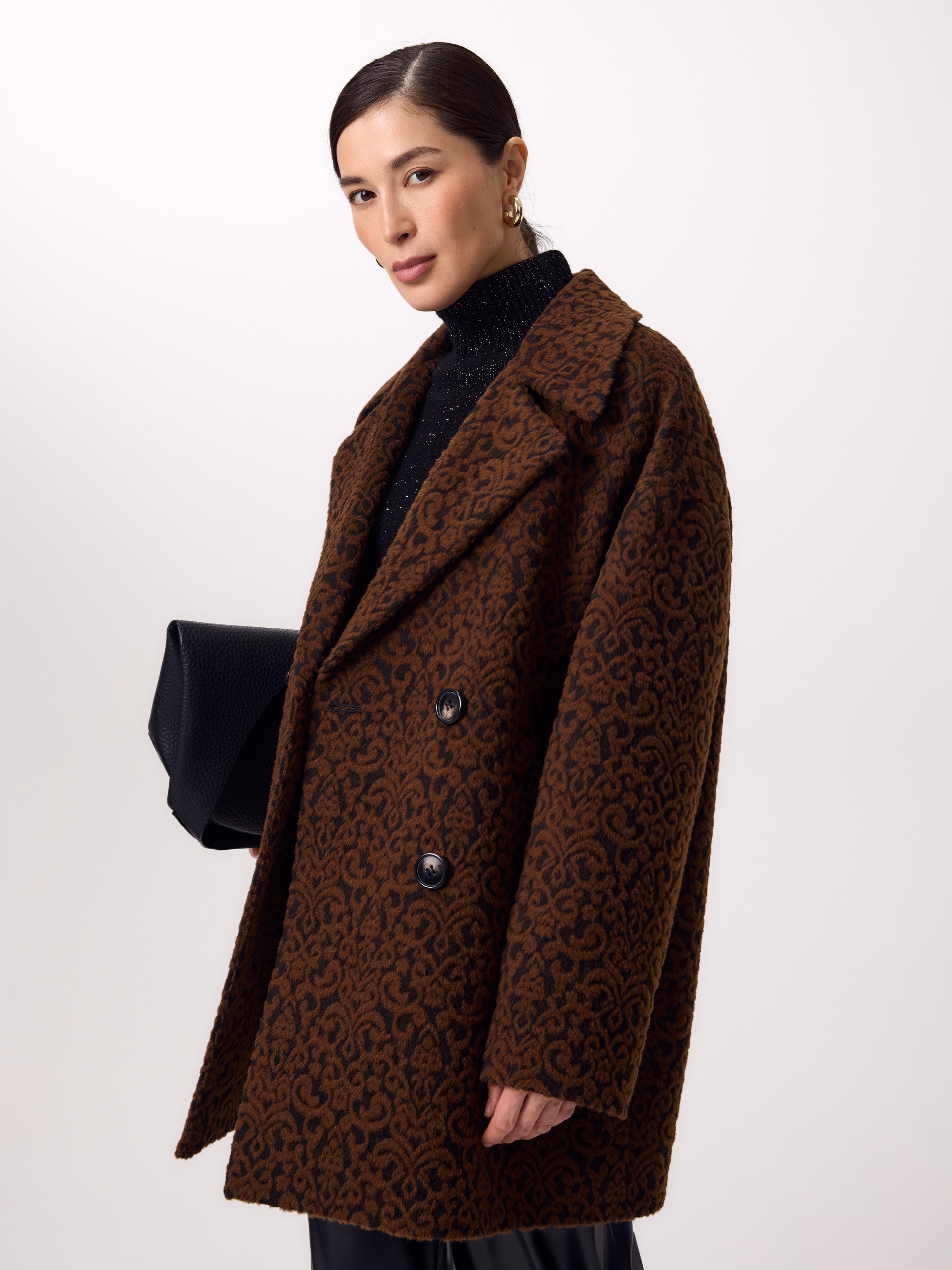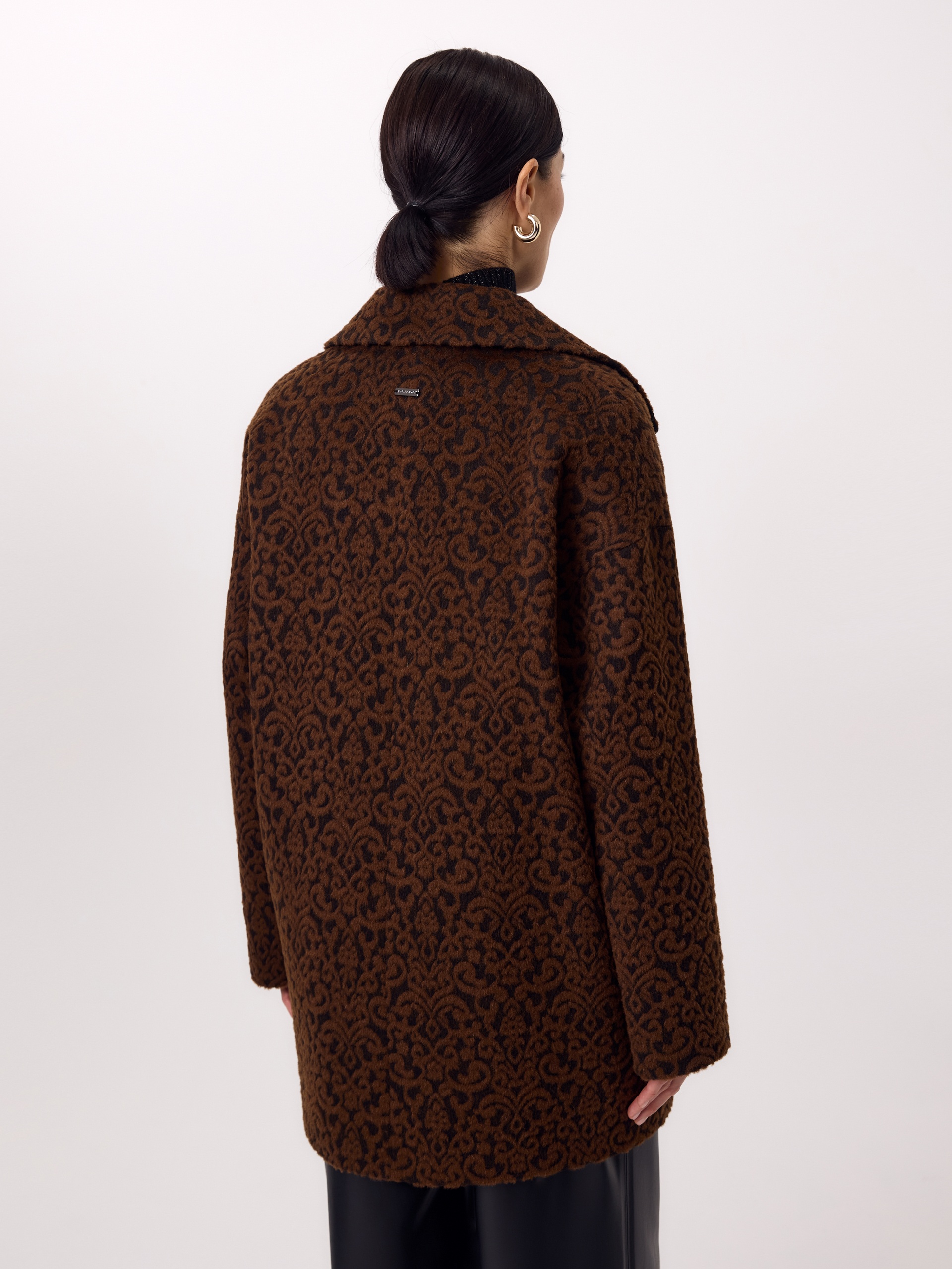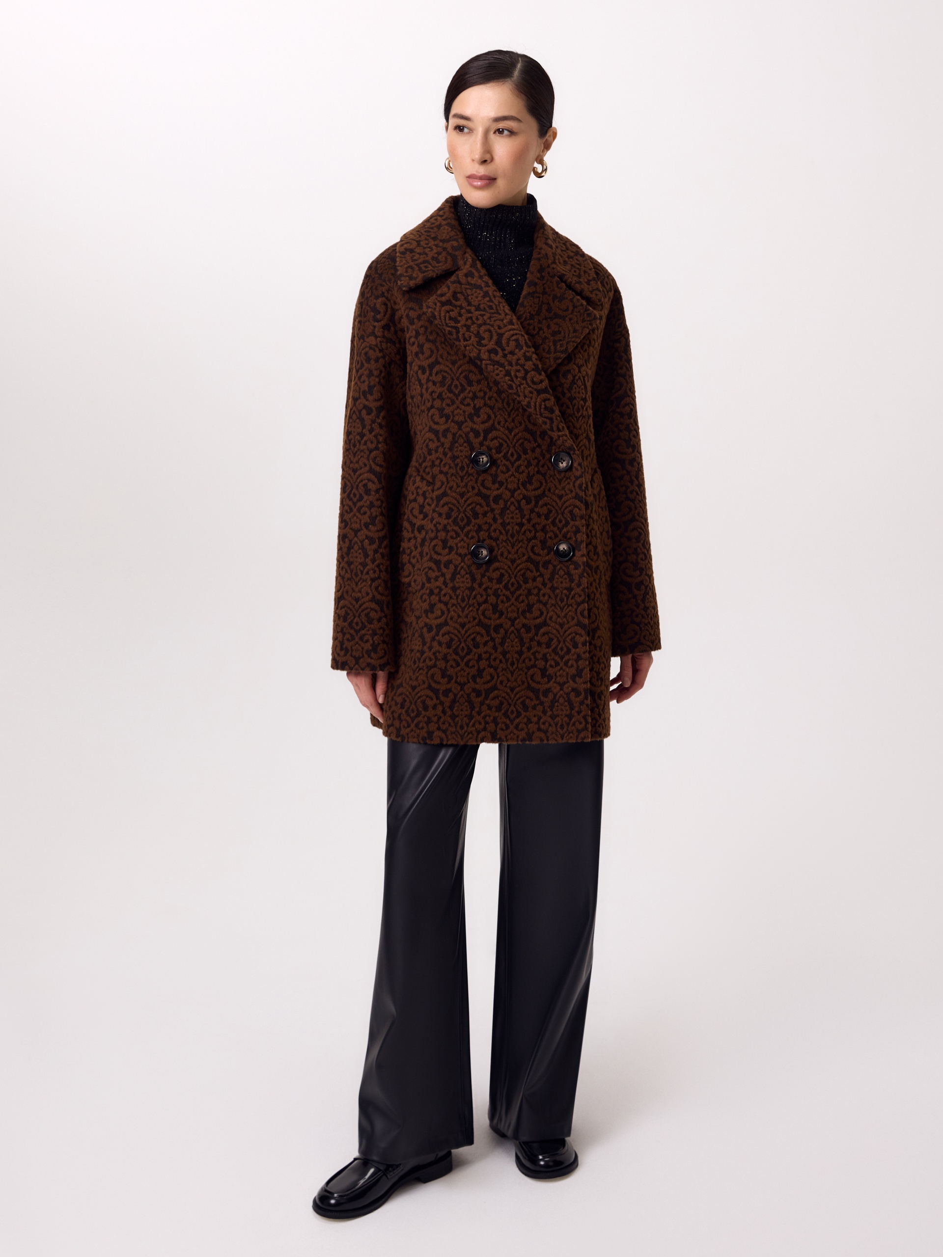 Двубортное укороченное пальто прямого силуэта в коричнево-черном цвете. Полупальто сшито из премиальной шерстяной ворсовой ткани, состоящей из нежной шерсти альпаки, с вытканным на ней узором. Пальто имеет рубашечный рукав, не стесняющий движений, широкий английский воротник, глубокие карманы с листочками. Нижний воротник полностью сделан из ткани отделки черного цвета. Полупальто декорировано отделочными строчками, застегивается на два ряда стильных черных пуговиц. Для наилучшей защиты от непогоды изделие выполнено с использованием высокотехнологичной мембраны RaftPro, а спинка пальто имеет дополнительное утепление. Произведено в Санкт-Петербурге....