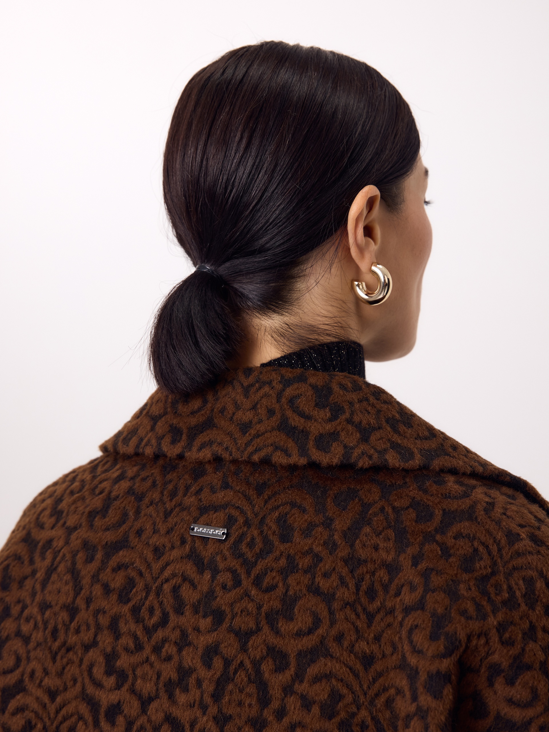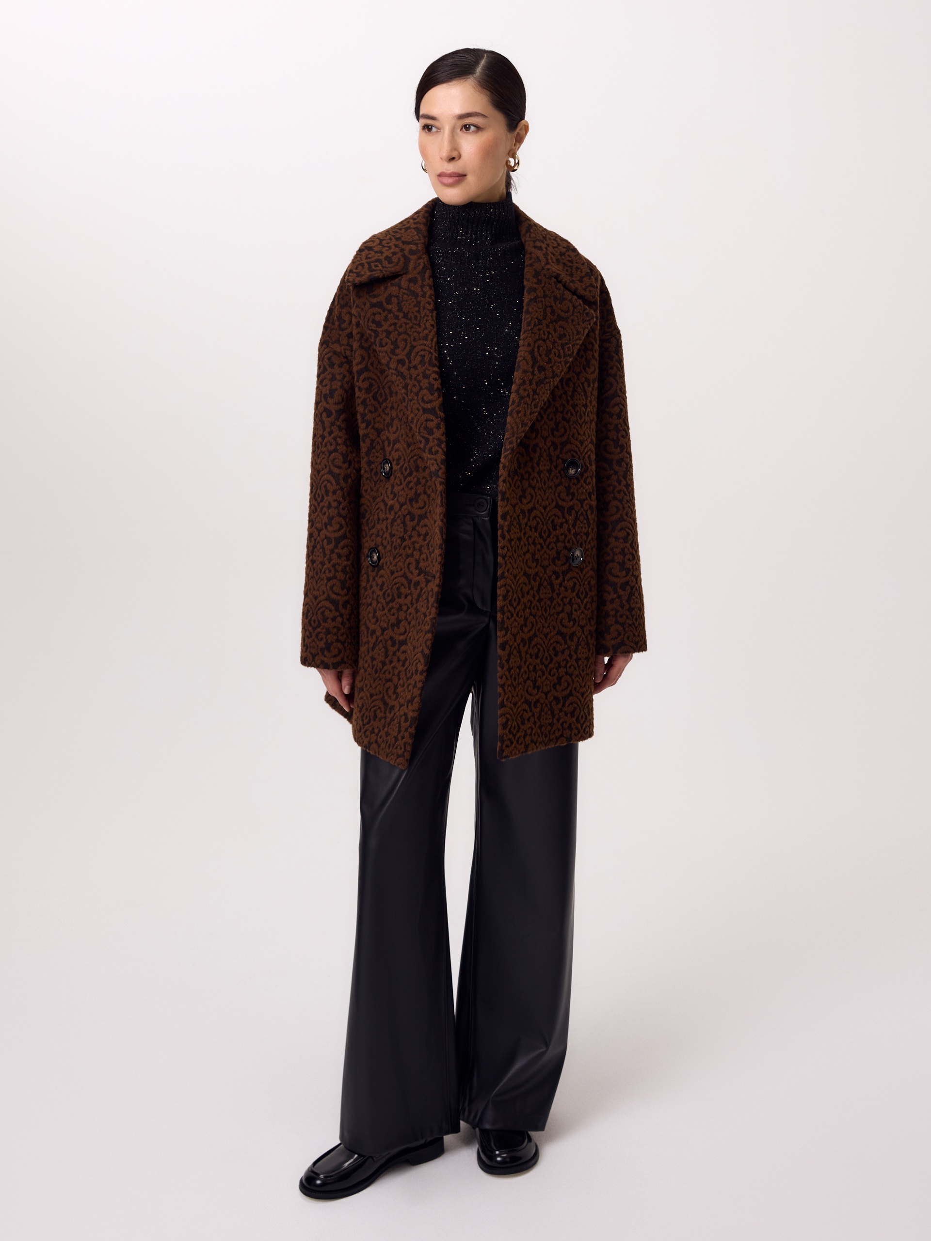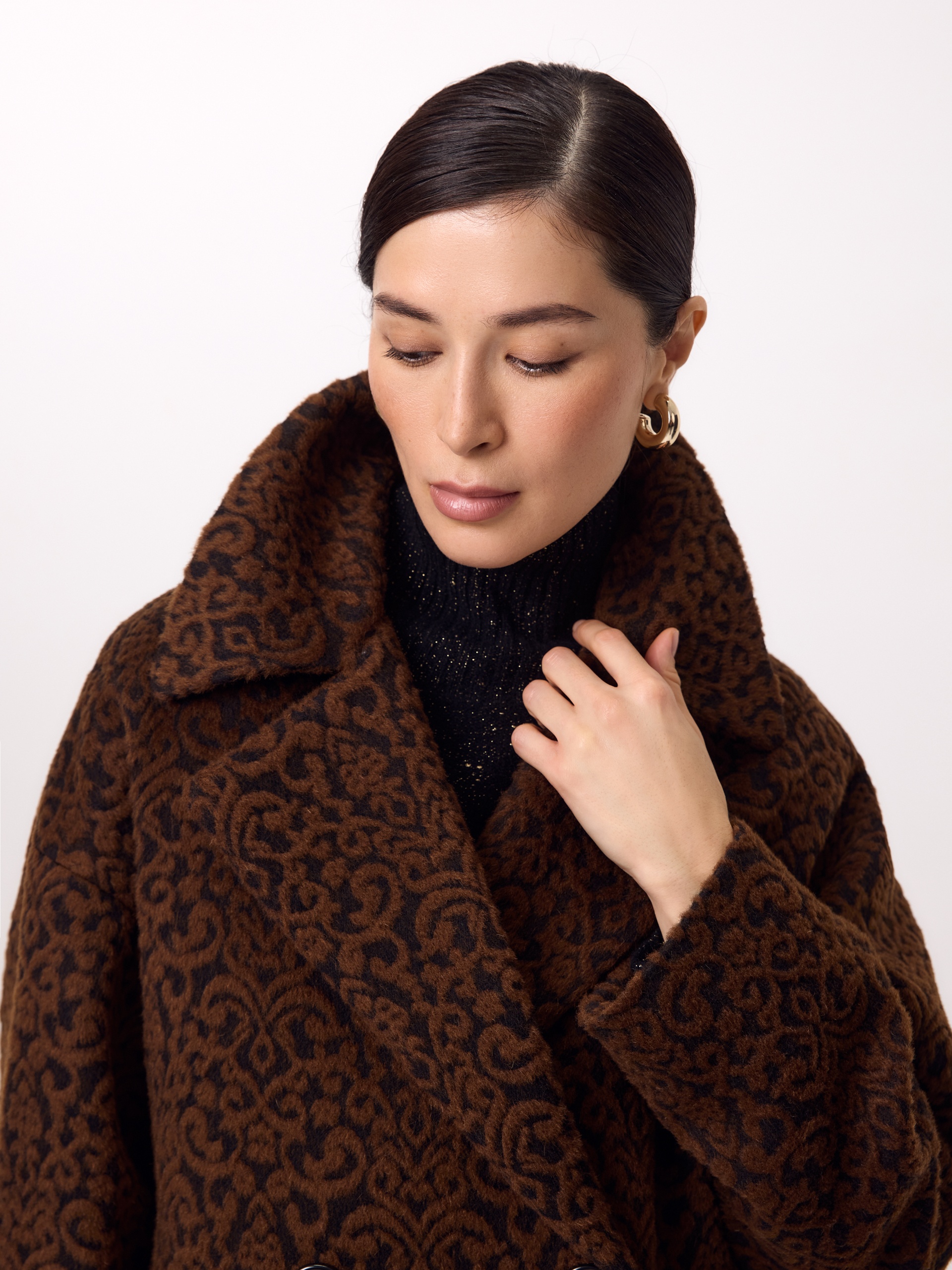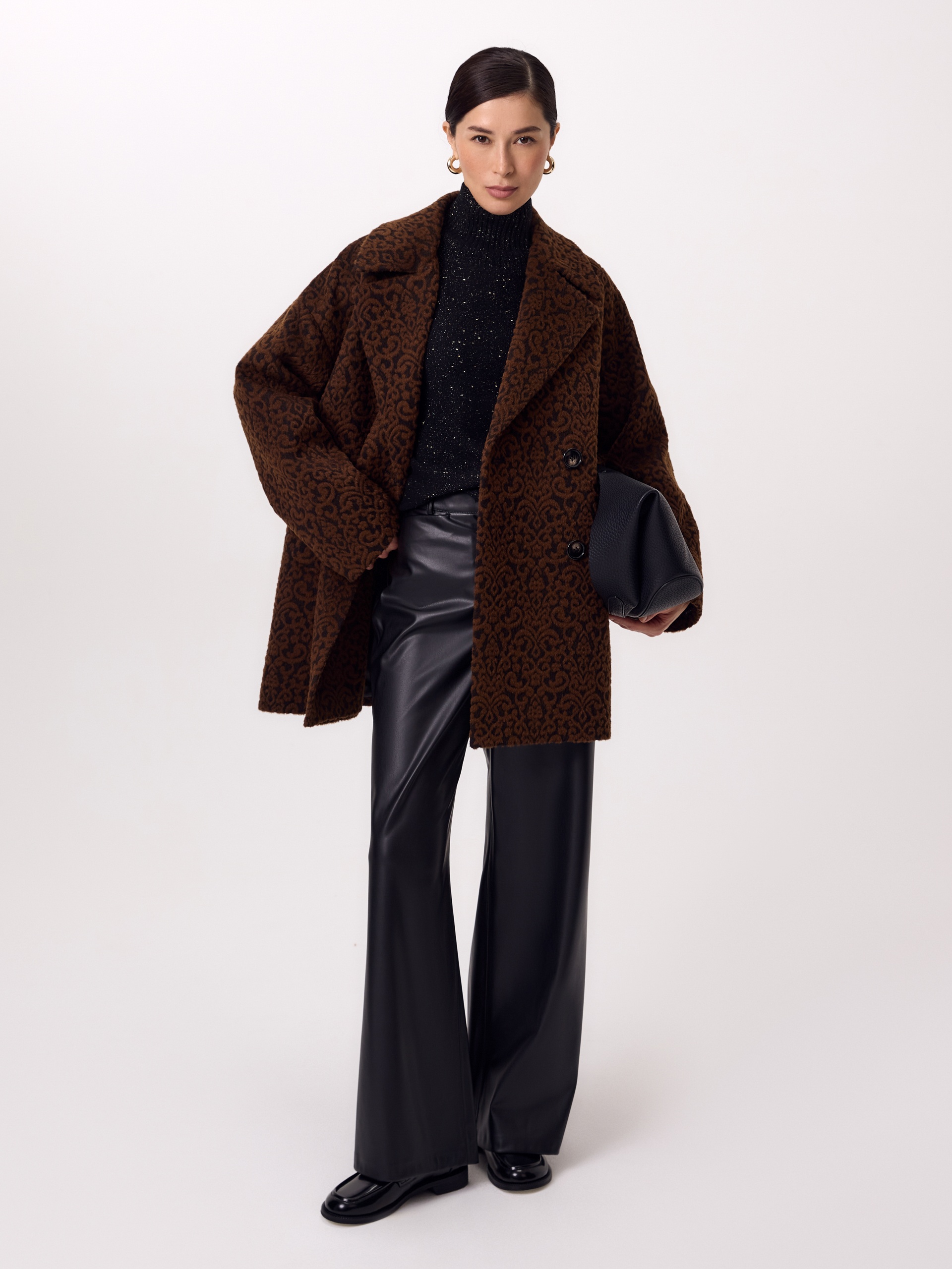 Двубортное укороченное пальто прямого силуэта в коричнево-черном цвете. Полупальто сшито из премиальной шерстяной ворсовой ткани, состоящей из нежной шерсти альпаки, с вытканным на ней узором. Пальто имеет рубашечный рукав, не стесняющий движений, широкий английский воротник, глубокие карманы с листочками. Нижний воротник полностью сделан из ткани отделки черного цвета. Полупальто декорировано отделочными строчками, застегивается на два ряда стильных черных пуговиц. Для наилучшей защиты от непогоды изделие выполнено с использованием высокотехнологичной мембраны RaftPro, а спинка пальто имеет дополнительное утепление. Произведено в Санкт-Петербурге....