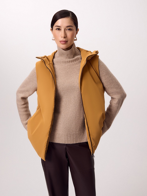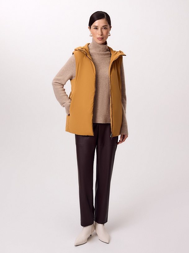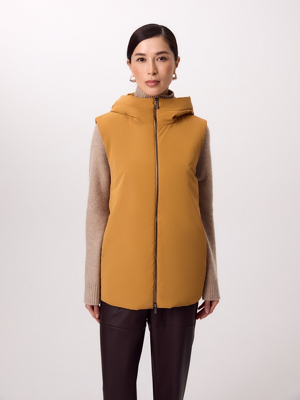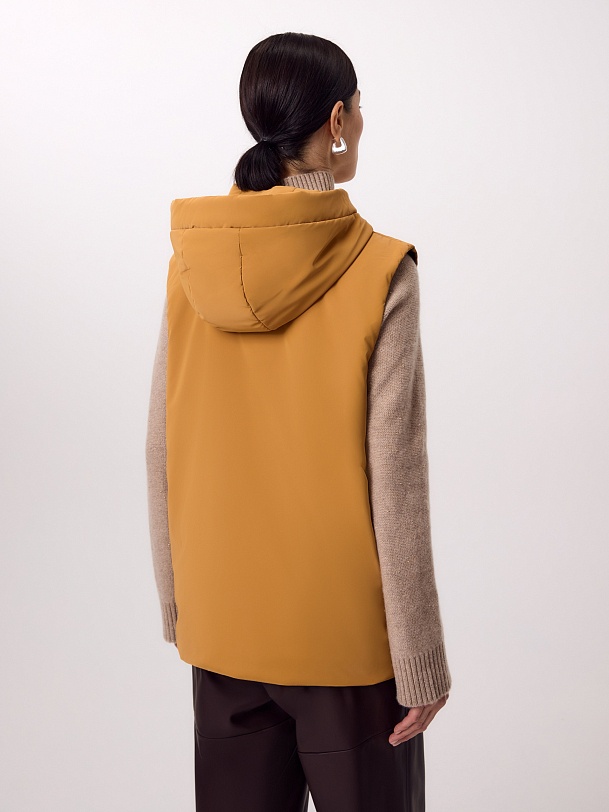 Утепленный жилет прямого силуэта в ярком желтом оттенке шафрана. Жилет изготовлен из высококачественной плащевой ткани с водоотталкивающим покрытием. Жилет имеет высокий воротник-стойку, переходящий в глубокий капюшон, и заведенные боковые швы. В швах находятся вместительные карманы, мешковина сделана из теплого флиса. Застегивается изделие на легкую надежную молнию. На спинке в качестве декоративного элемента располагается контрастная нашивка из репса. Такой жилет можно носить как самостоятельный элемент образа, так и под верхней одеждой для дополнительного тепла. Произведено в Санкт-Петербурге.