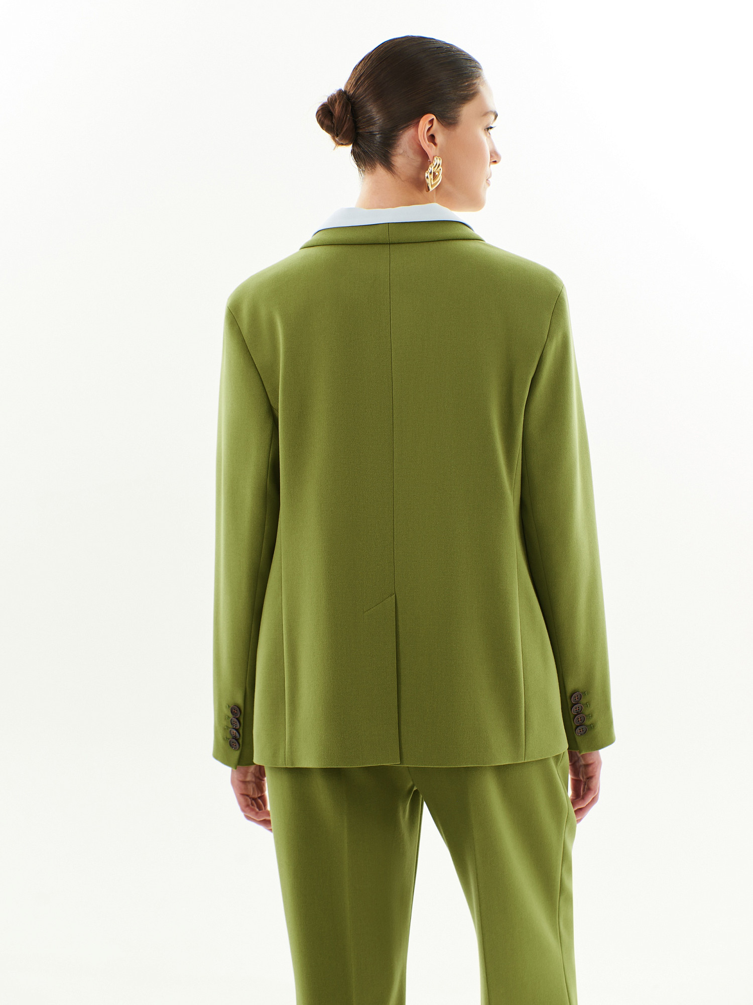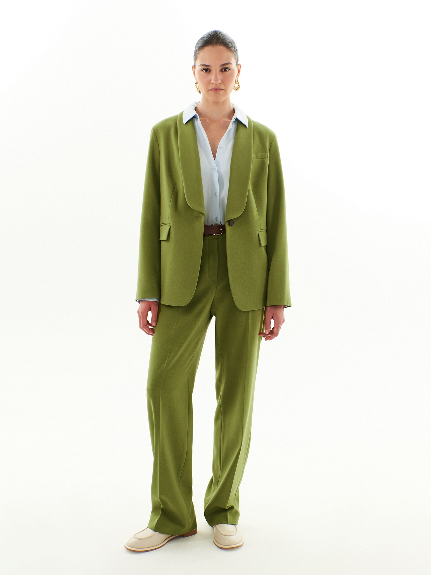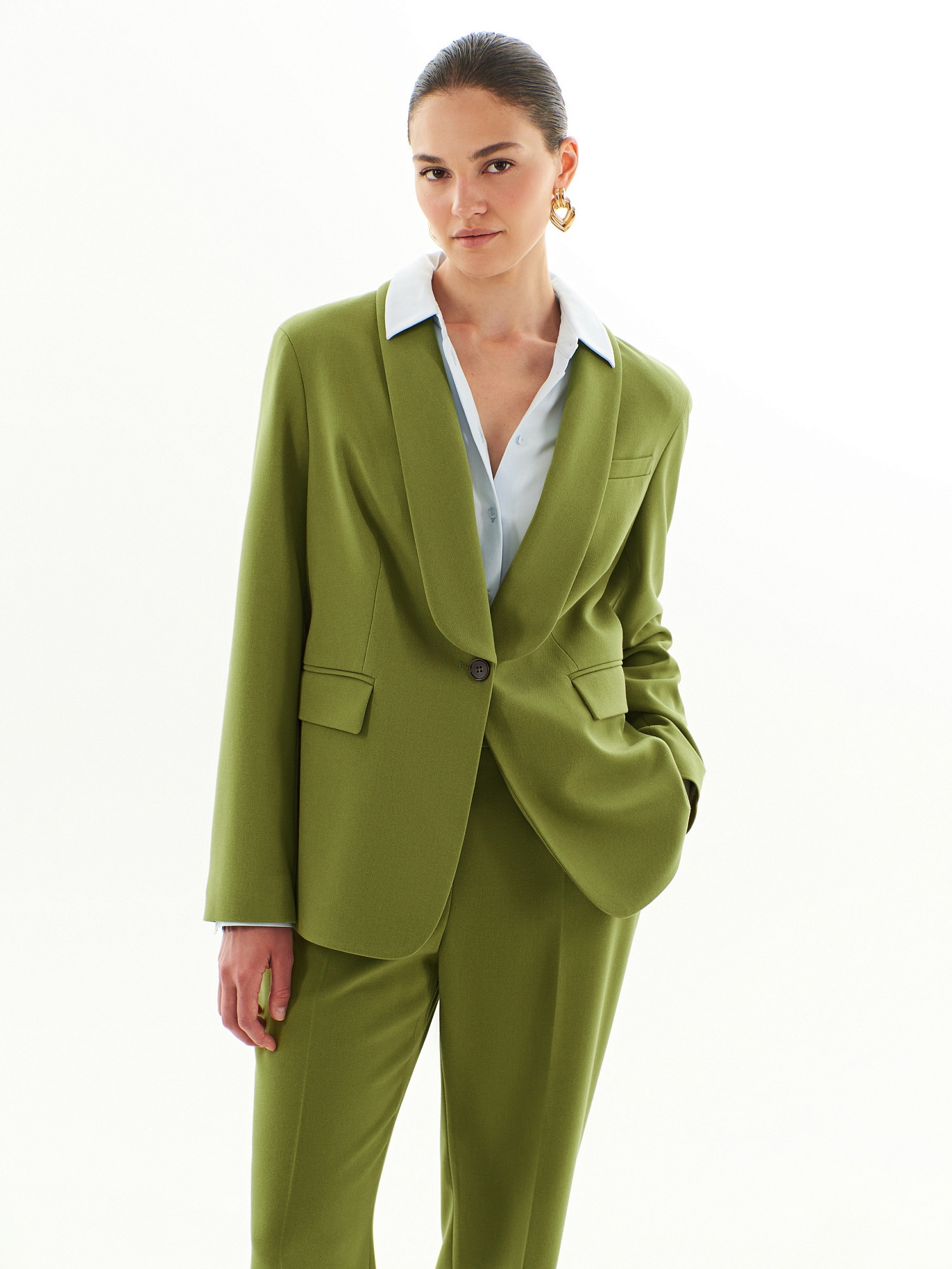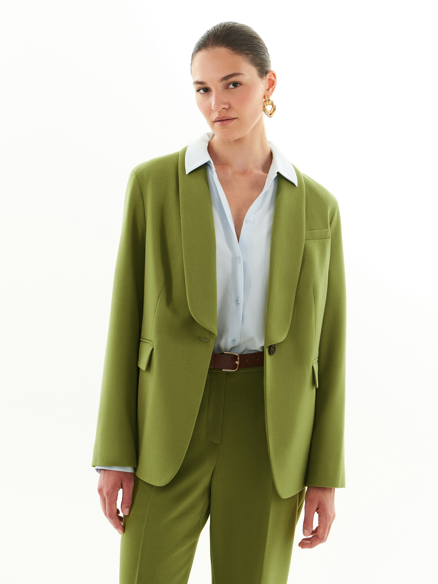 Полуприлегающий однобортный жакет из костюмной ткани в желто-зеленом цвете с воротником шалька на двух пуговицах. Спереди прорезной карман и клапан. Рукава полной длины. Жакет на подкладке.