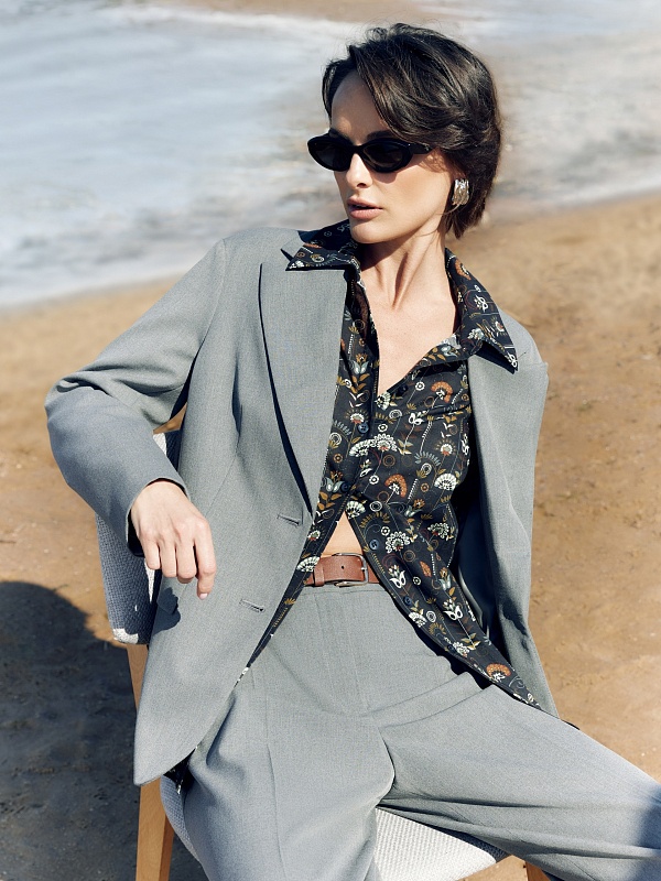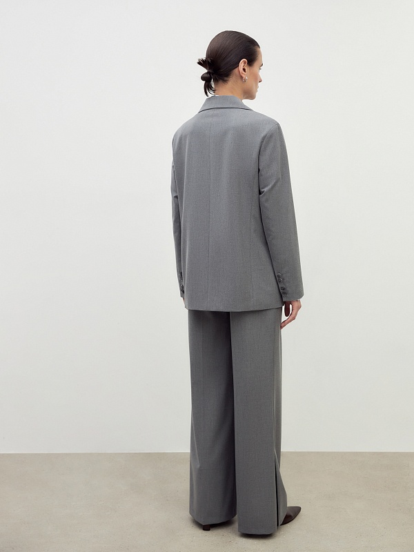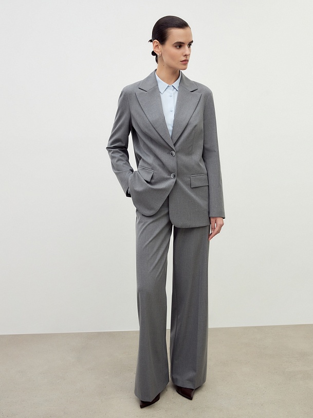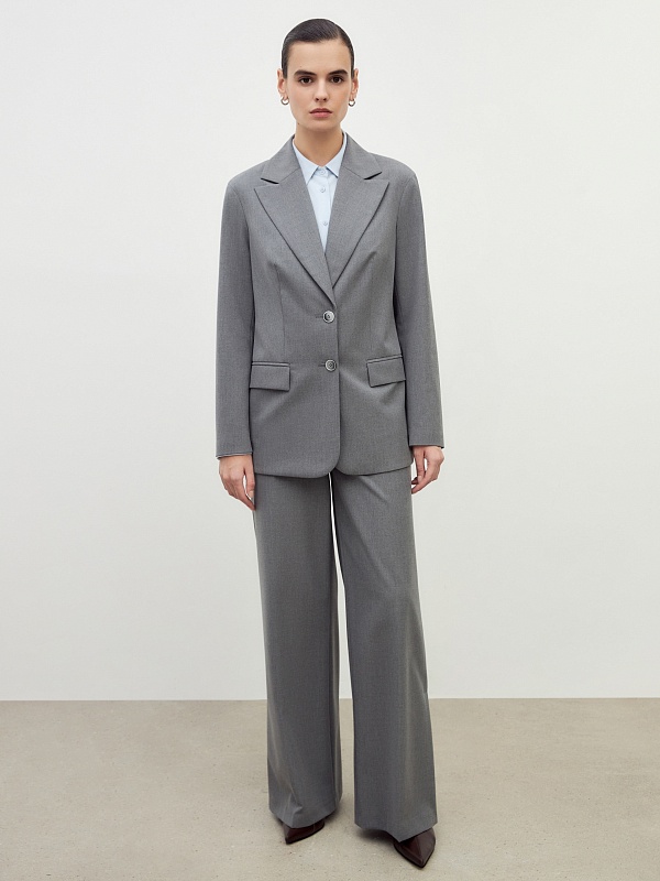Однобортный жакет на подкладке со спущенной линией плеча и округлыми лацканами. Жакет выполнен из костюмной ткани в сером цвет. Спереди прорезной карман и клапан. Жакет на подкладке