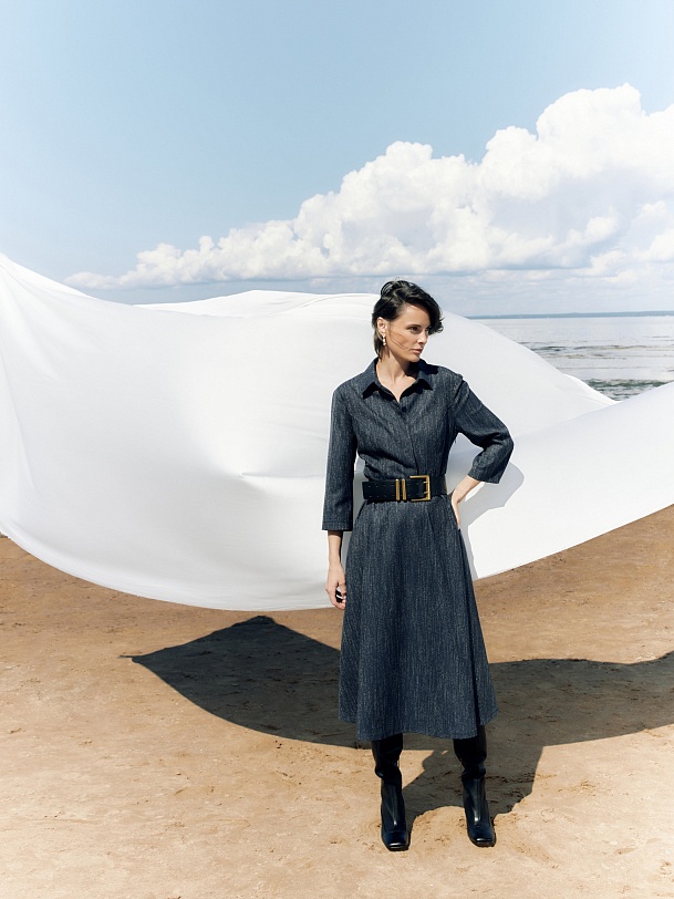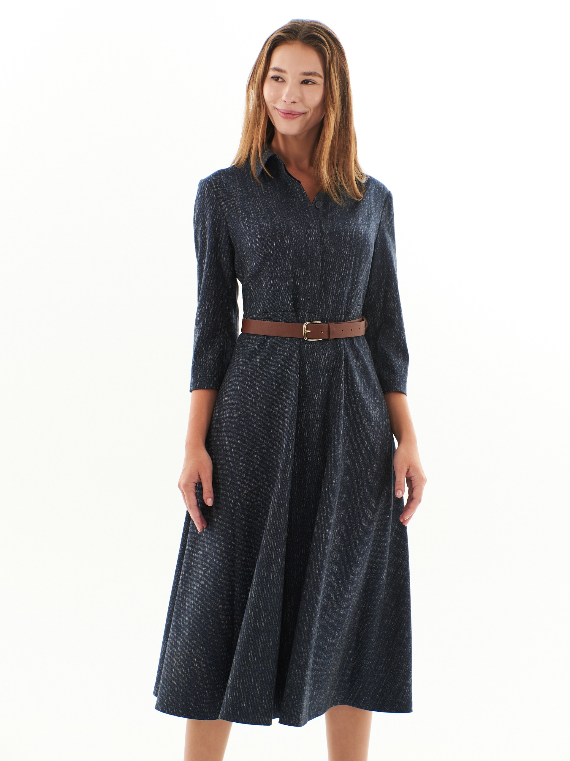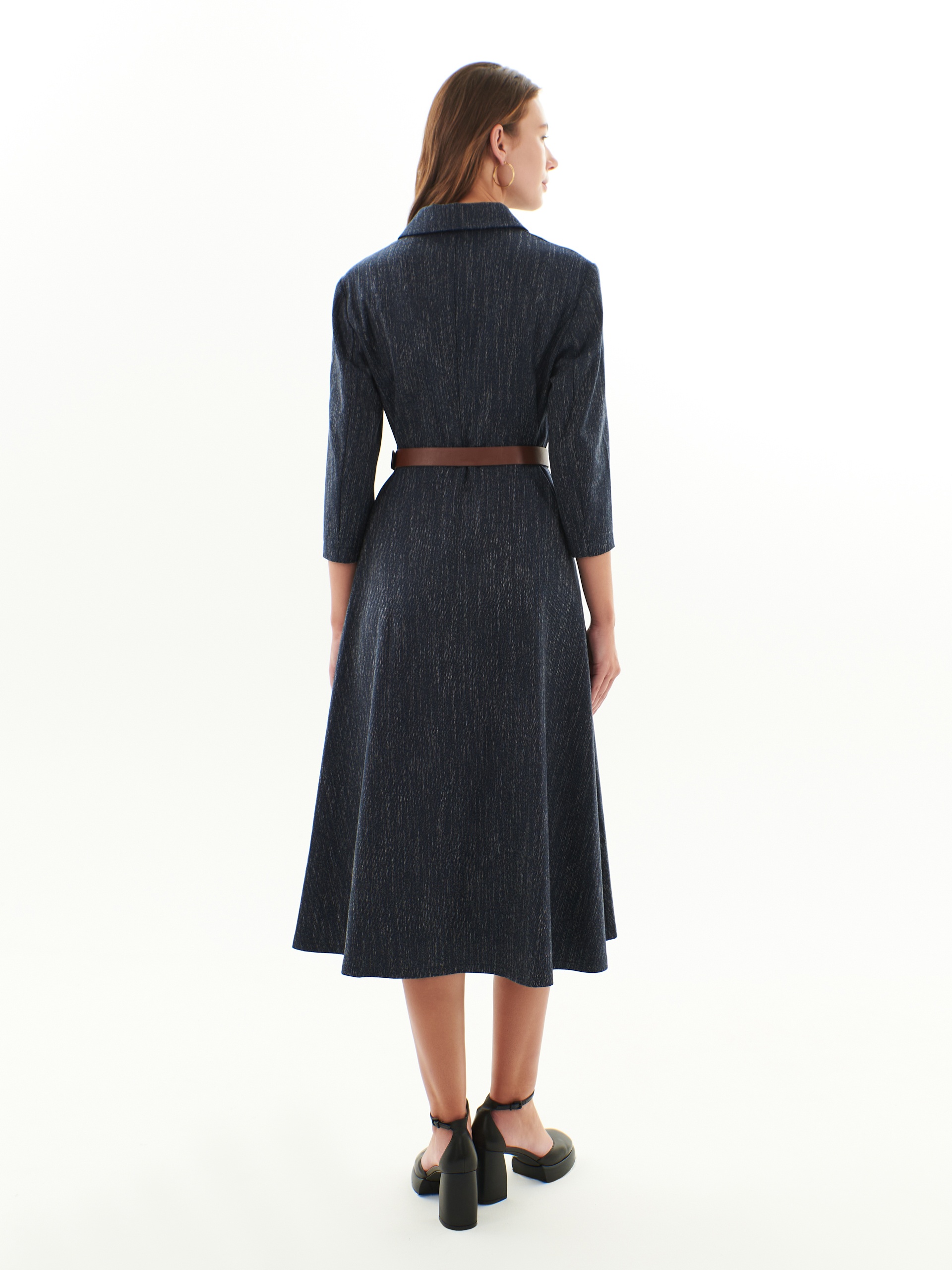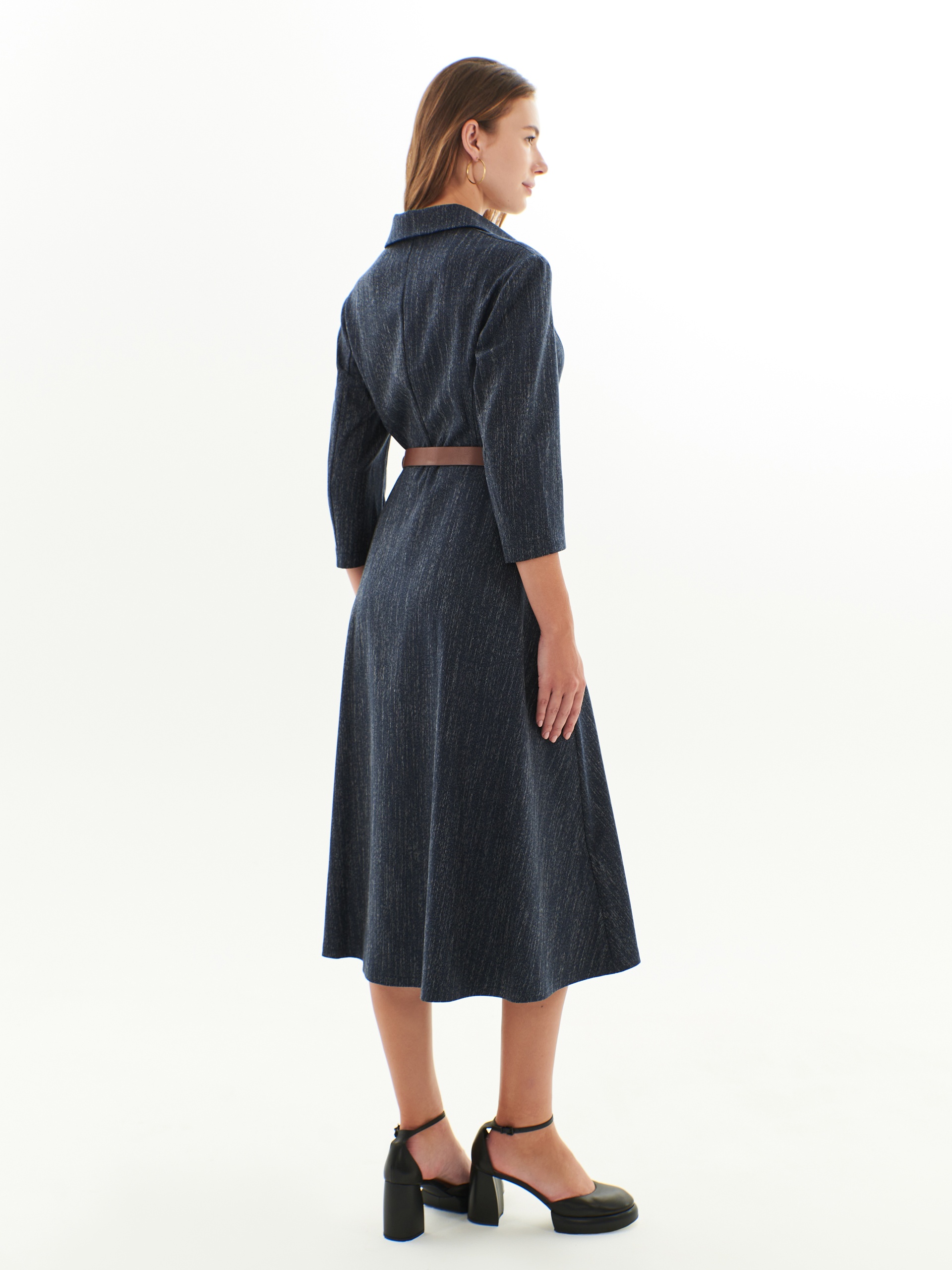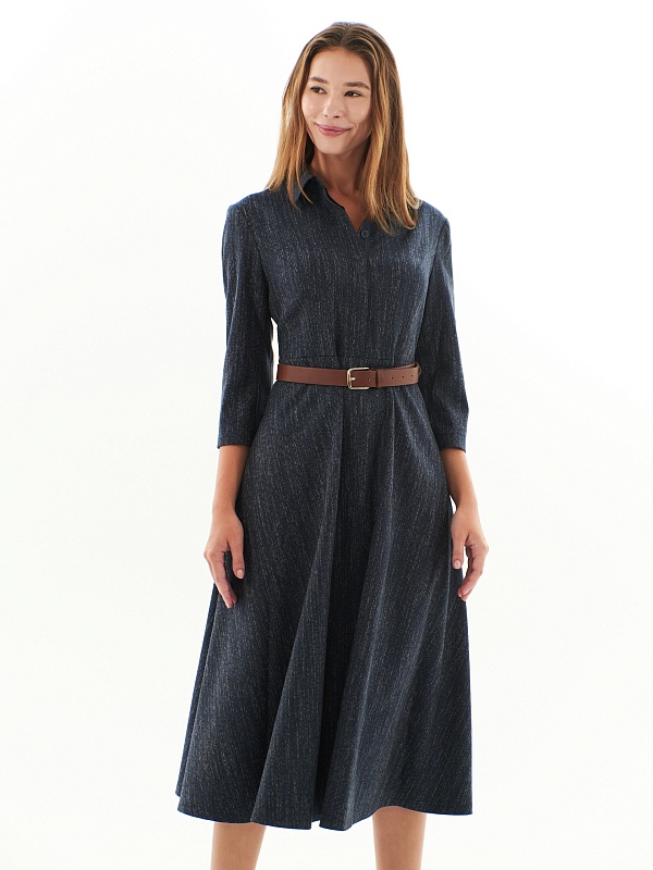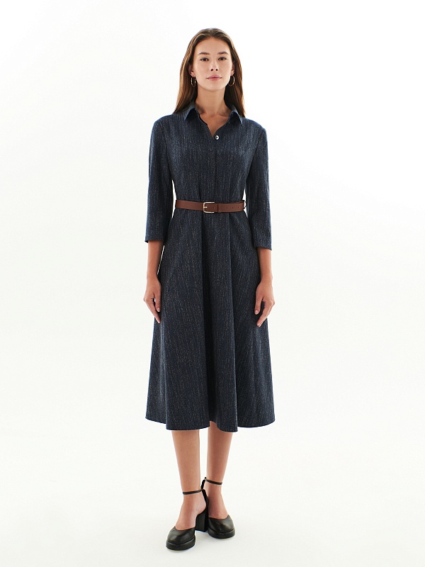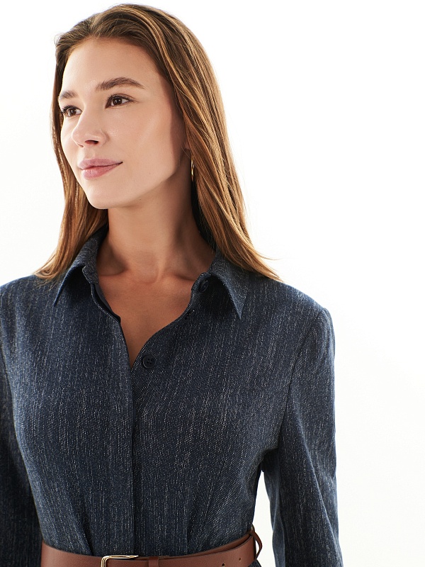 Приталенное платье из костюмной ткани с имитацией джинсы в глубоком синем цвете. Платье отрезное по талии и супатной застежкой на пуговицы. Юбка платья с расширением к низу. Рукав прямой длиной за локоть. В комплект входит ремень из экокожи.