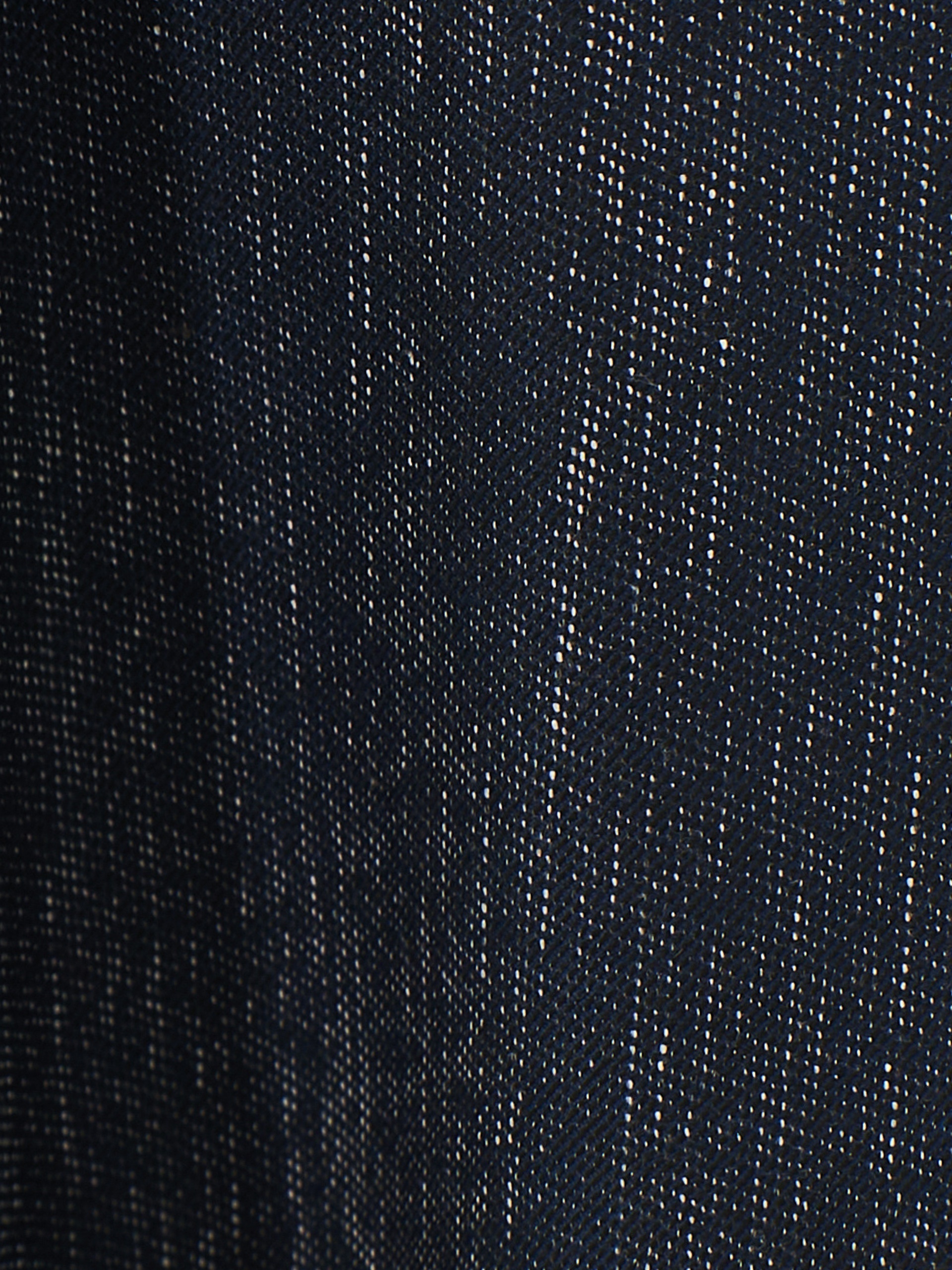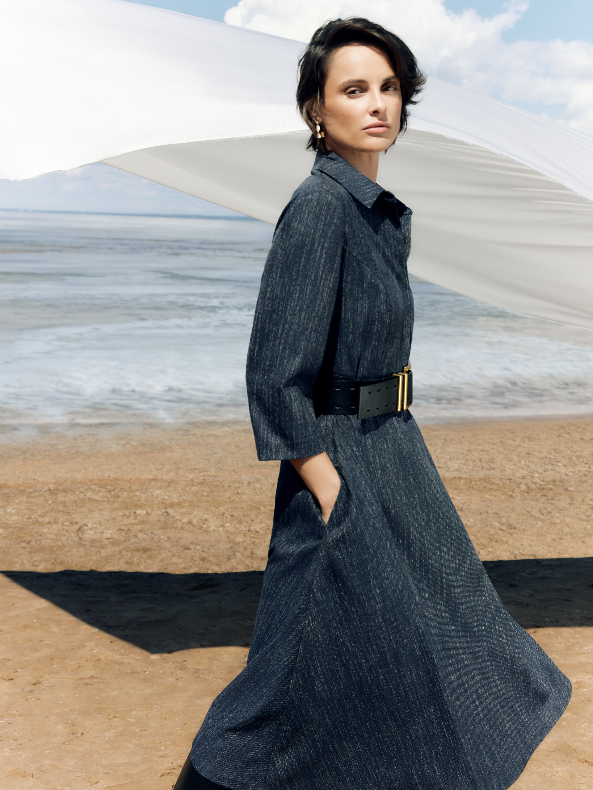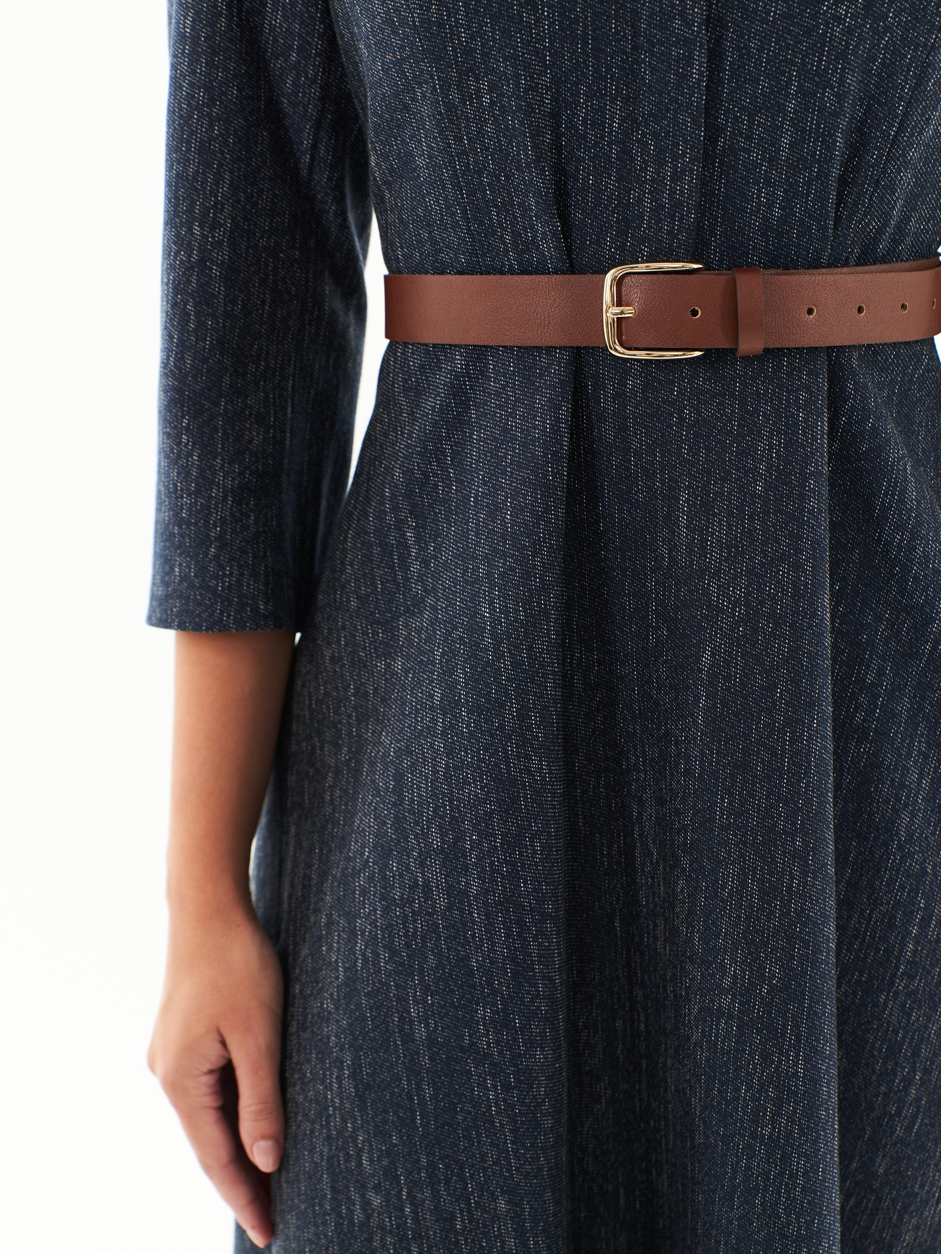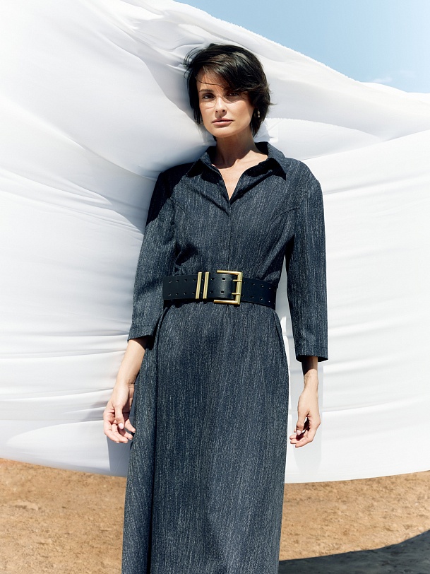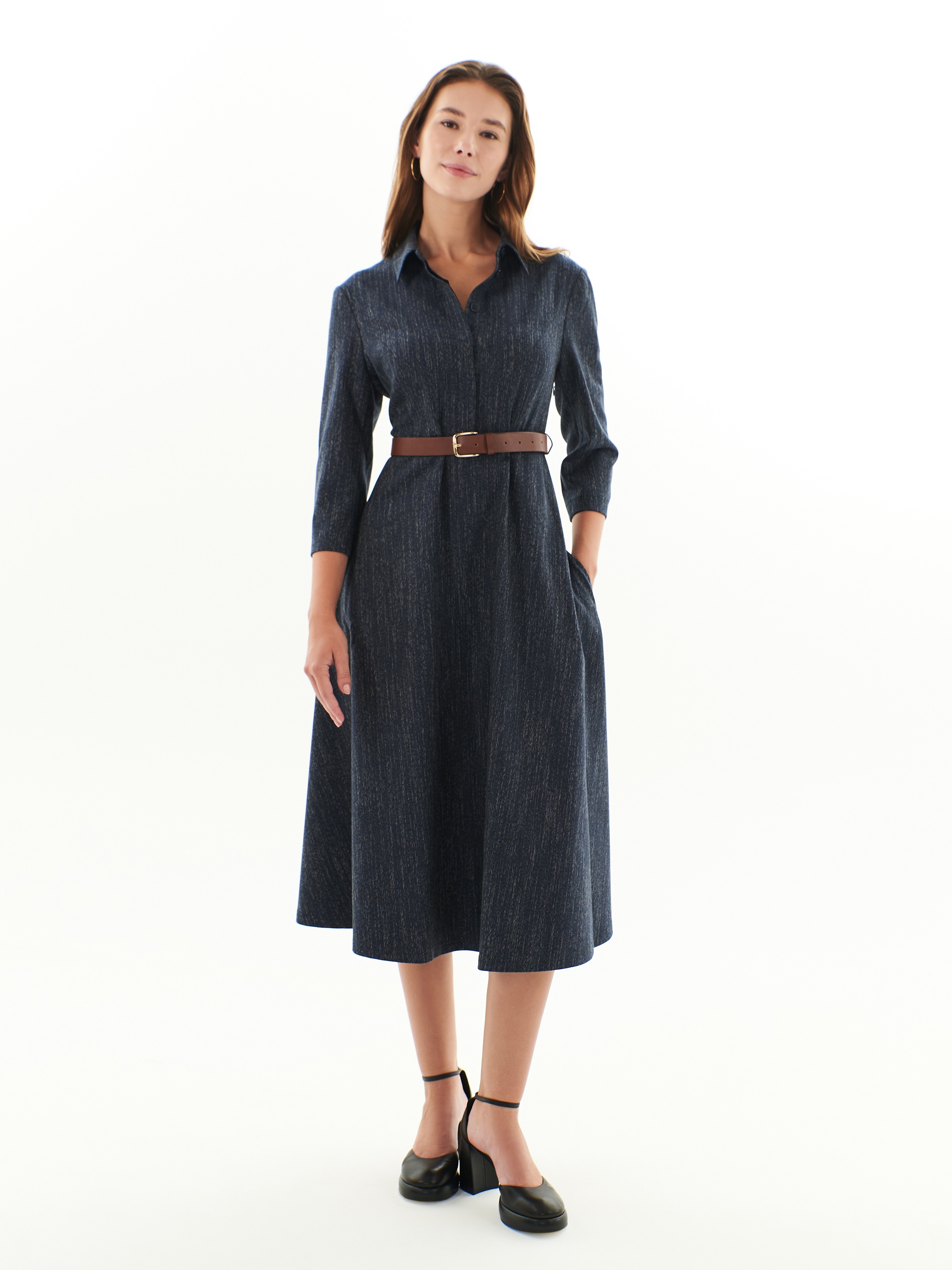 Приталенное платье из костюмной ткани с имитацией джинсы в глубоком синем цвете. Платье отрезное по талии и супатной застежкой на пуговицы. Юбка платья с расширением к низу. Рукав прямой длиной за локоть. В комплект входит ремень из экокожи.