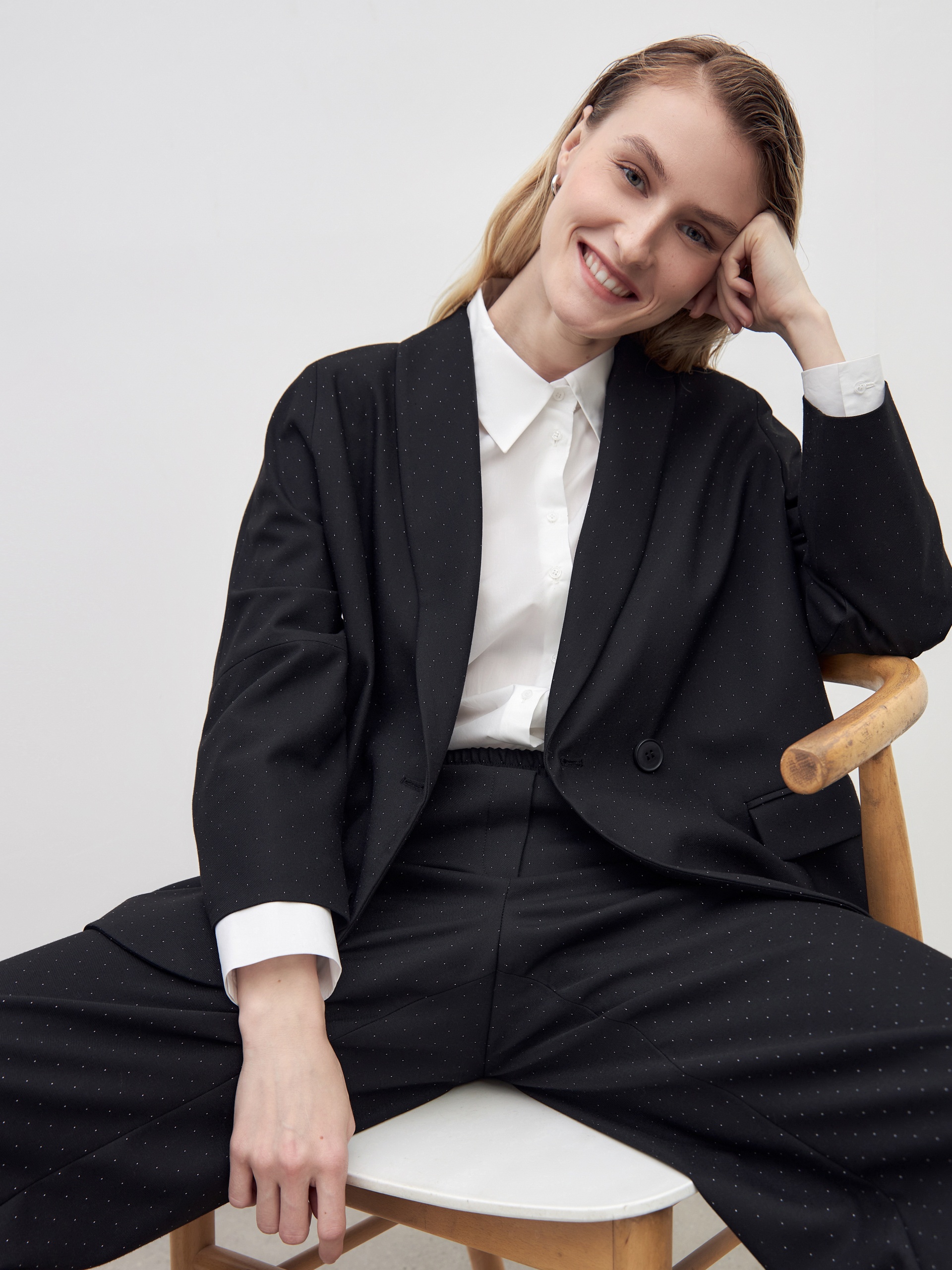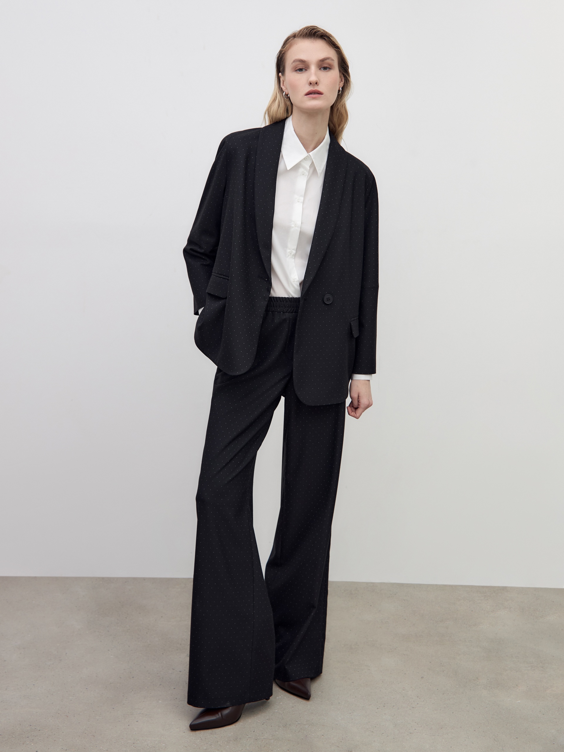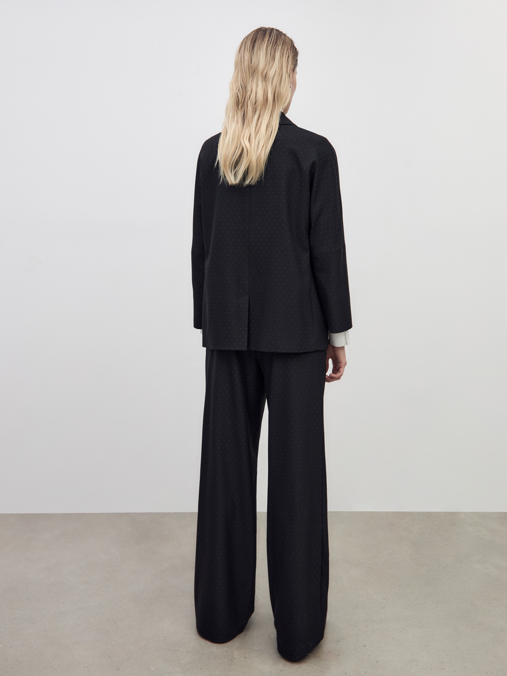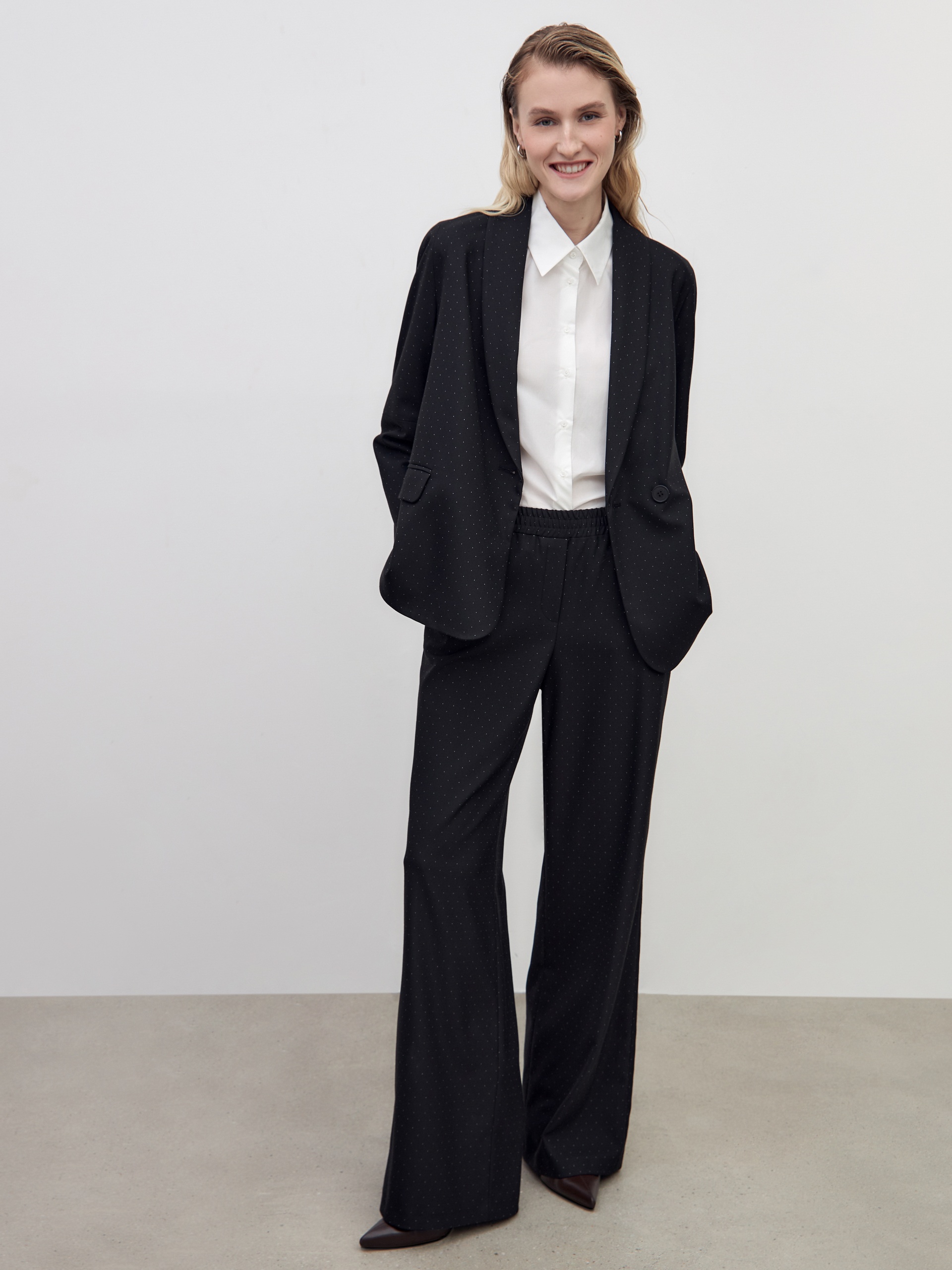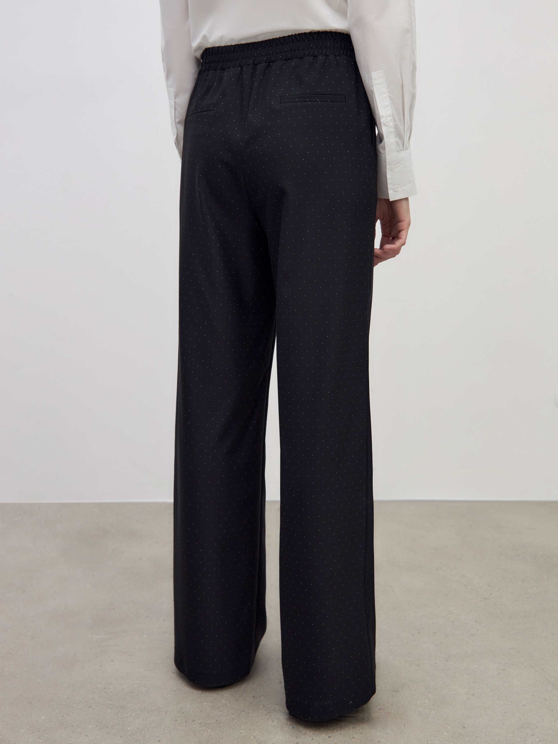 Свободные прямые брюки из мягкой костюмной ткани в черном цвете с белами точками. Пояс на резинке позволяет чувствовать себя комфортно и расслабленно. Брюки имеют два функциональных кармана по бокам и два прорезных кармана сзади. Брюки в комплекте с жакетом из этой же ткани идеально сочетаются между собой и помогут создать модный аутфит.