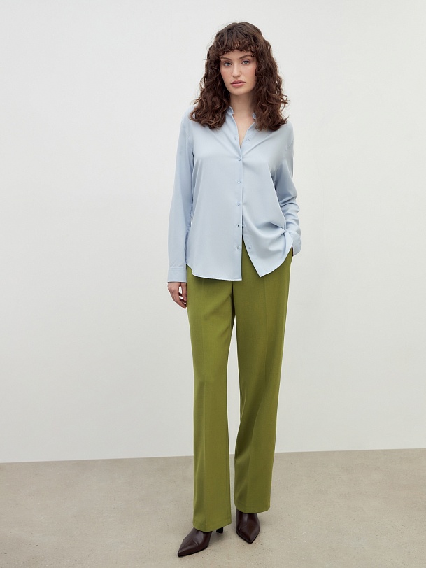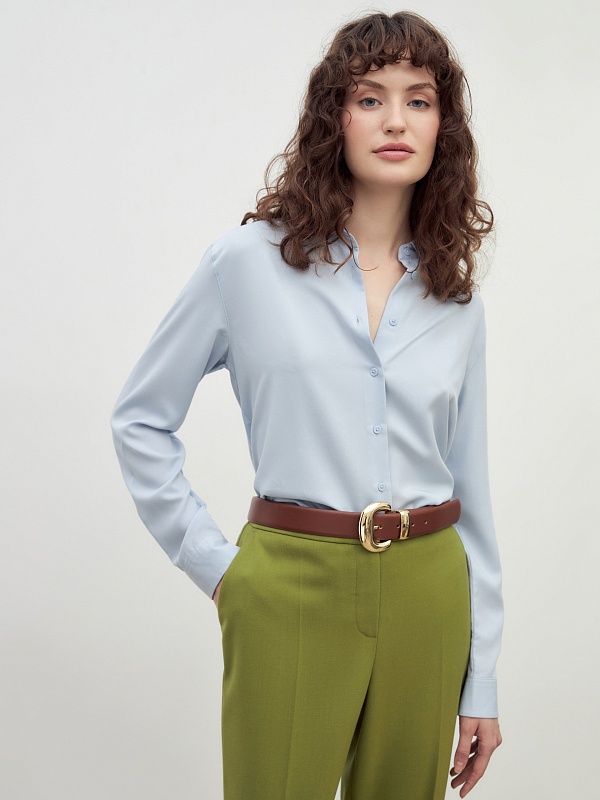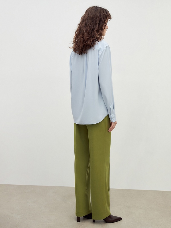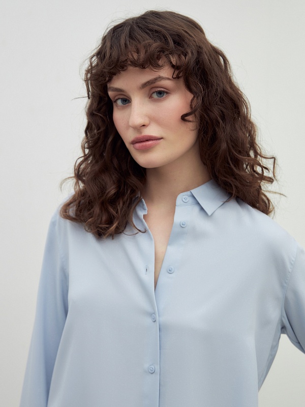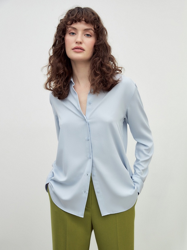 Свободная блуза из вискозной ткани нежно-голубого цвета с отложным воротником и переведённым плечевым швом. Рукав классической формы с небольшим манжетом на одну пуговицу. На спинке кокетка со складкой.
