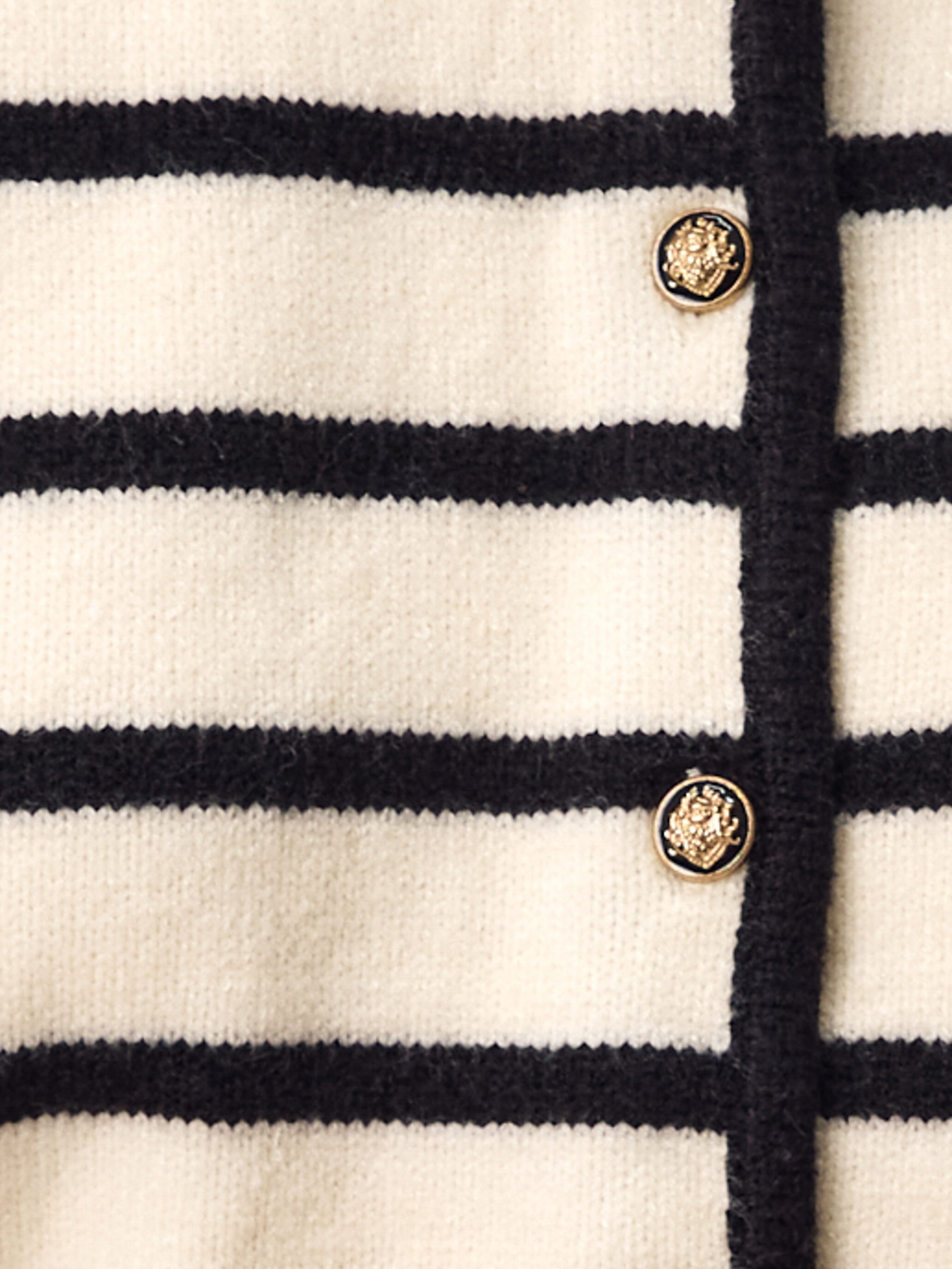 Вязаный жакет в классическом стиле из очень мягкой пряжи. Круглый вырез горловины, золотистые пуговицы и стильные чёрные полоски на молочном фоне. Он идеально сидит по фигуре и является отличным способом добавить образу элегантности. Жакет идеально подходит для сочетания с блузами, рубашками и даже платьями из нашей осенней коллекции.