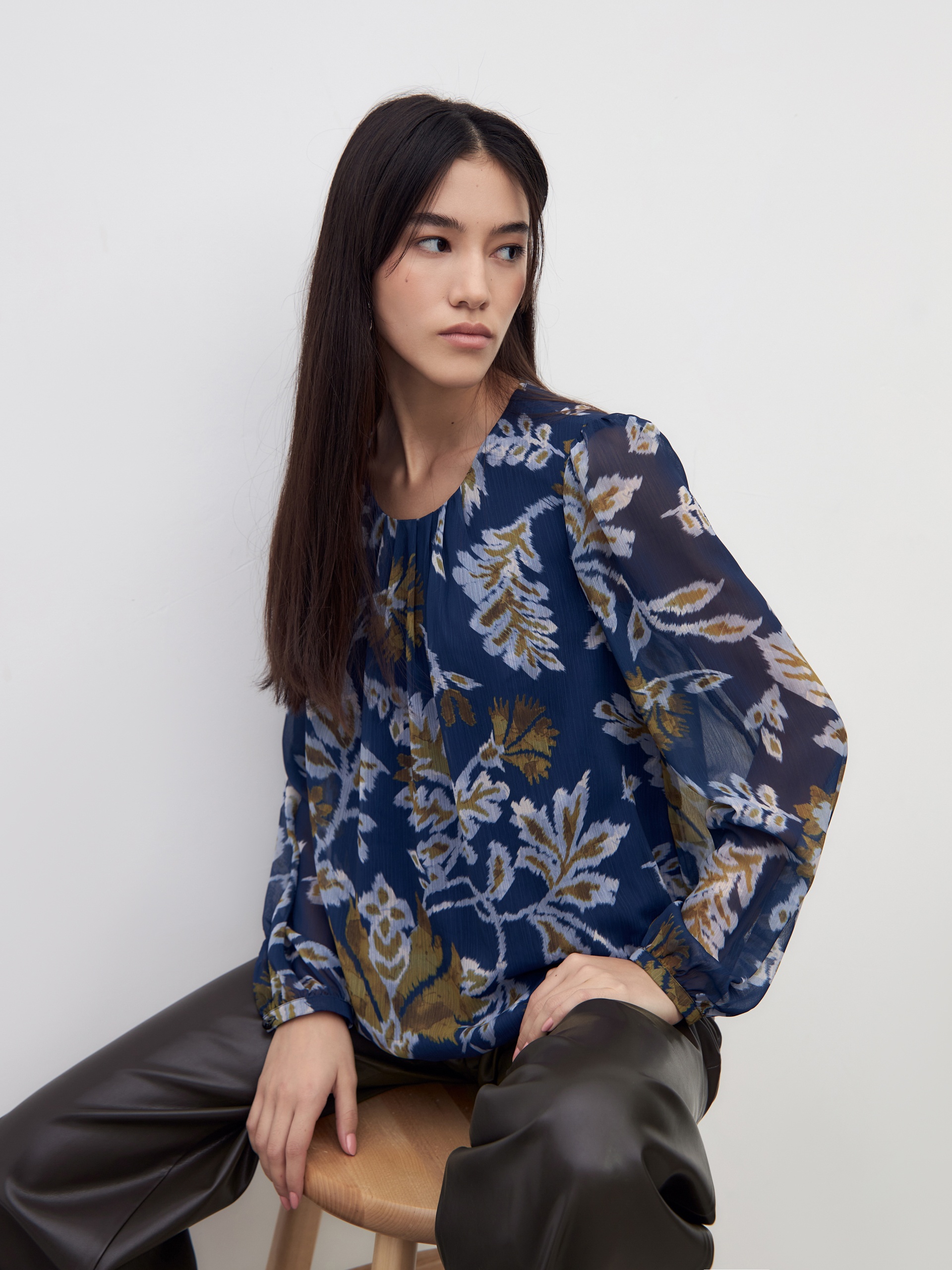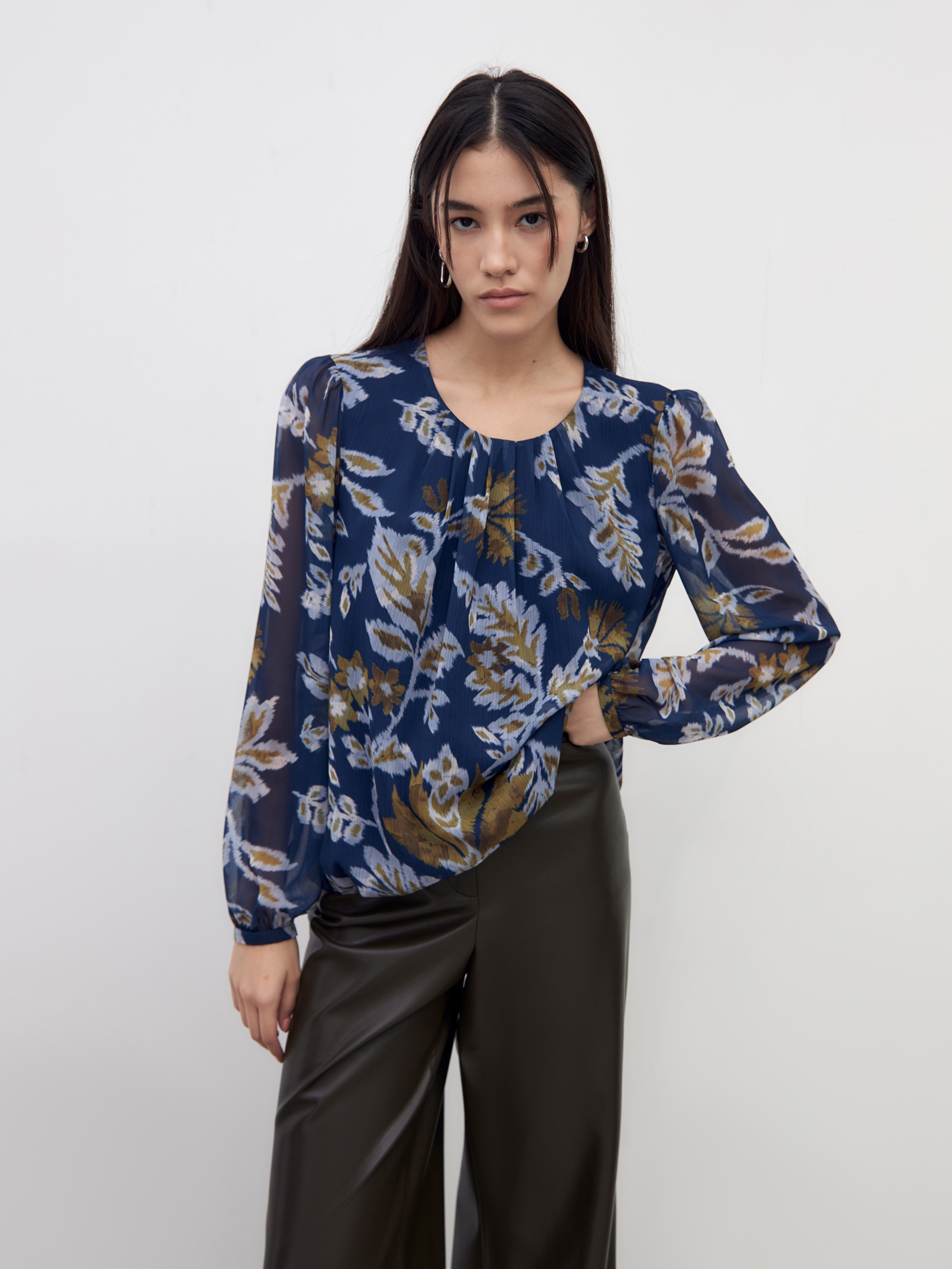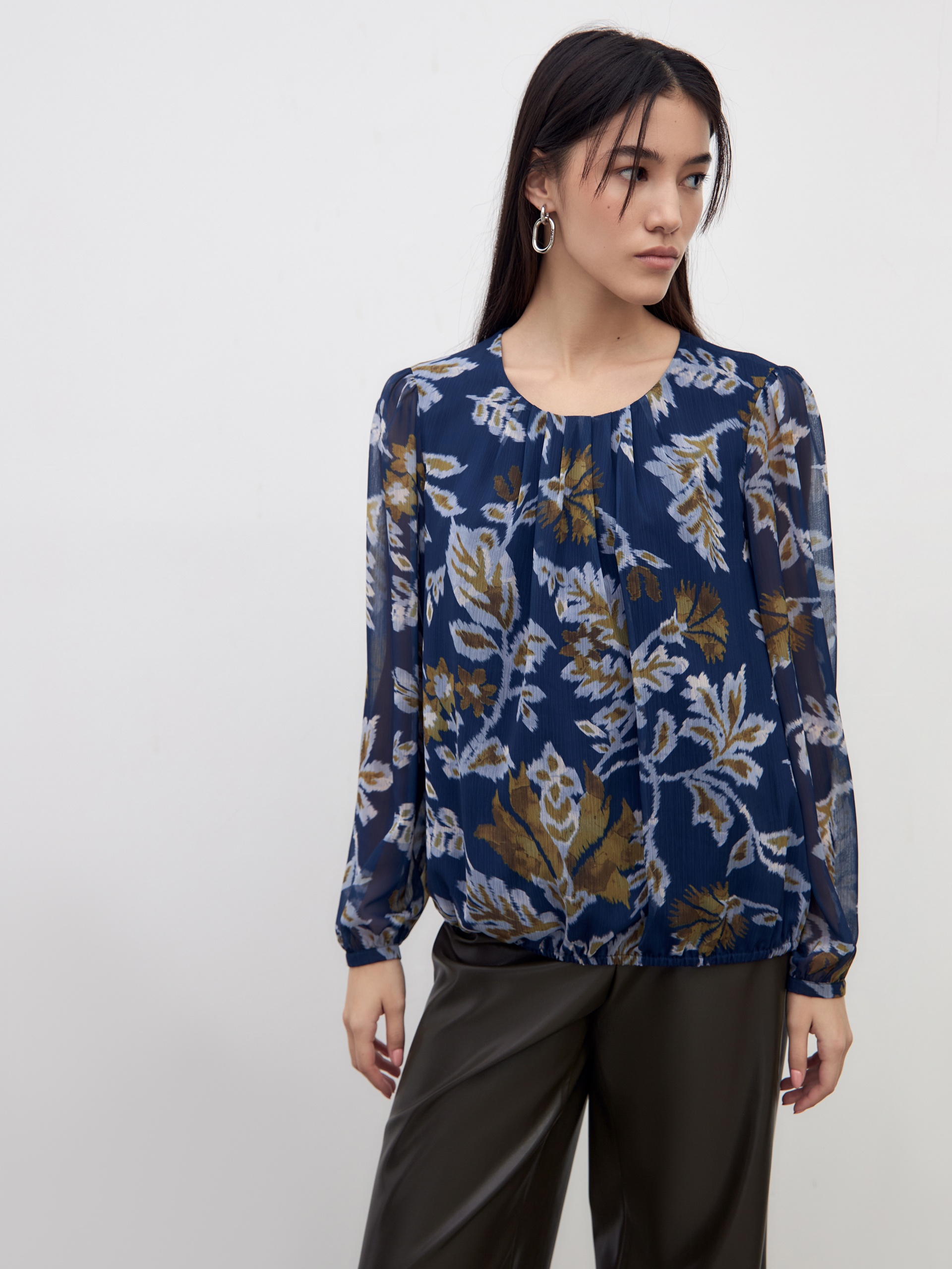 Романтичная блуза свободного силуэта на резинке по низу, с круглой горловиной со складками. Втачной рукав с небольшим манжетом со сборкой. Блуза выполнена из принтованого шифона.