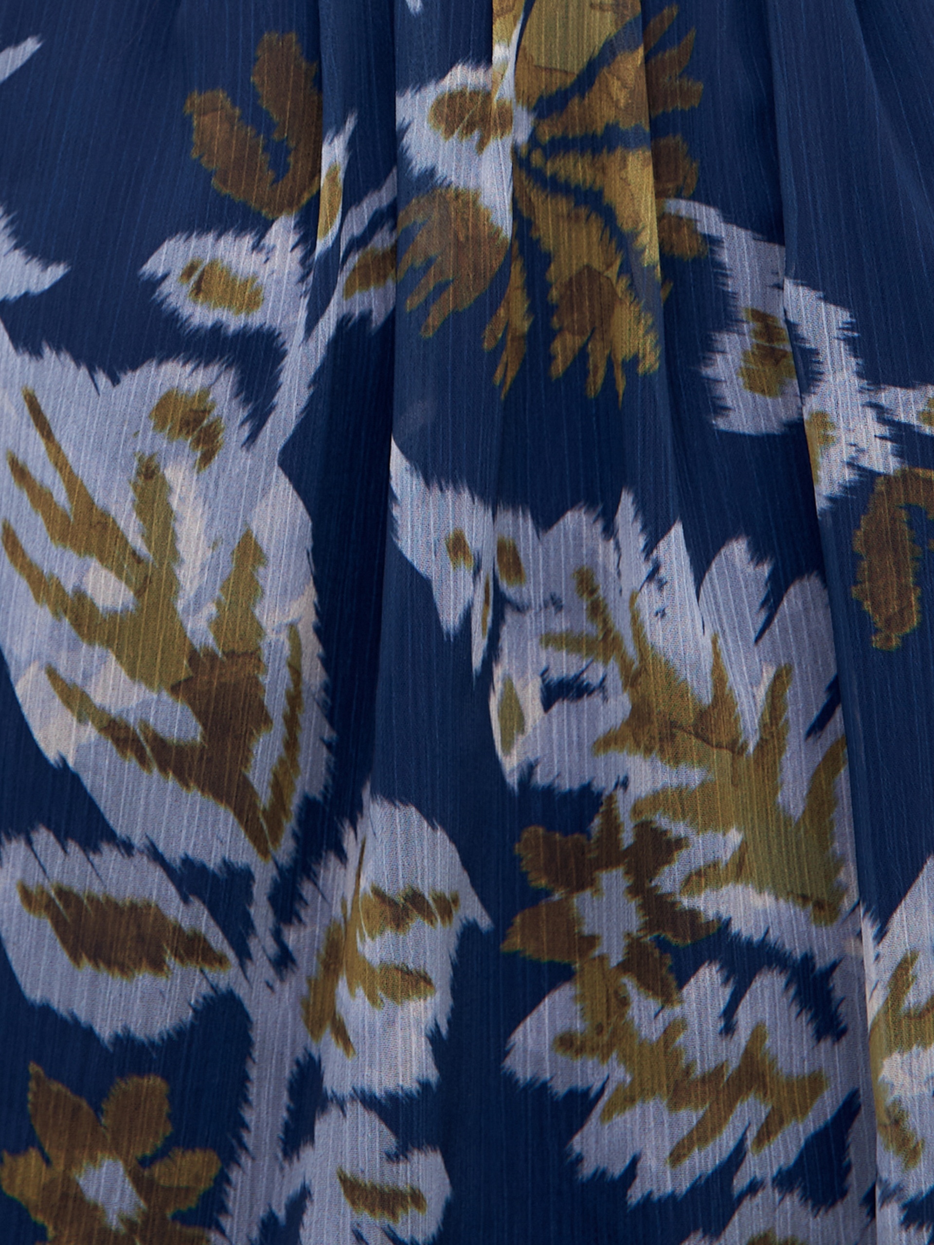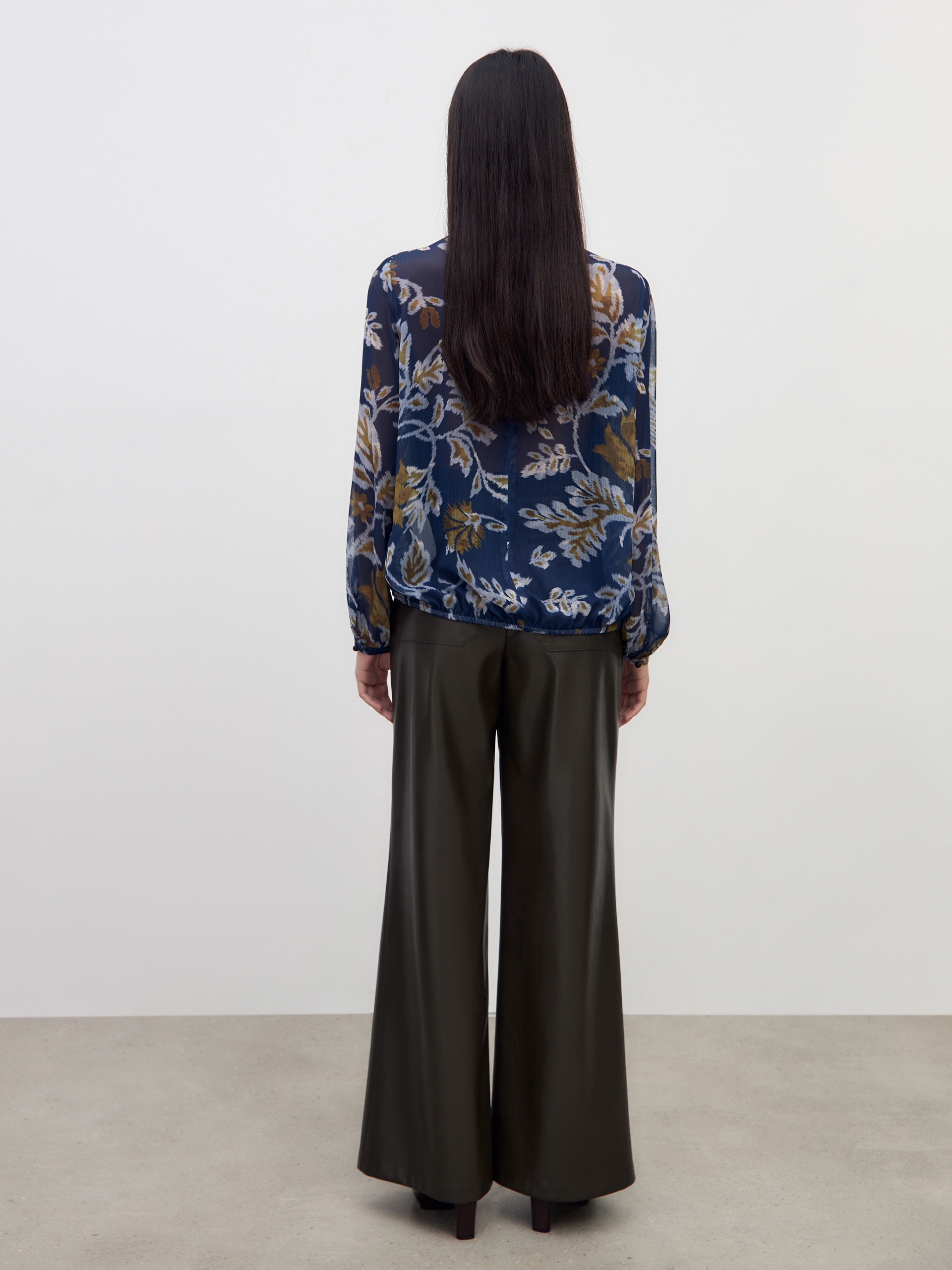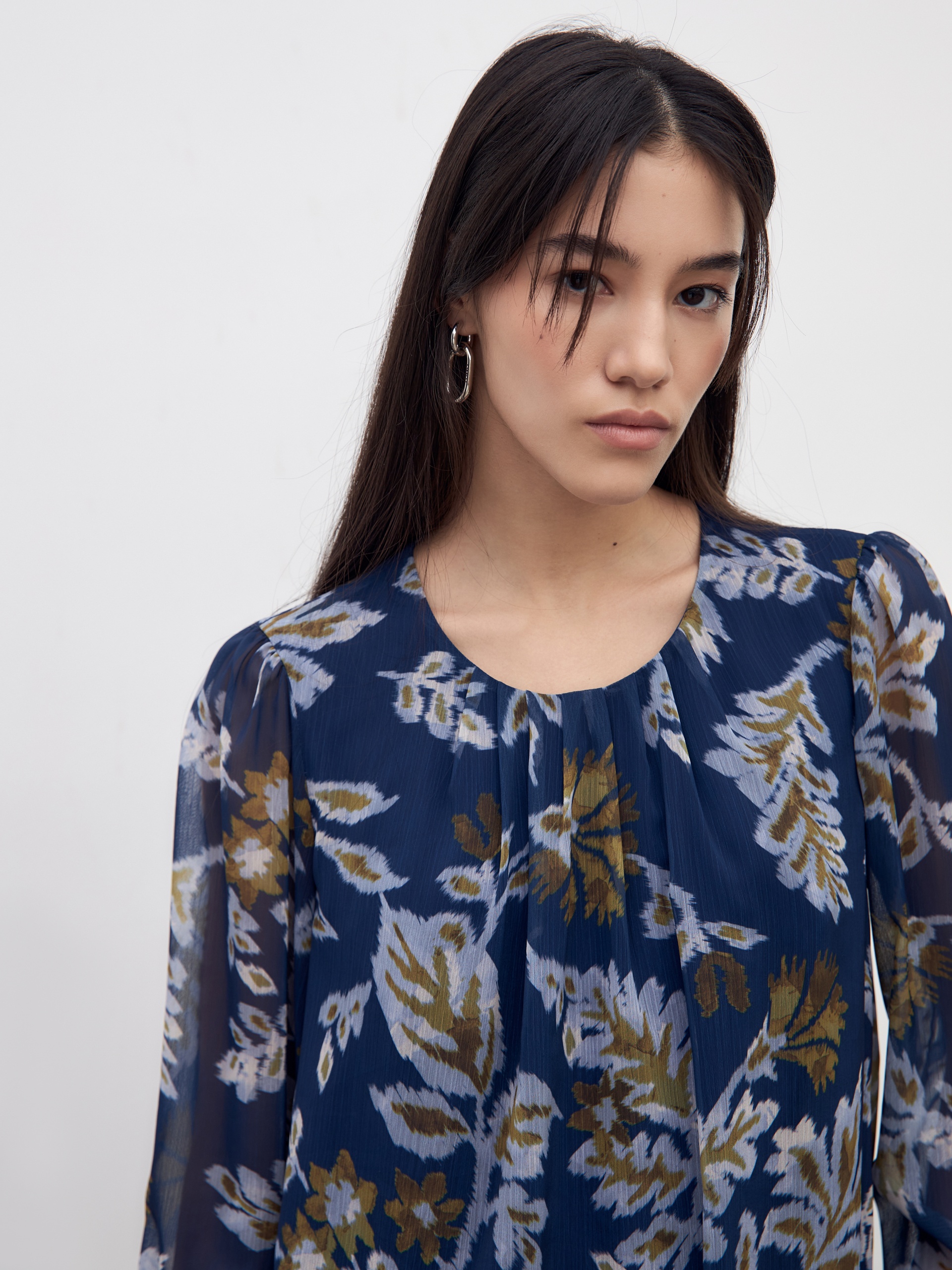 Романтичная блуза свободного силуэта на резинке по низу, с круглой горловиной со складками. Втачной рукав с небольшим манжетом со сборкой. Блуза выполнена из принтованого шифона.