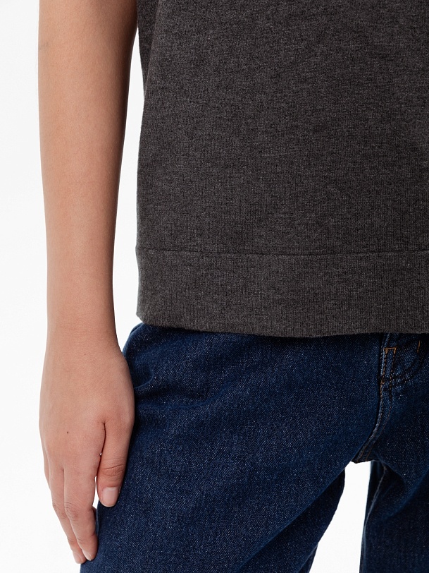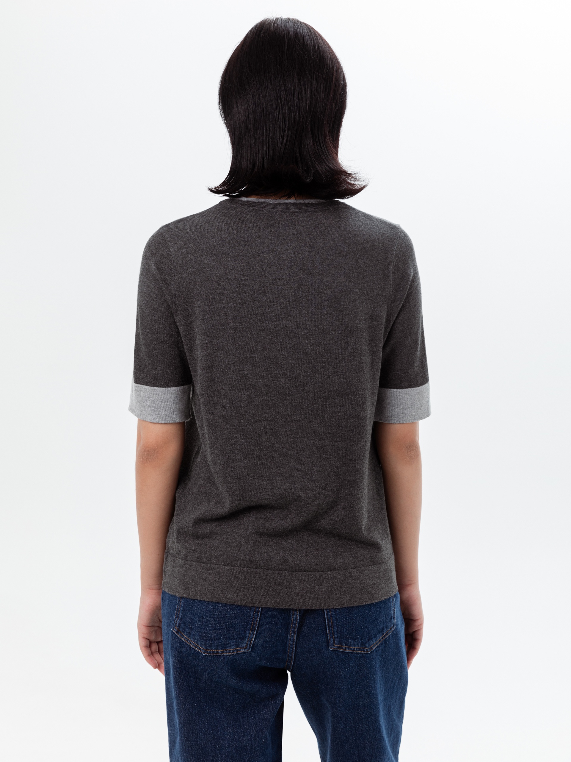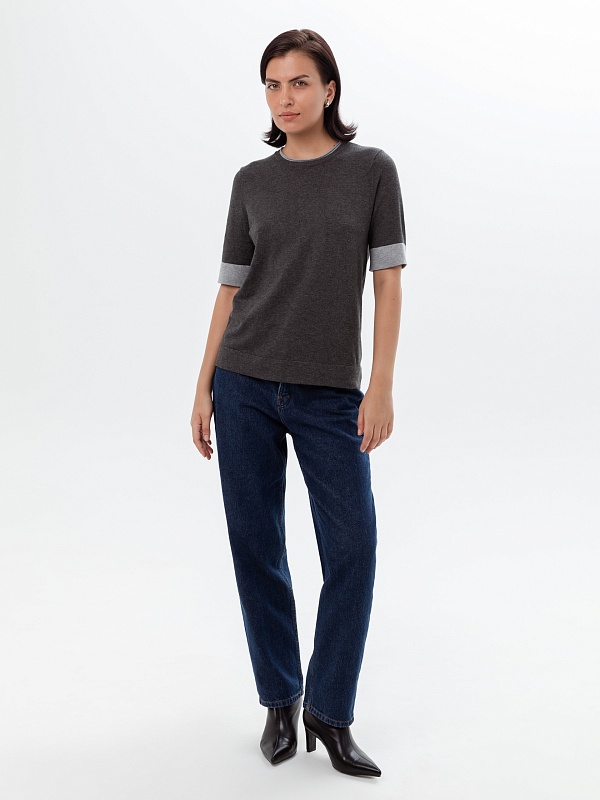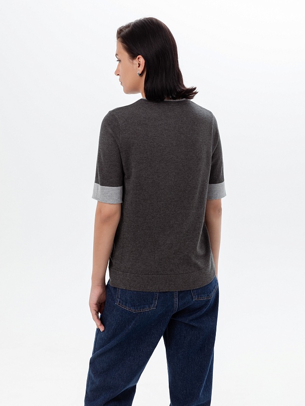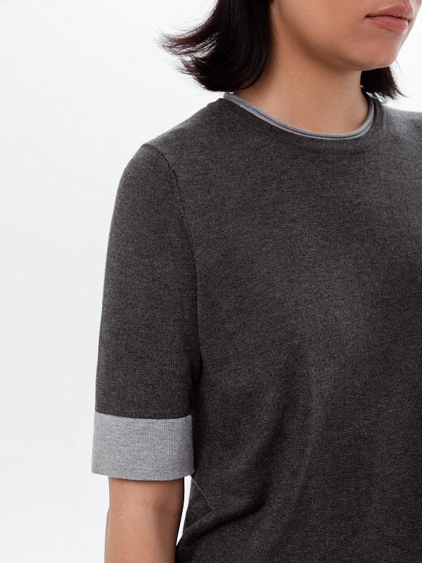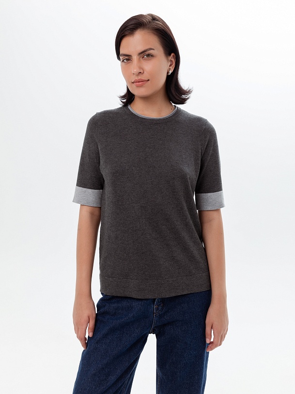 Джемпер с коротким рукавом связан в сдержанном сером меланже с более светлой серой отделкой по рукавам и горловине, который будет удобно носить как с жакетами, так и самостоятельно.