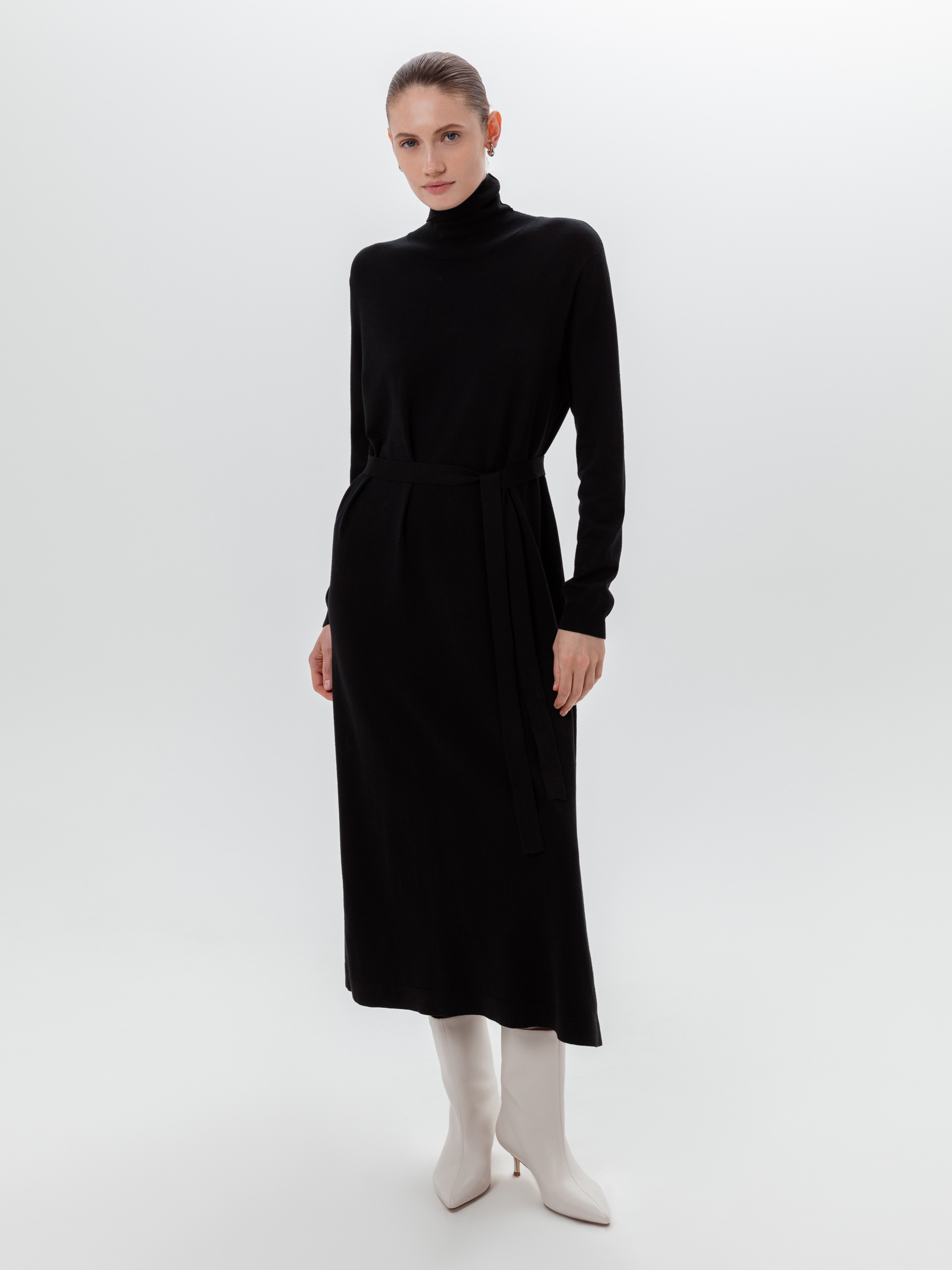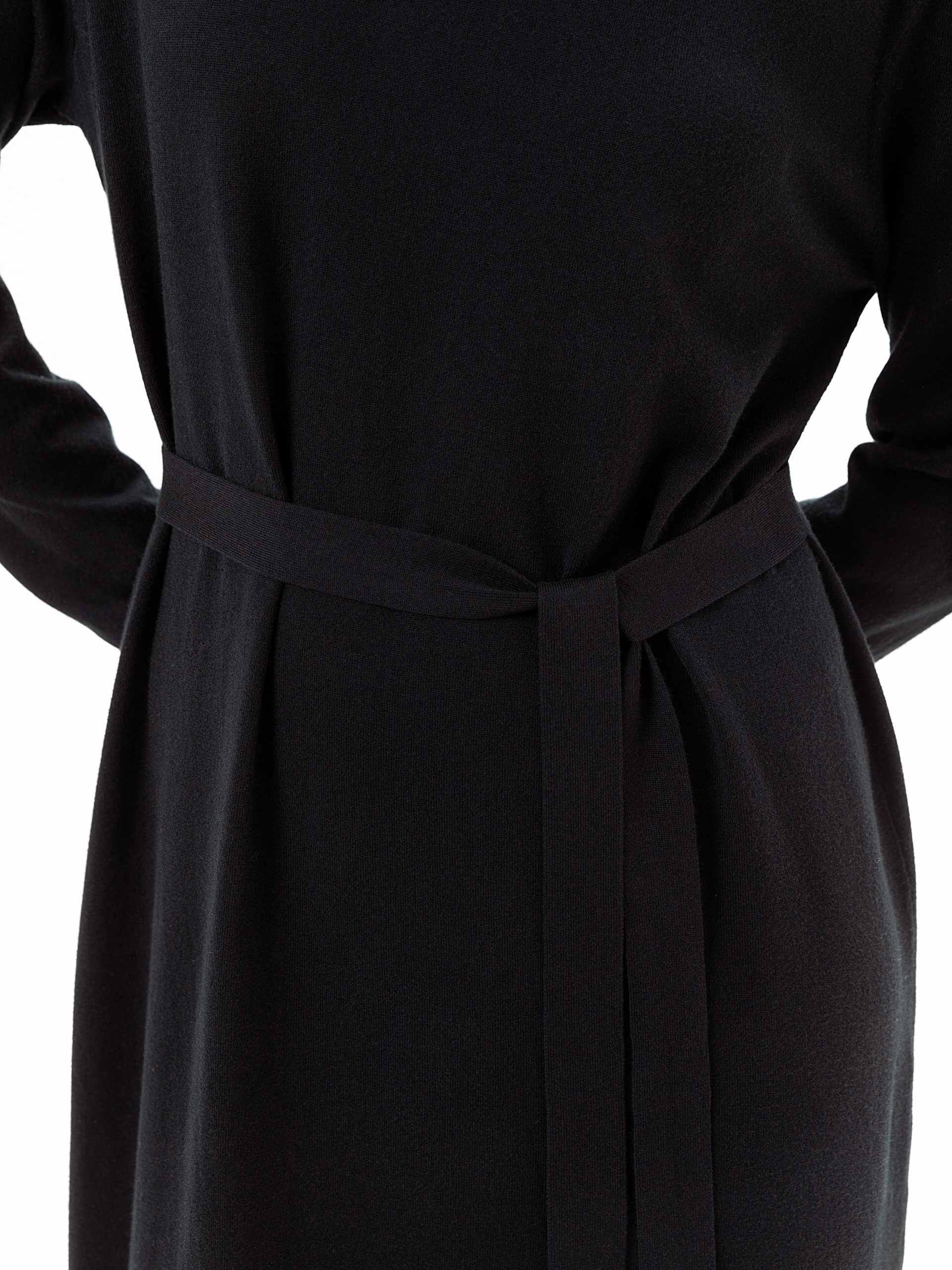 Базовое вязаное платье свободного силуэта для повседневного образа. В комплекте идет пояс из основной пряжи.