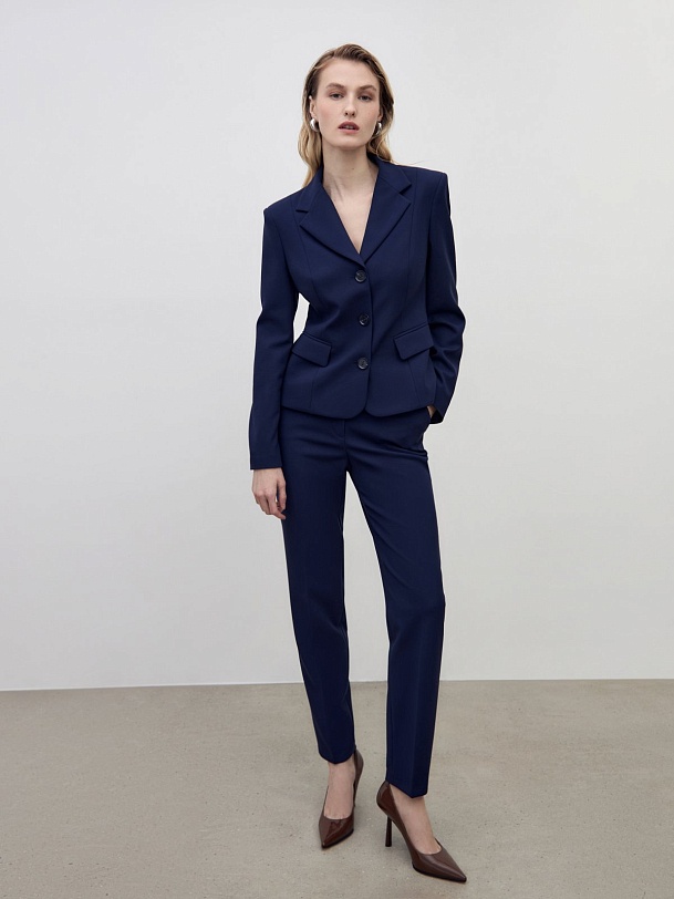 Брюки со стрелками из костюмной ткани зауженного к низу силуэта на притачном поясе со шлевками. Спереди боковые карманы и застежка на молнию и крючок. Эта модель идеально сочетается с жакетом из этой же ткани.