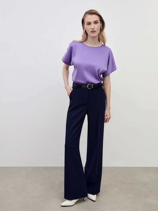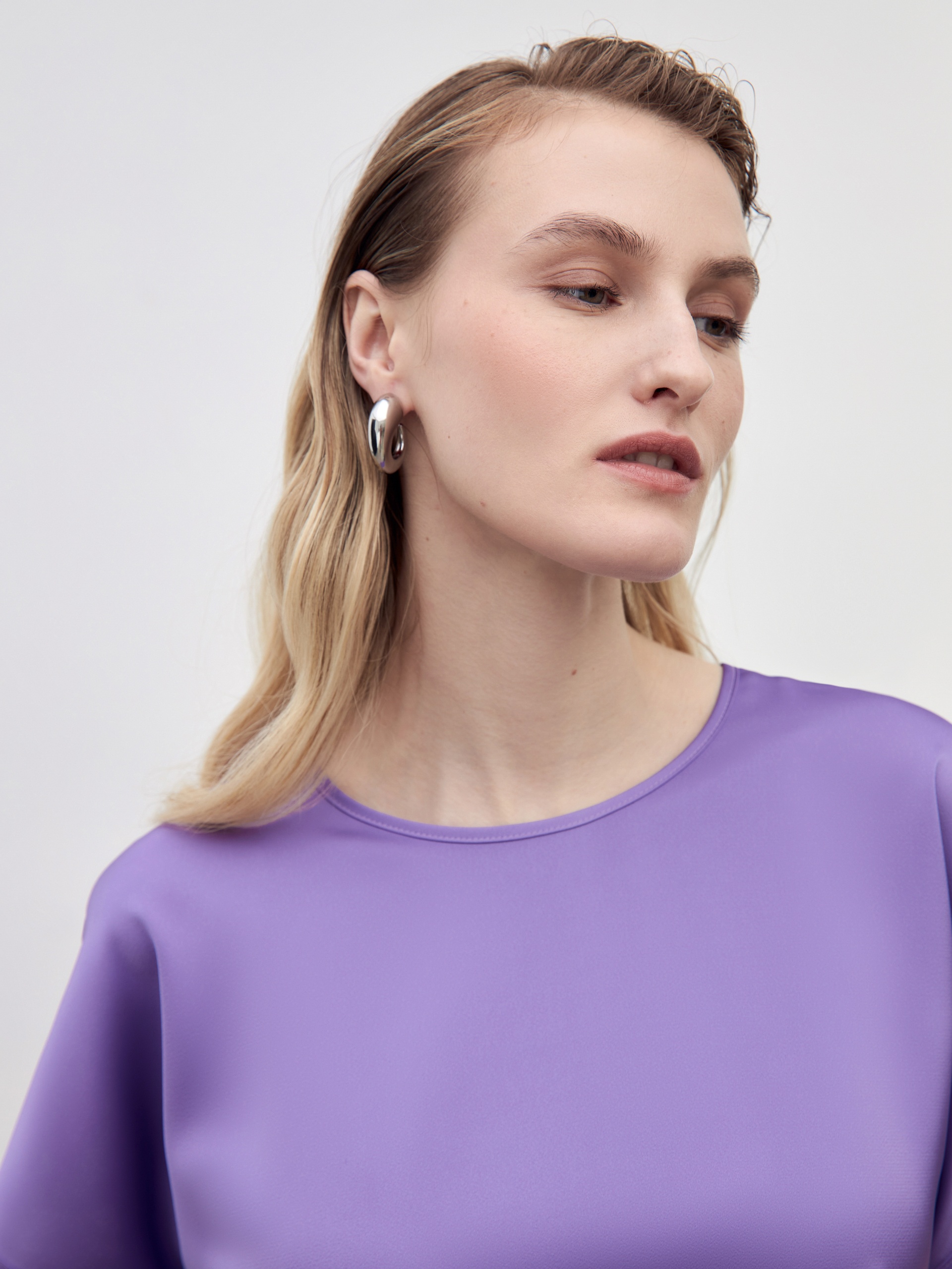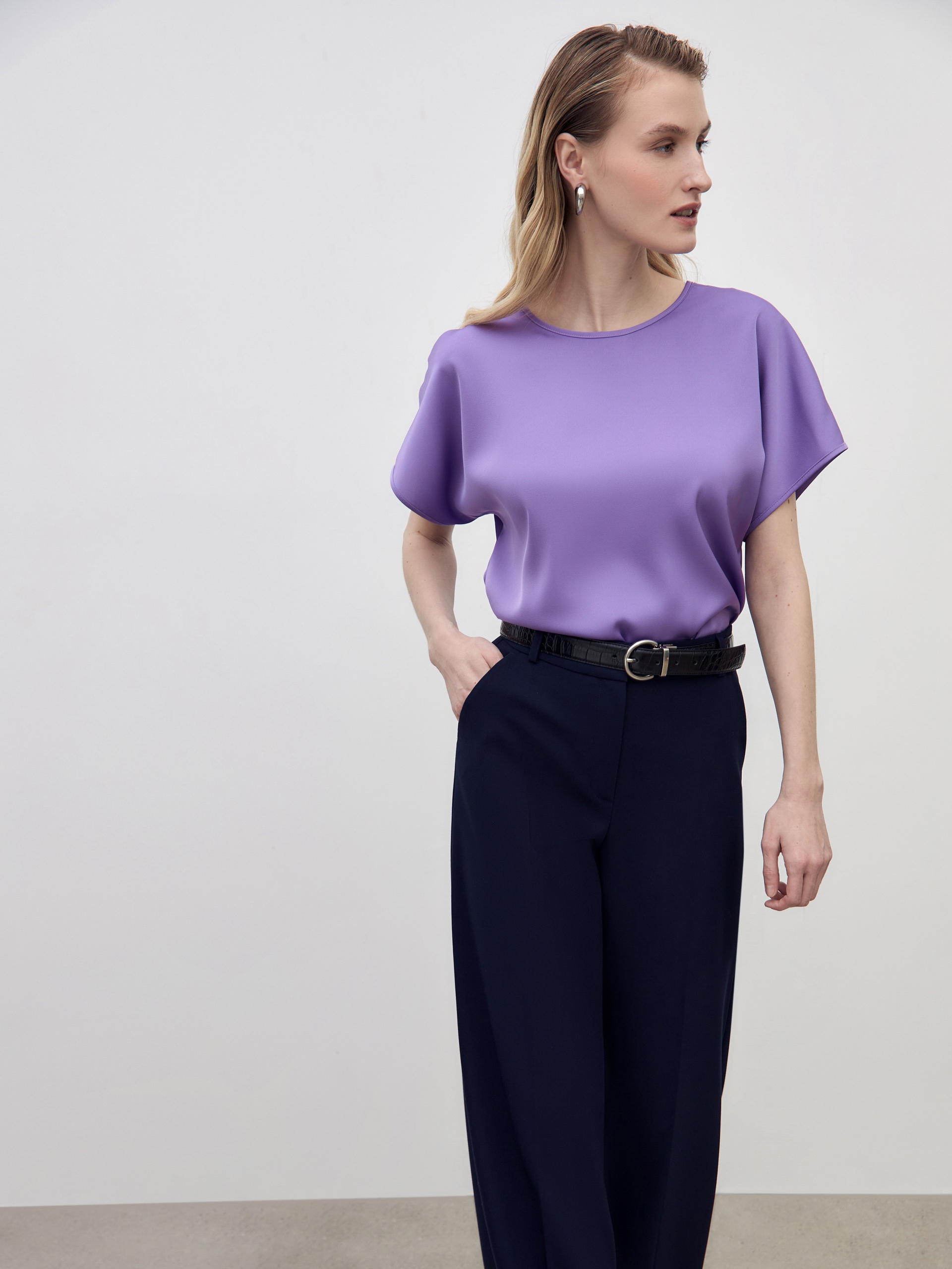 Классическая прямая блуза из блузочной ткани в нежно сиреневом цвете с горловиной лодочкой.