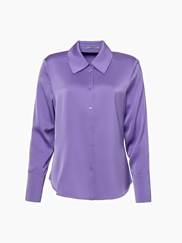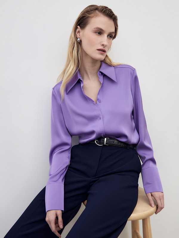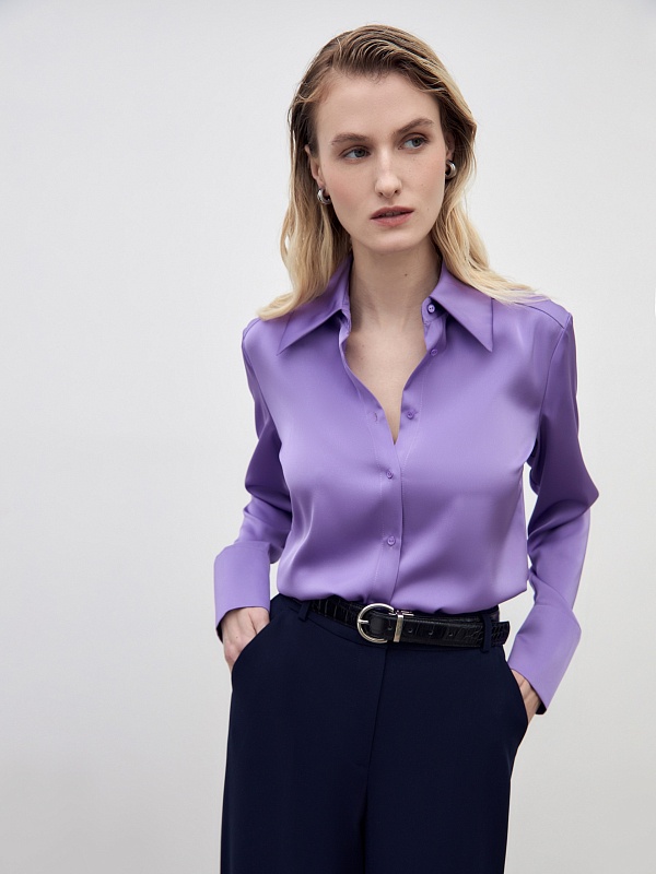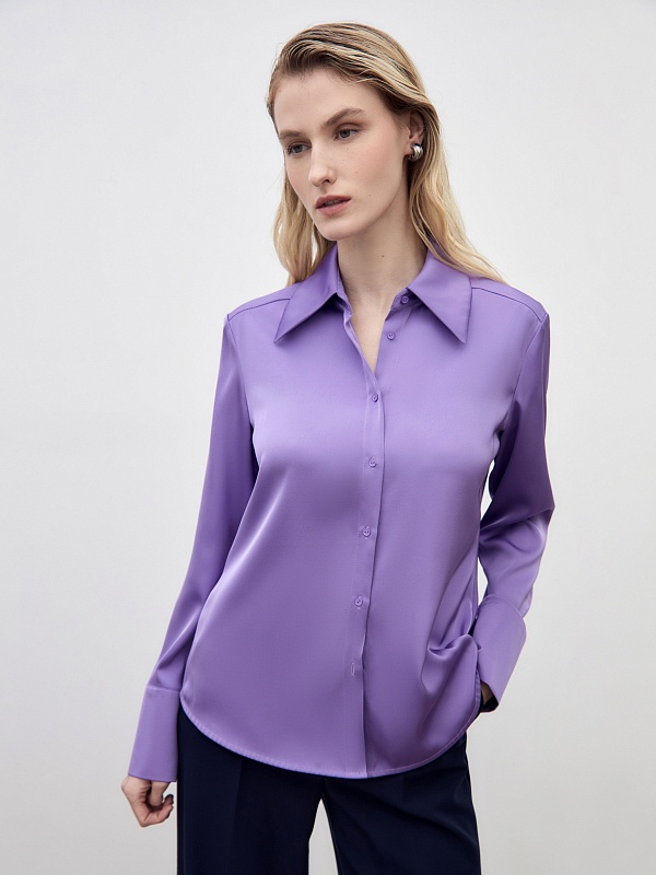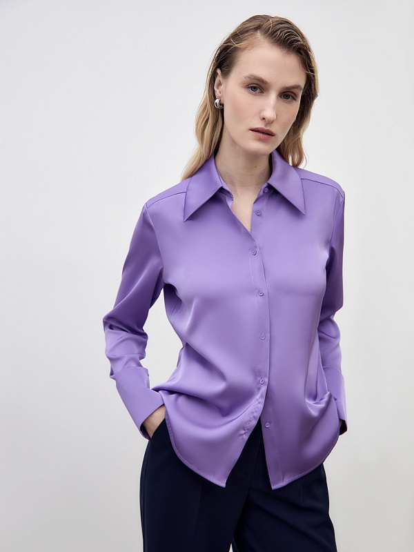 Приталенная блуза из плотной вискозной атласной ткани в нежном сиреневом цвете с трендовым острым воротником. Блуза с классическим рукавом и широким манжетом.