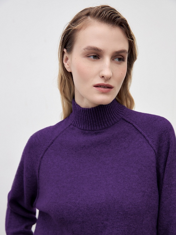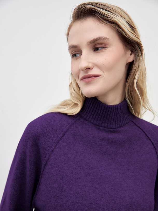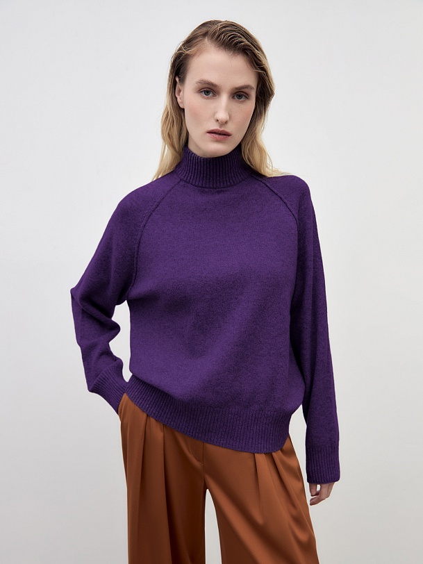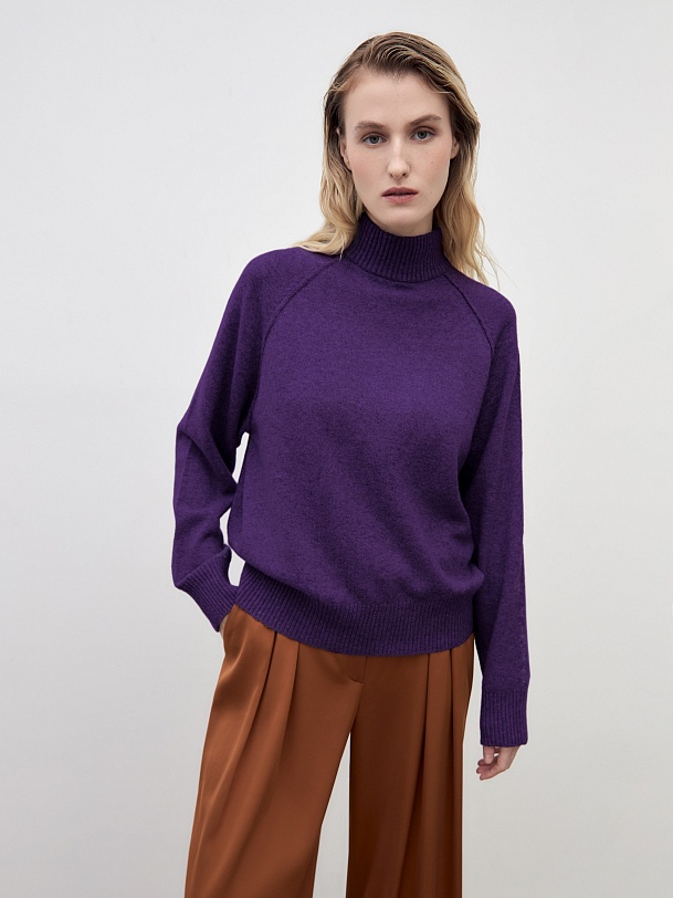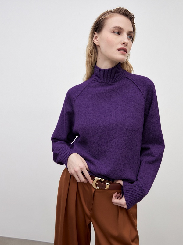 Уютный свитер свободного силуэта с рукавом-регланом и воротником стойкой. В смесовом составе пряжи есть волокна овечьей шерсти, что делает изделие более тёплым, шерсть не колется и не вызывает дискомфорта. Благодаря уникальной структуре овечьей шерсти она "дышит" - между волокнами располагаются особые воздушные полости, внутри которых циркулирует воздух, он помогает выводить лишнее тепло и влагу.